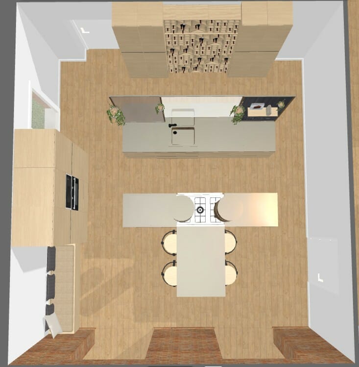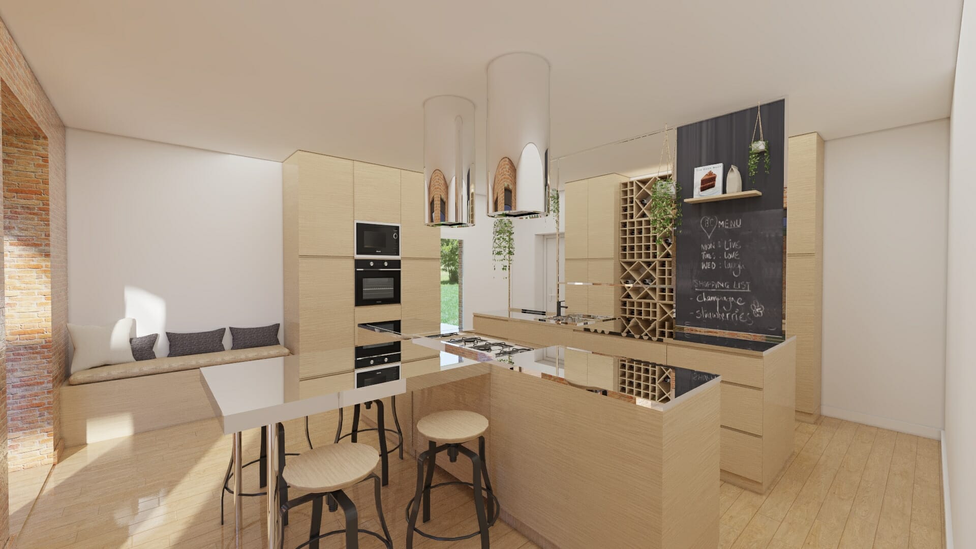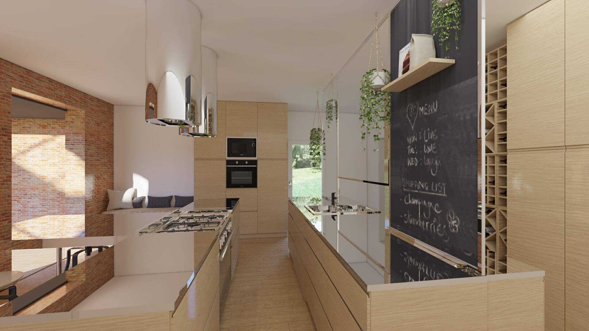 Objectif : Réorganiser les espaces fermés de la buanderie et de la cuisine. Organiser la cuisine en 3 espaces :