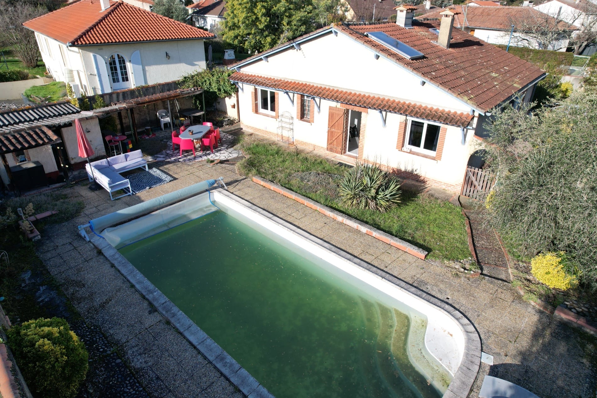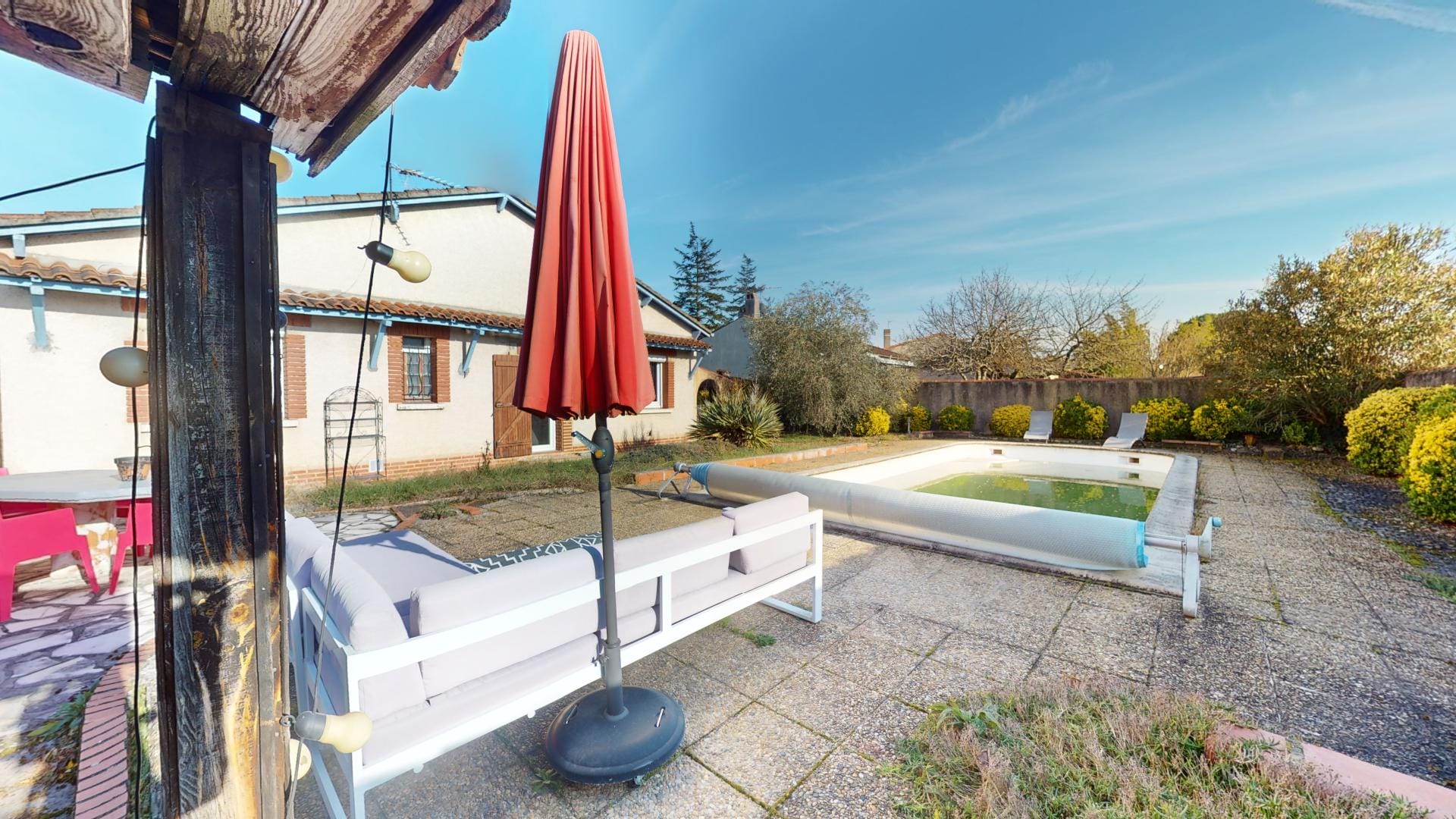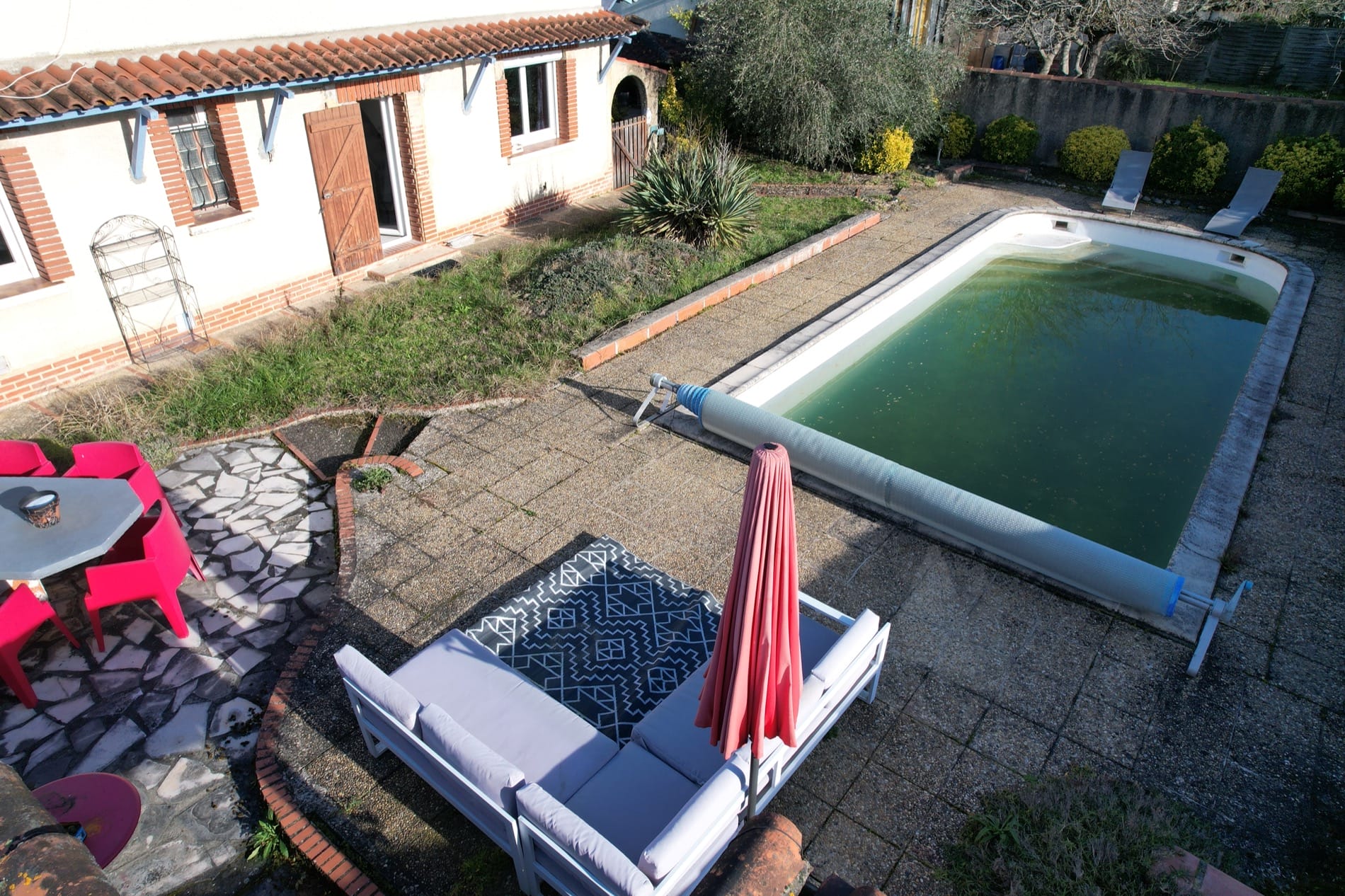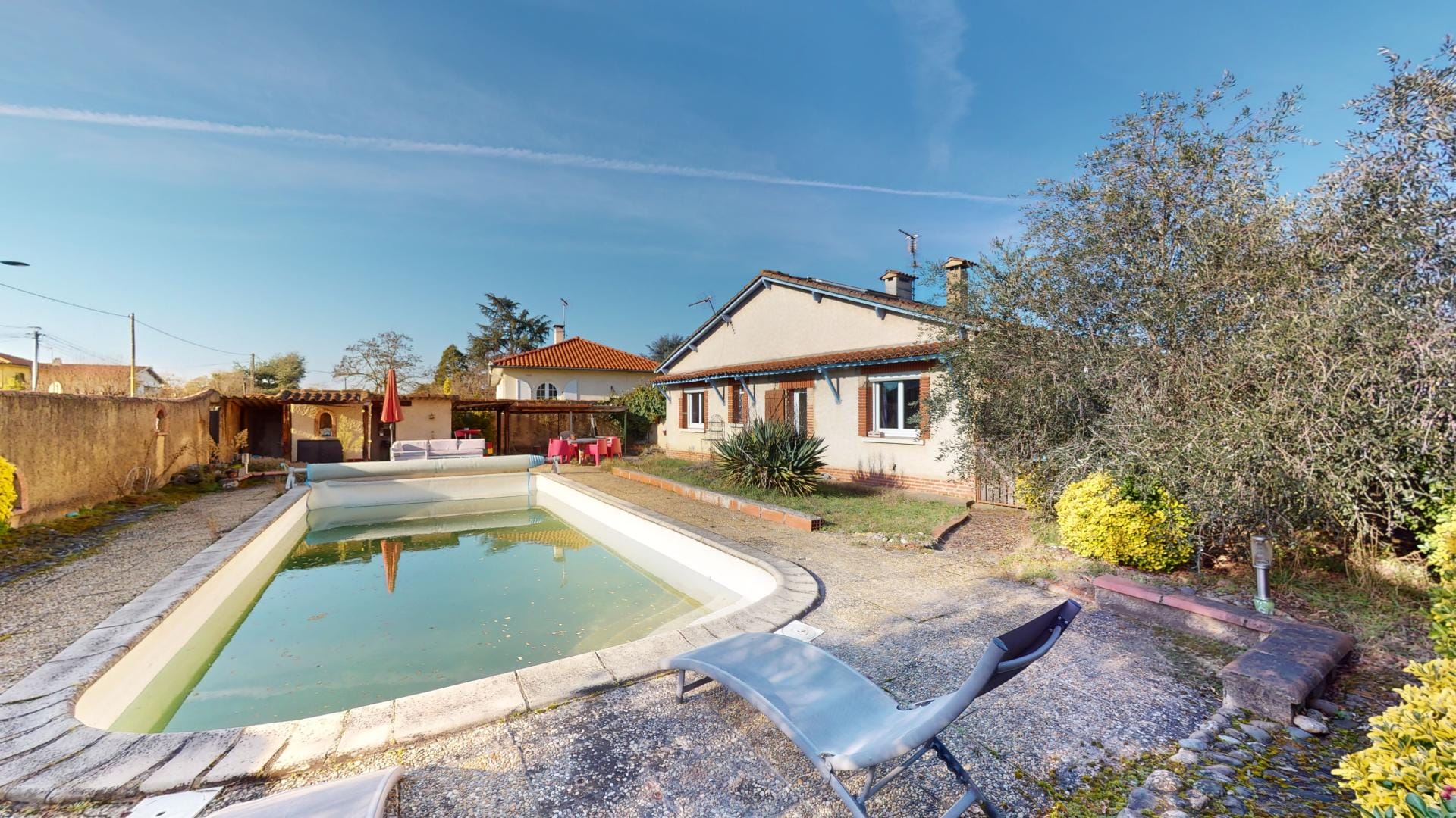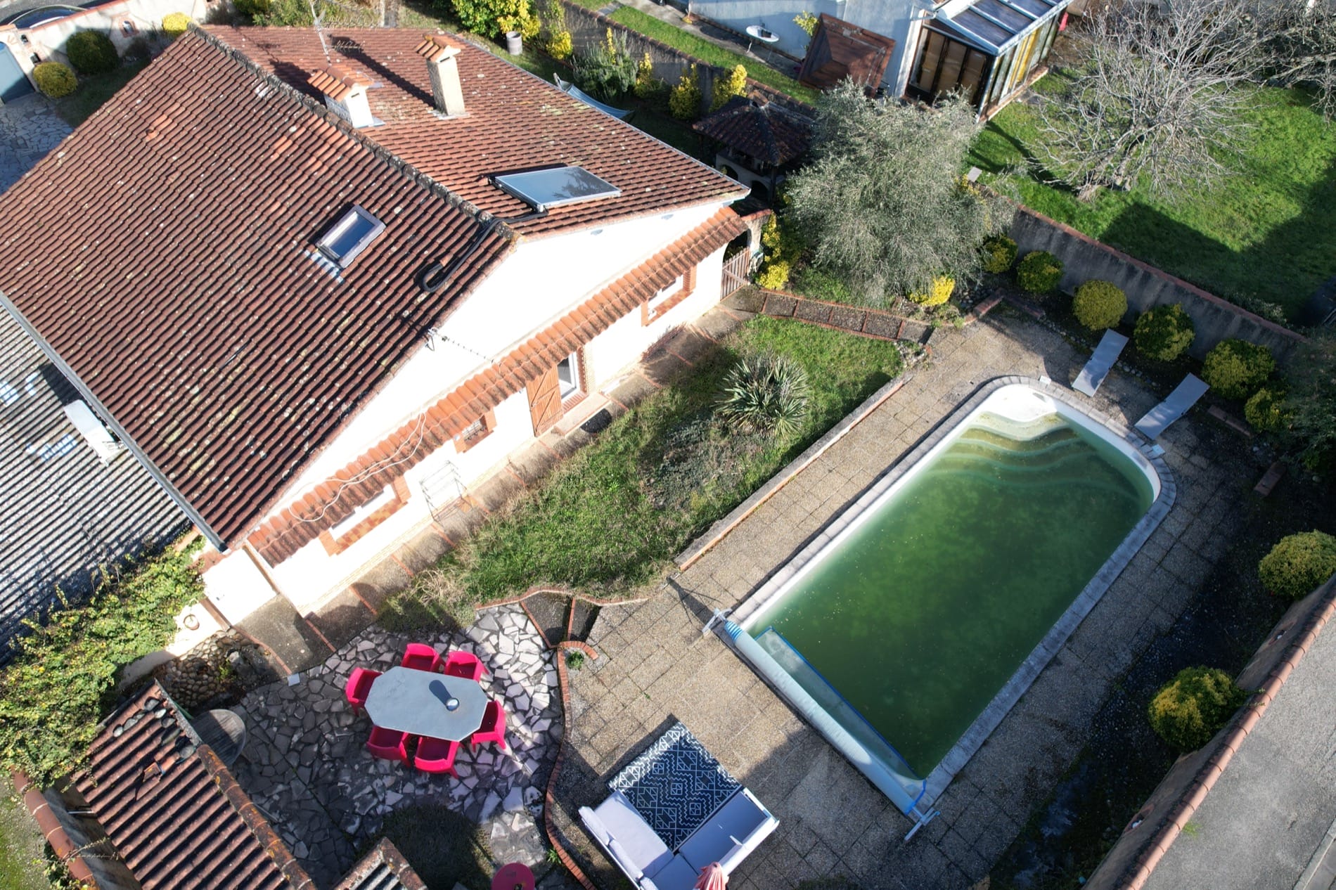 Son jardin arboré est déjà doté d’une grande piscine de 37m² sur l’arrière de la maison, en mode hivernage le temps de la saison froide…