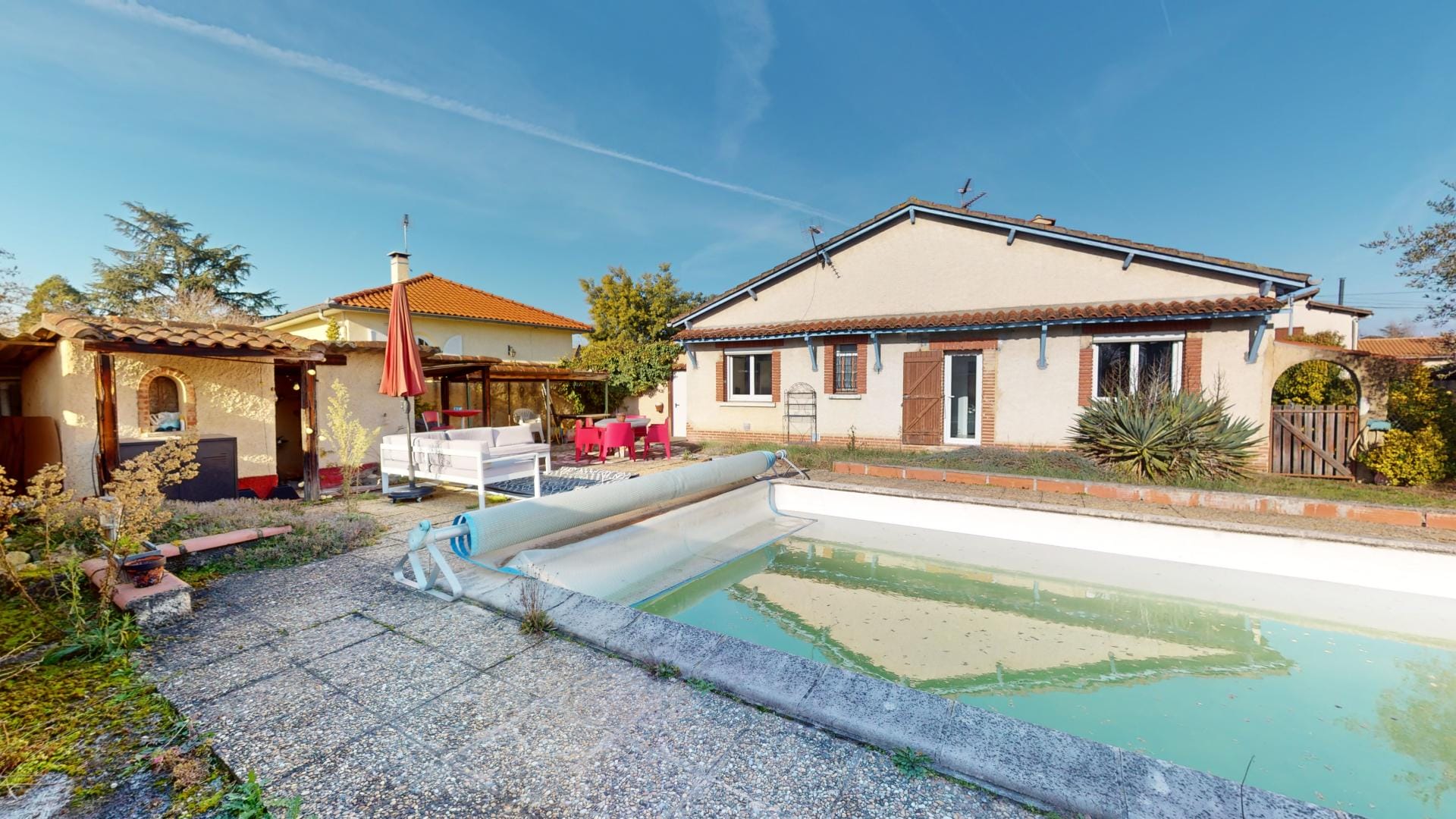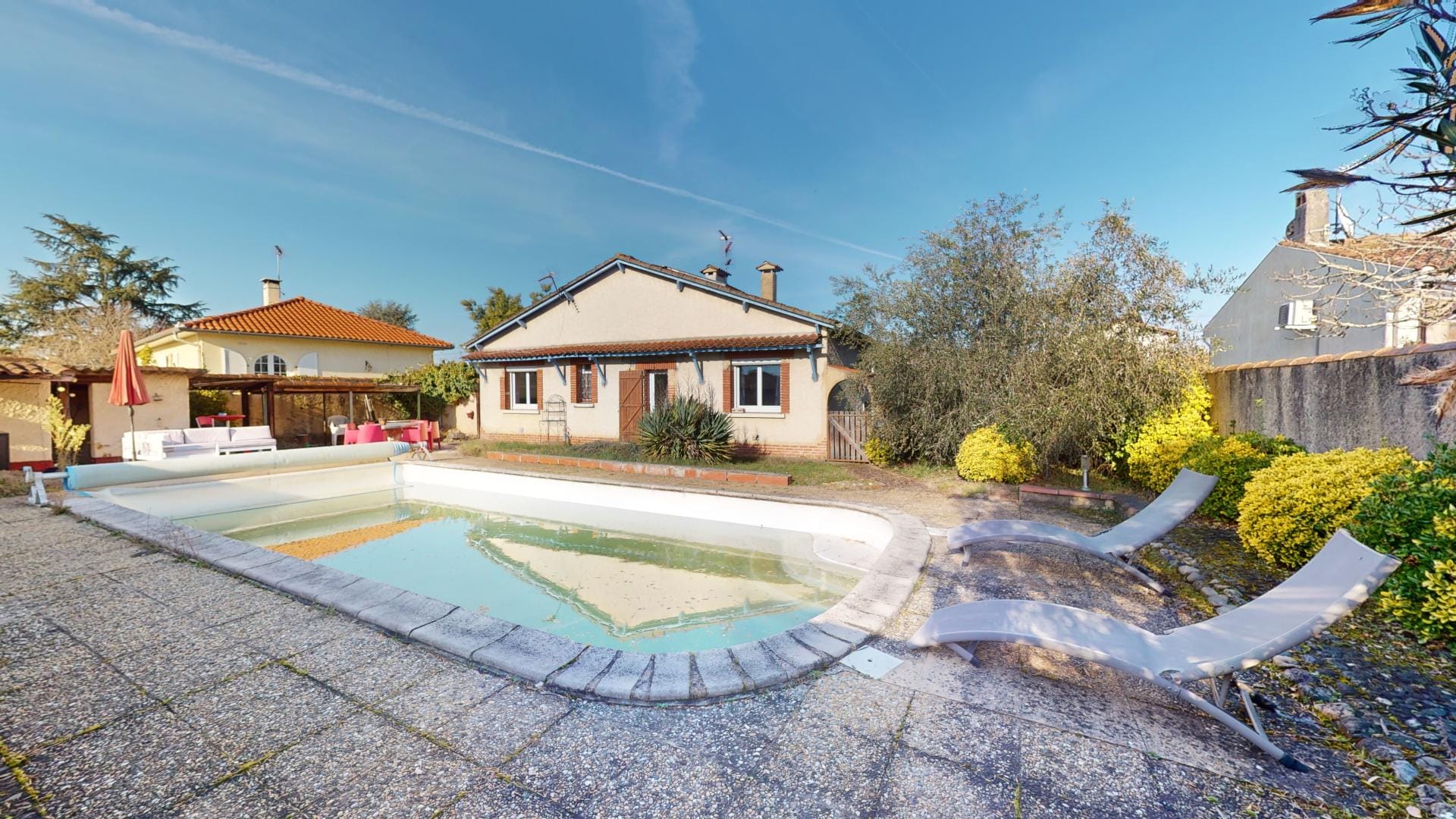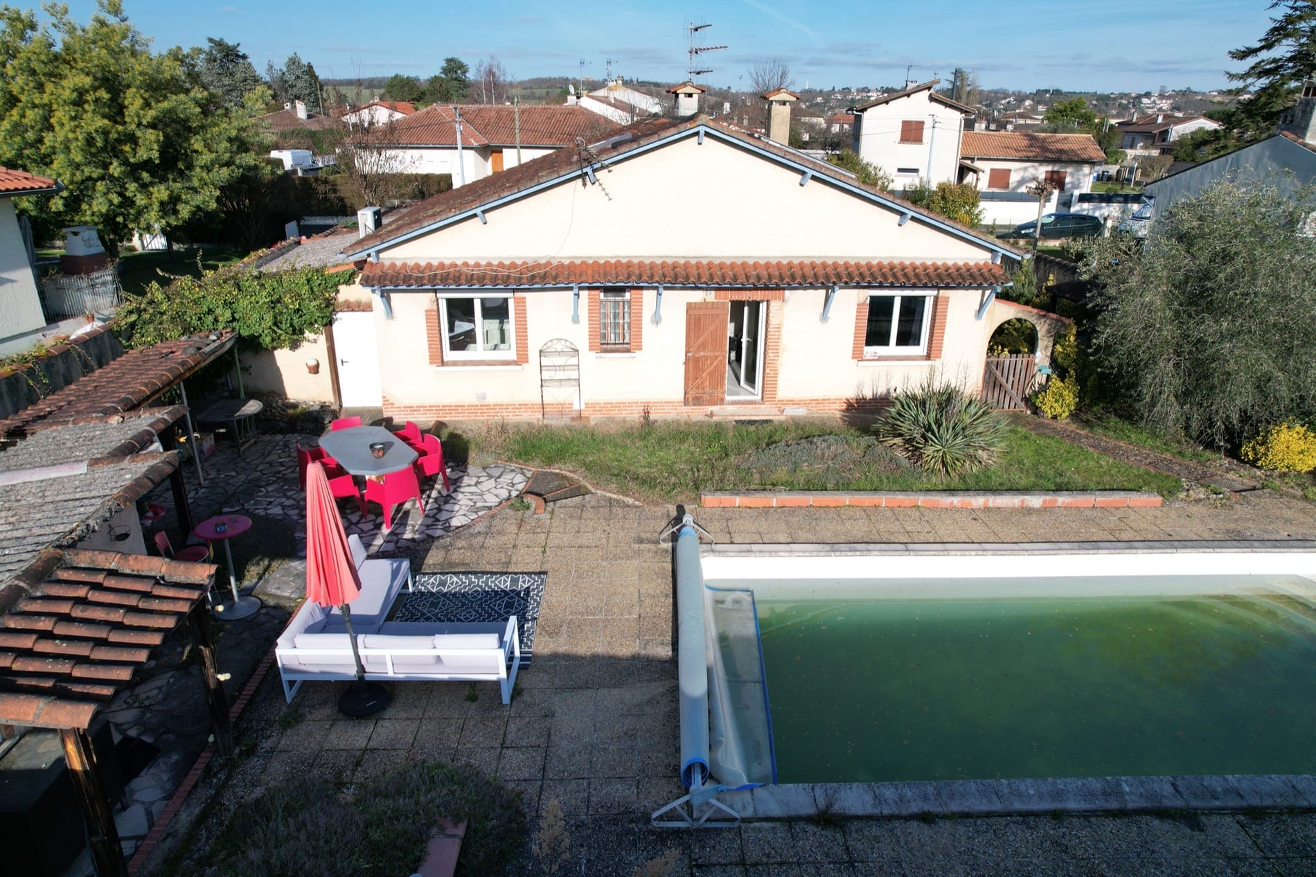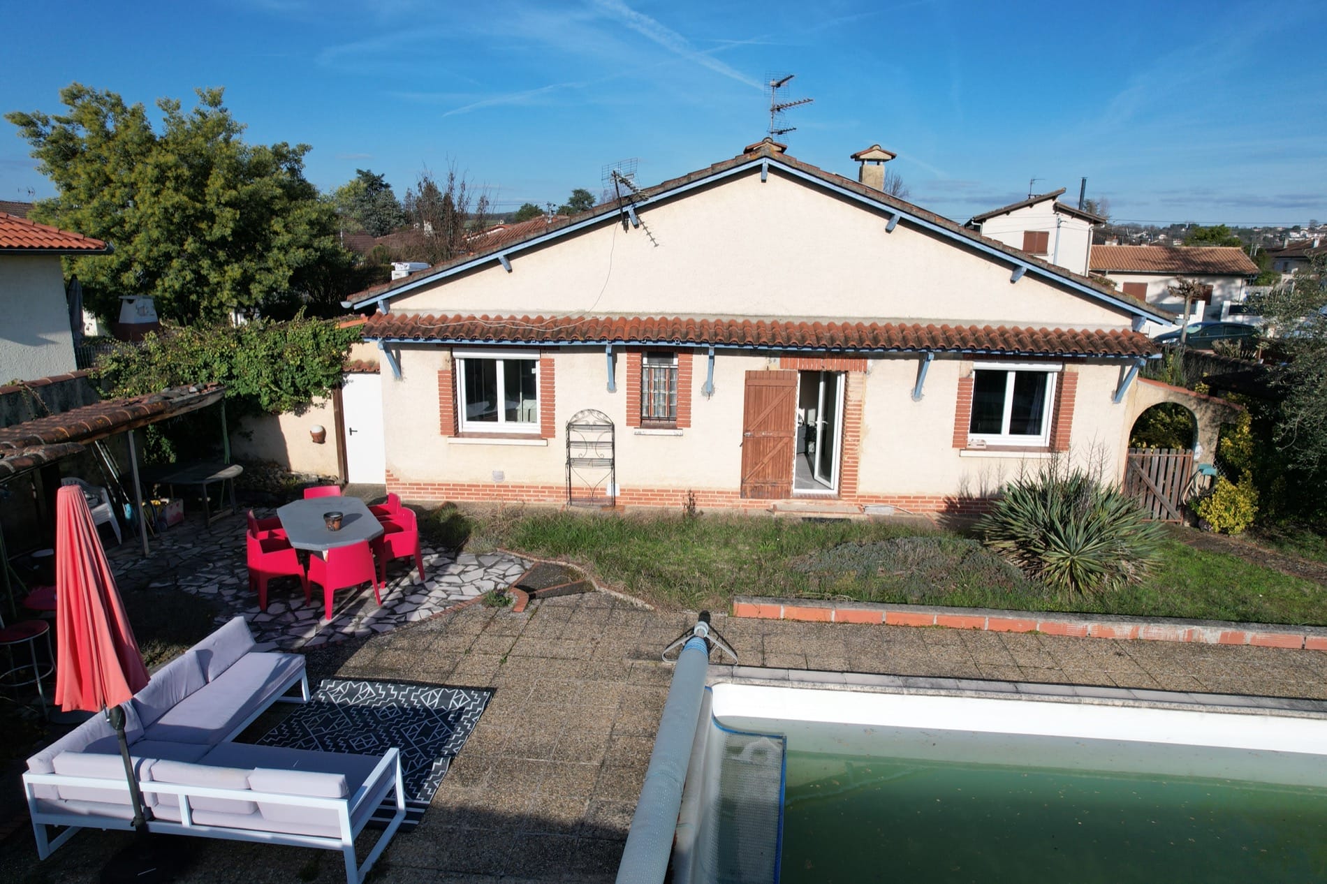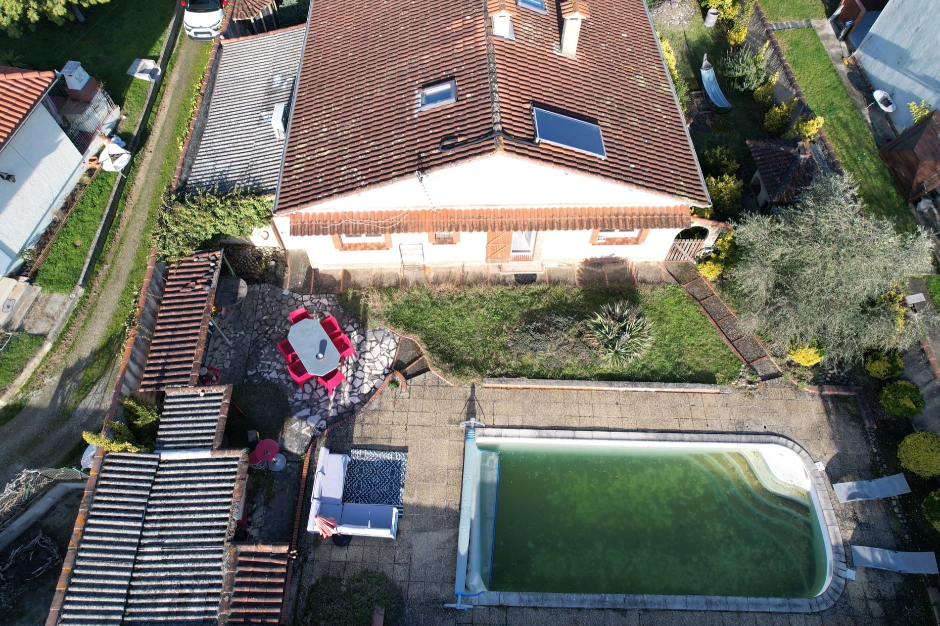 Son jardin arboré est déjà doté d’une grande piscine de 37m² sur l’arrière de la maison, en mode hivernage le temps de la saison froide…