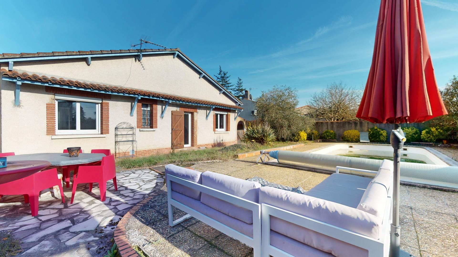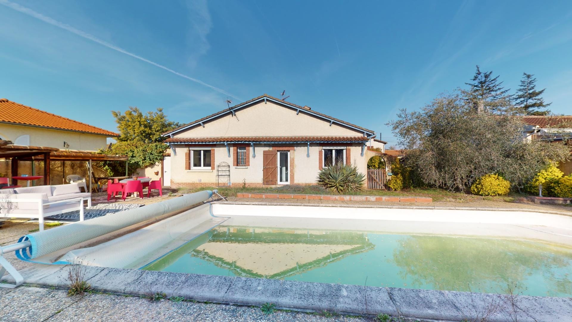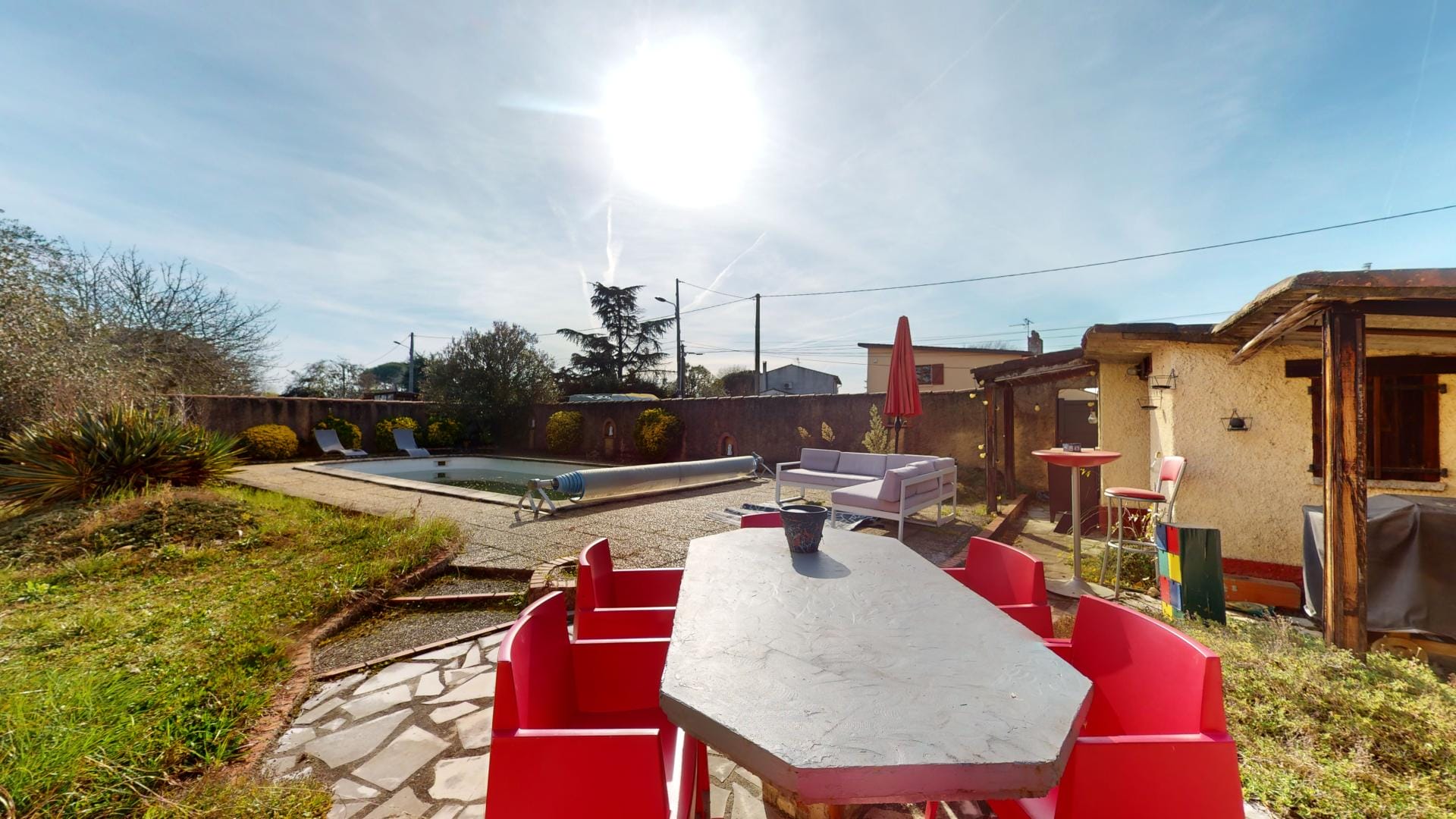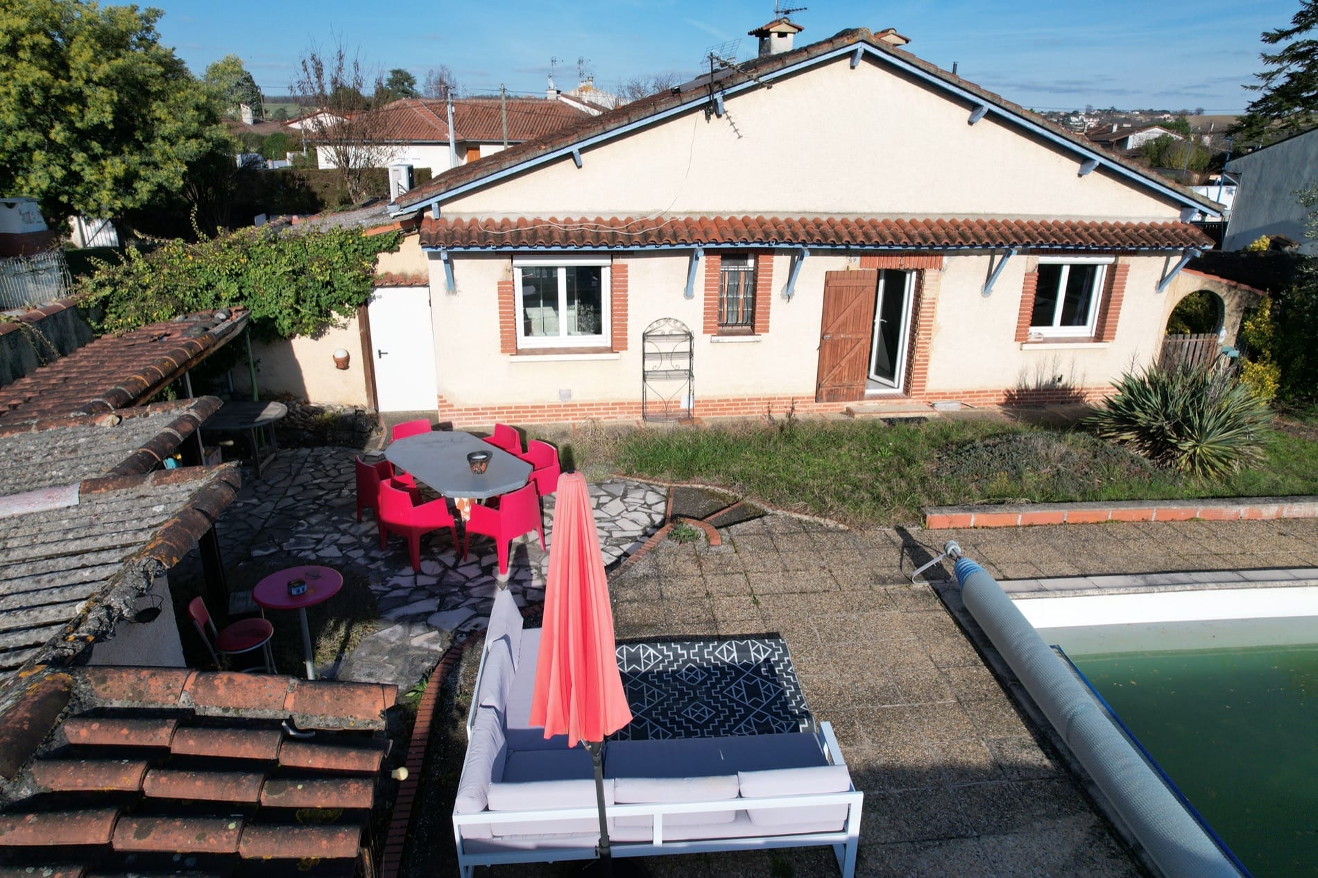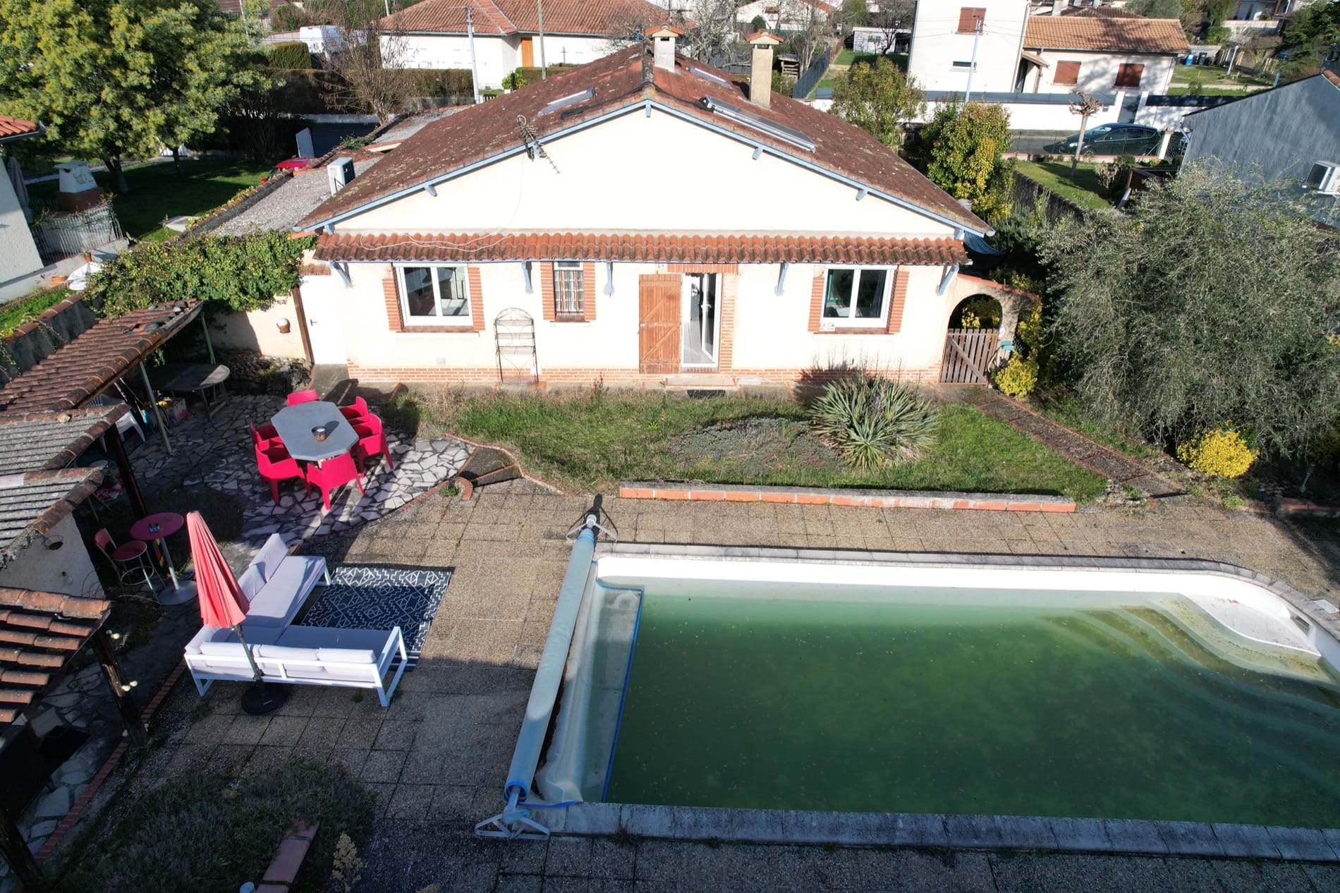 Son jardin arboré est déjà doté d’une grande piscine de 37m² sur l’arrière de la maison, en mode hivernage le temps de la saison froide…