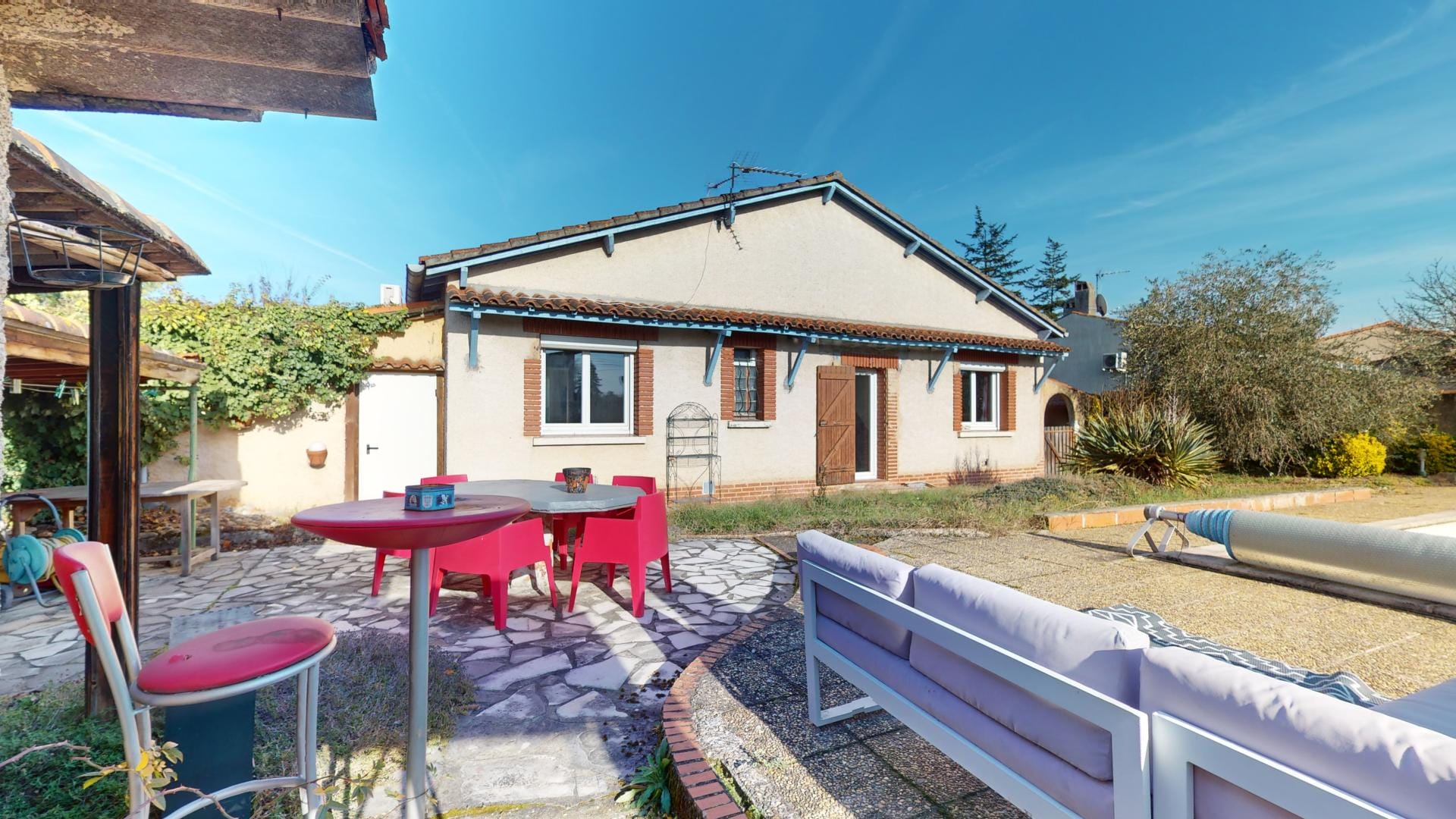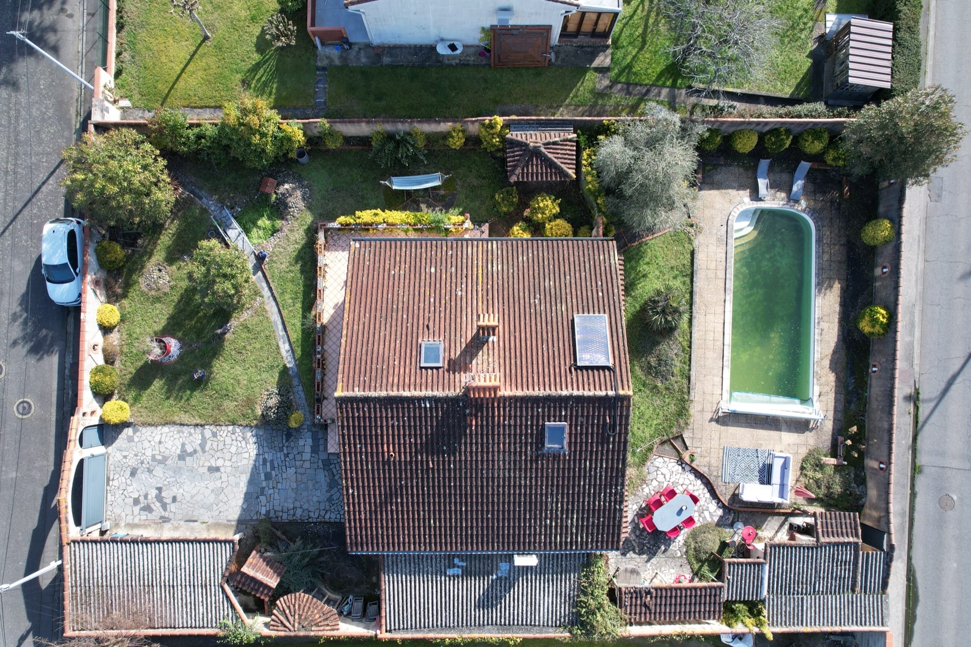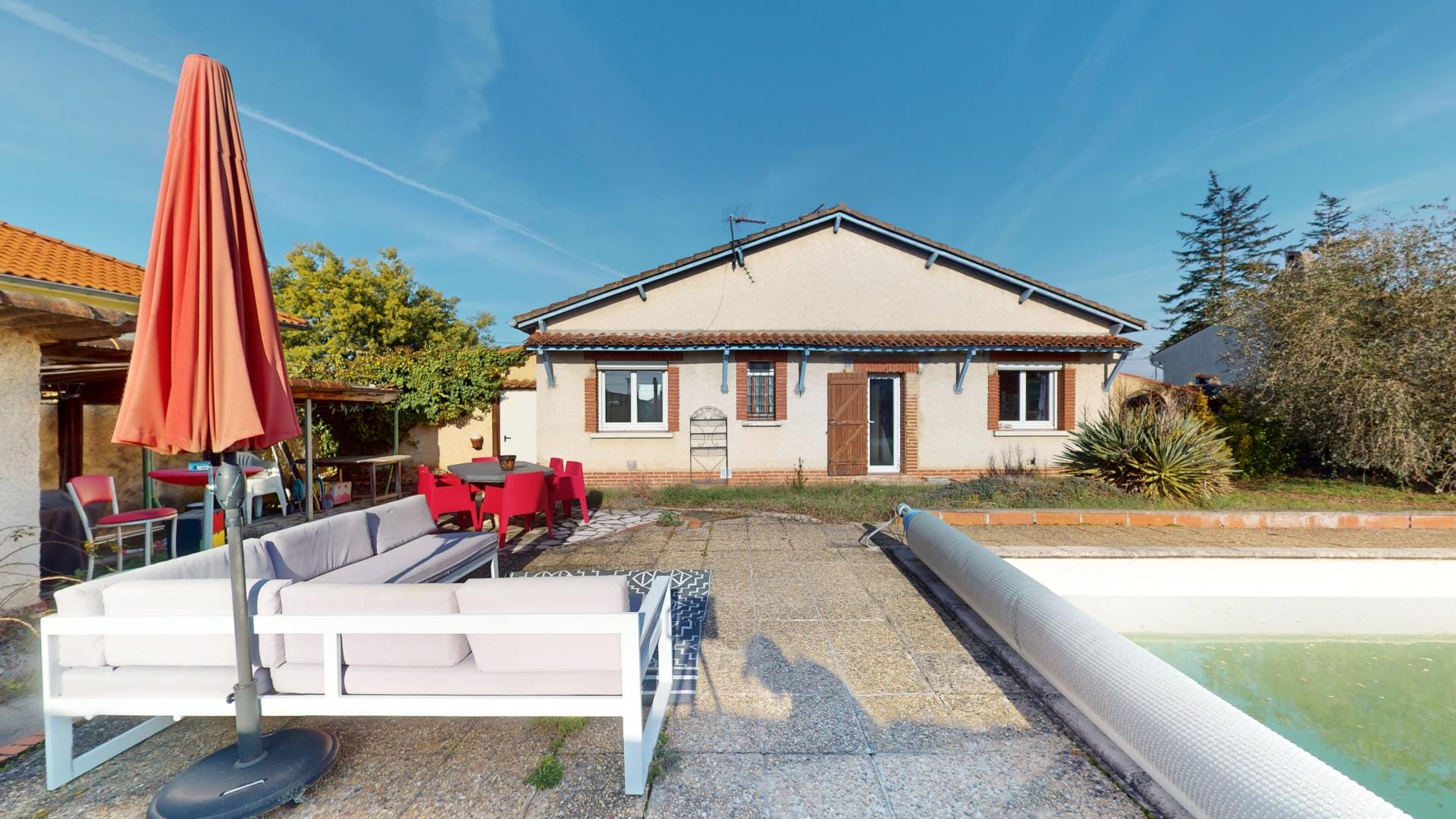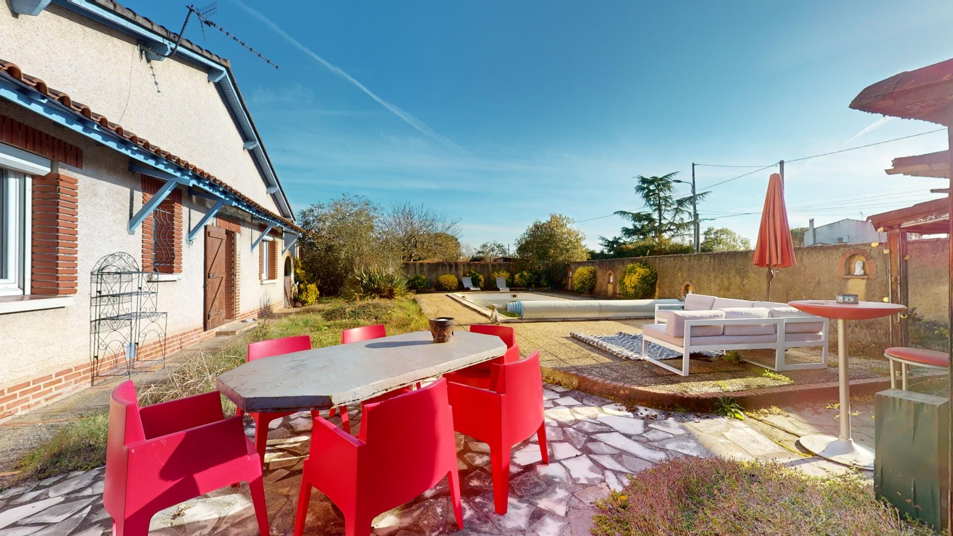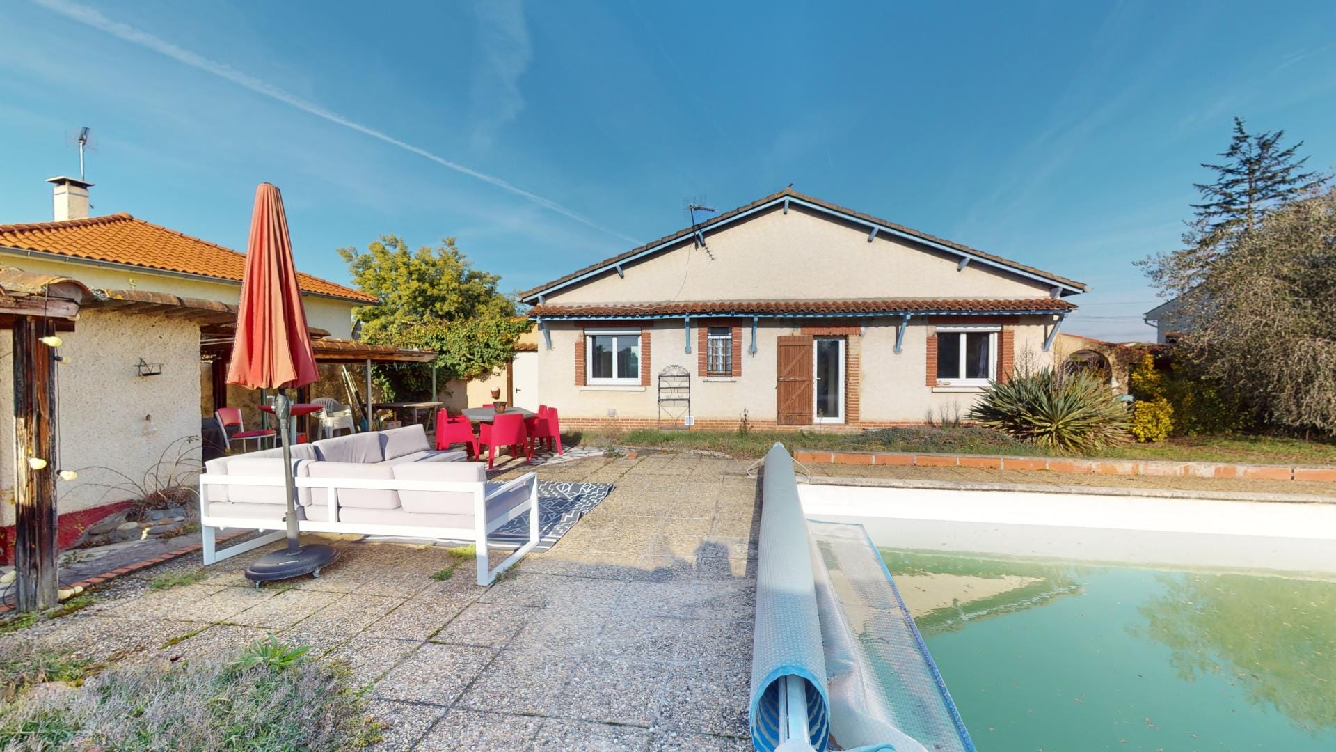Son jardin arboré est déjà doté d’une grande piscine de 37m² sur l’arrière de la maison, en mode hivernage le temps de la saison froide…