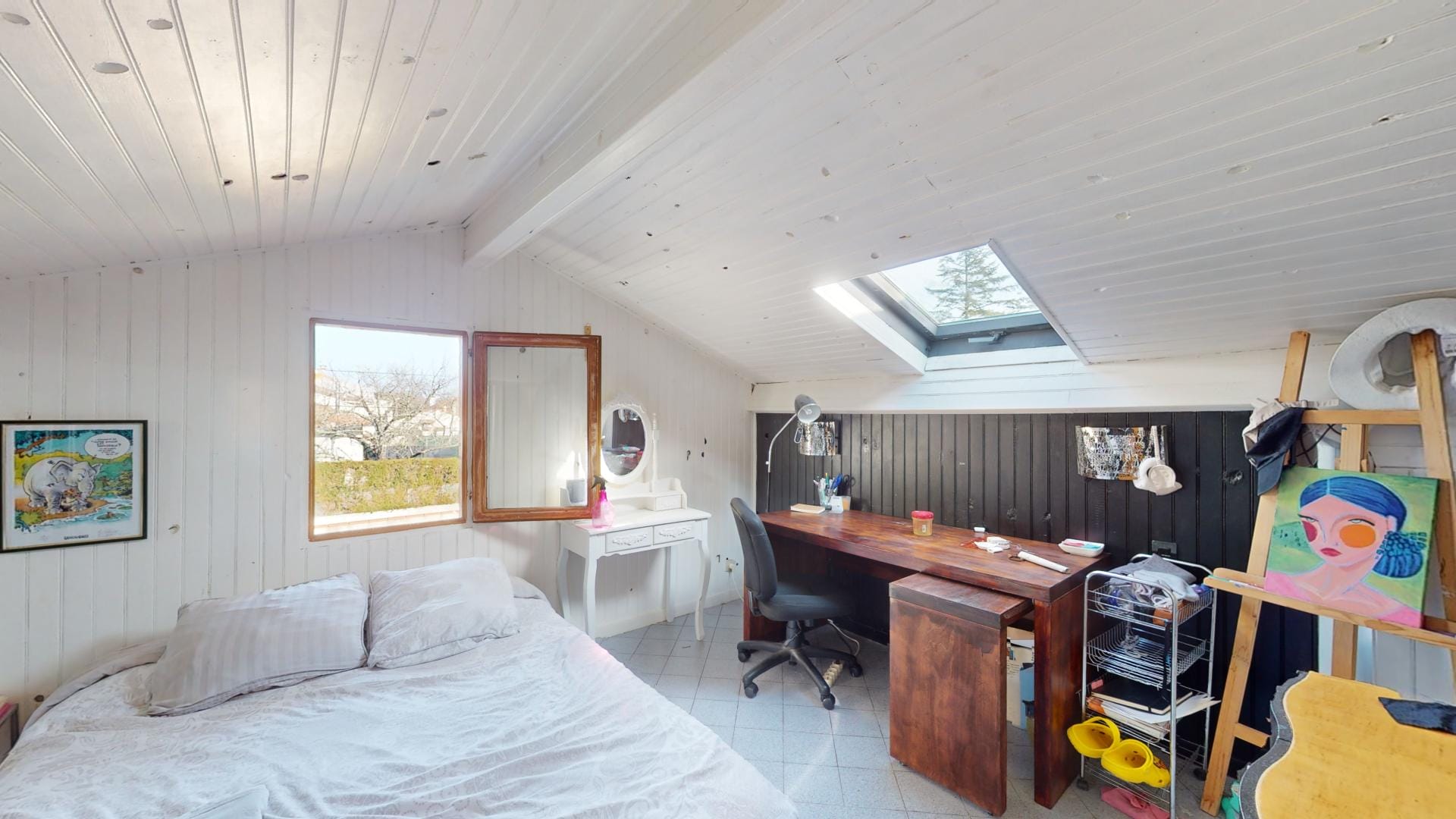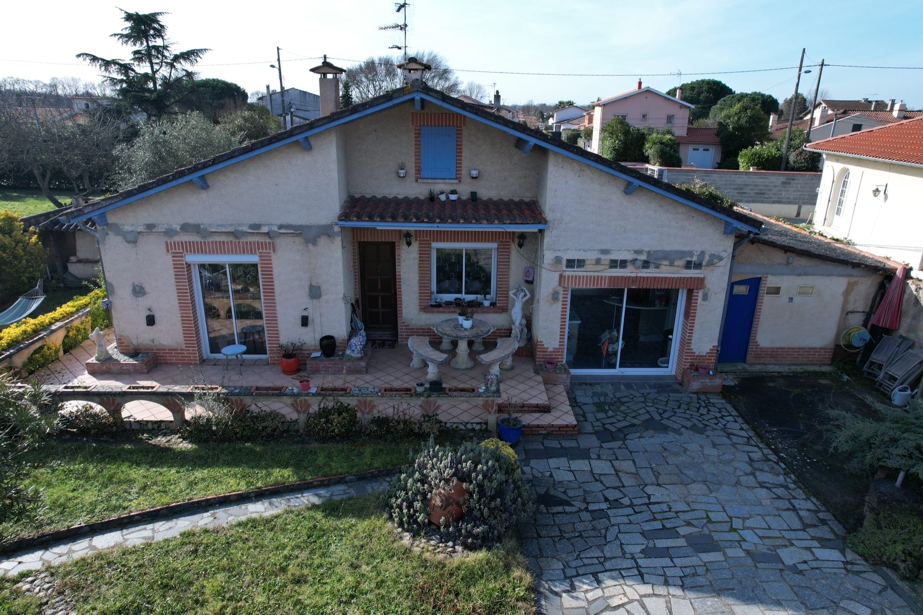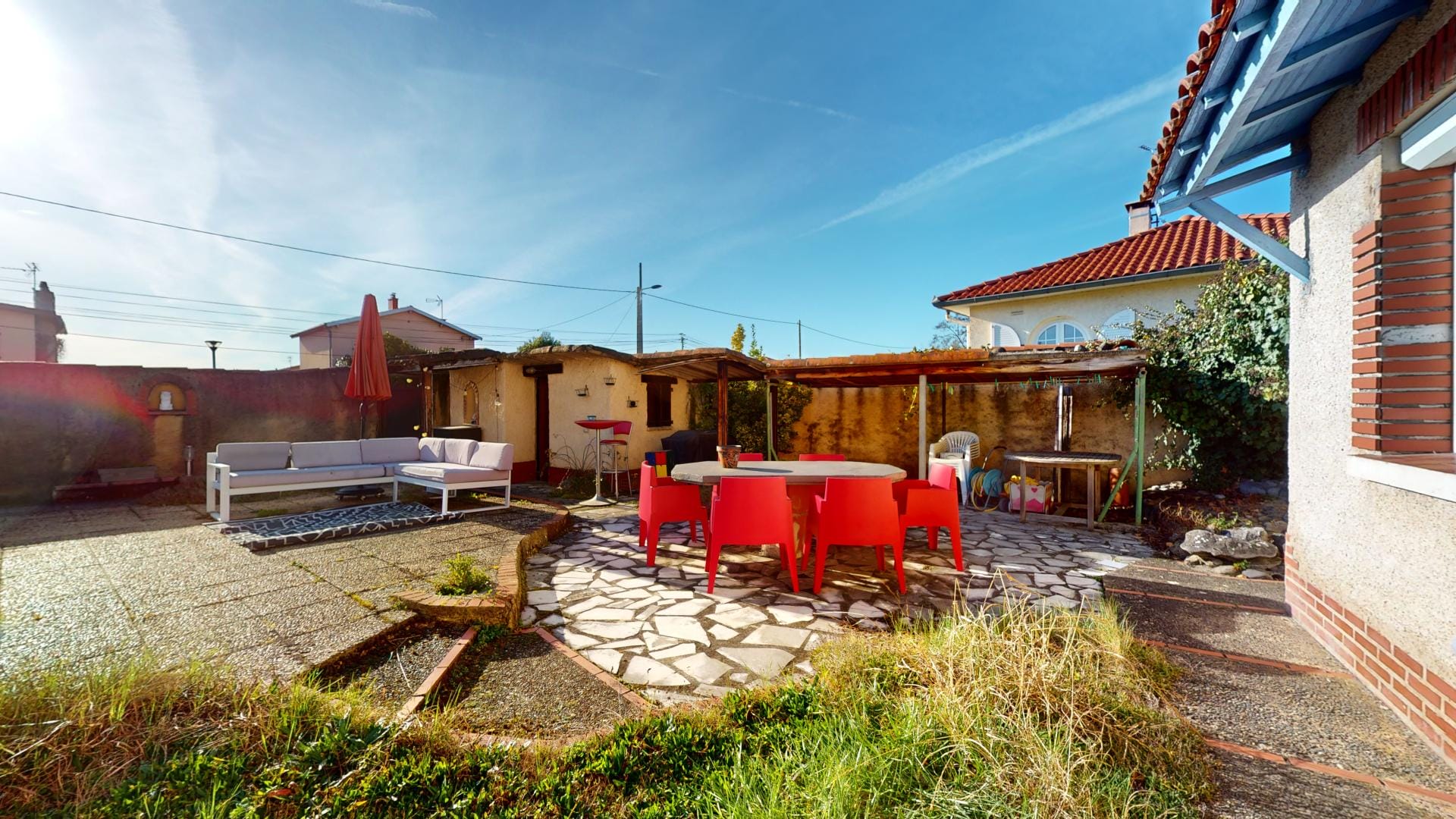 Des petits travaux maitrisables simples sont à prévoir comme la reprise du crépi sur les murs et la façade suite au retrait des pergolas (tâches reprise ciment sur la façade), offrant ainsi l’occasion de donner un aspect résolument moderne, et tendance à l’ensemble.