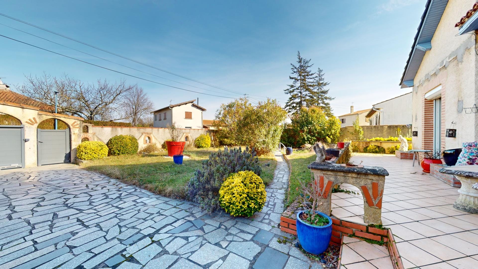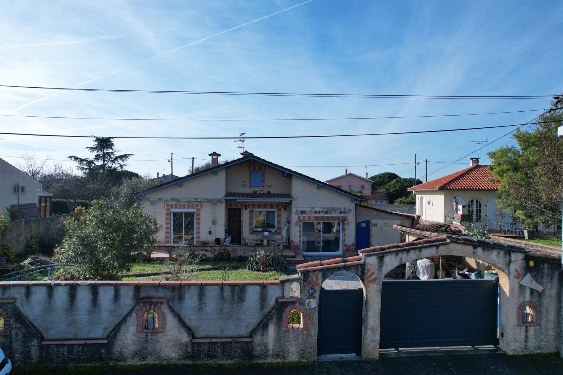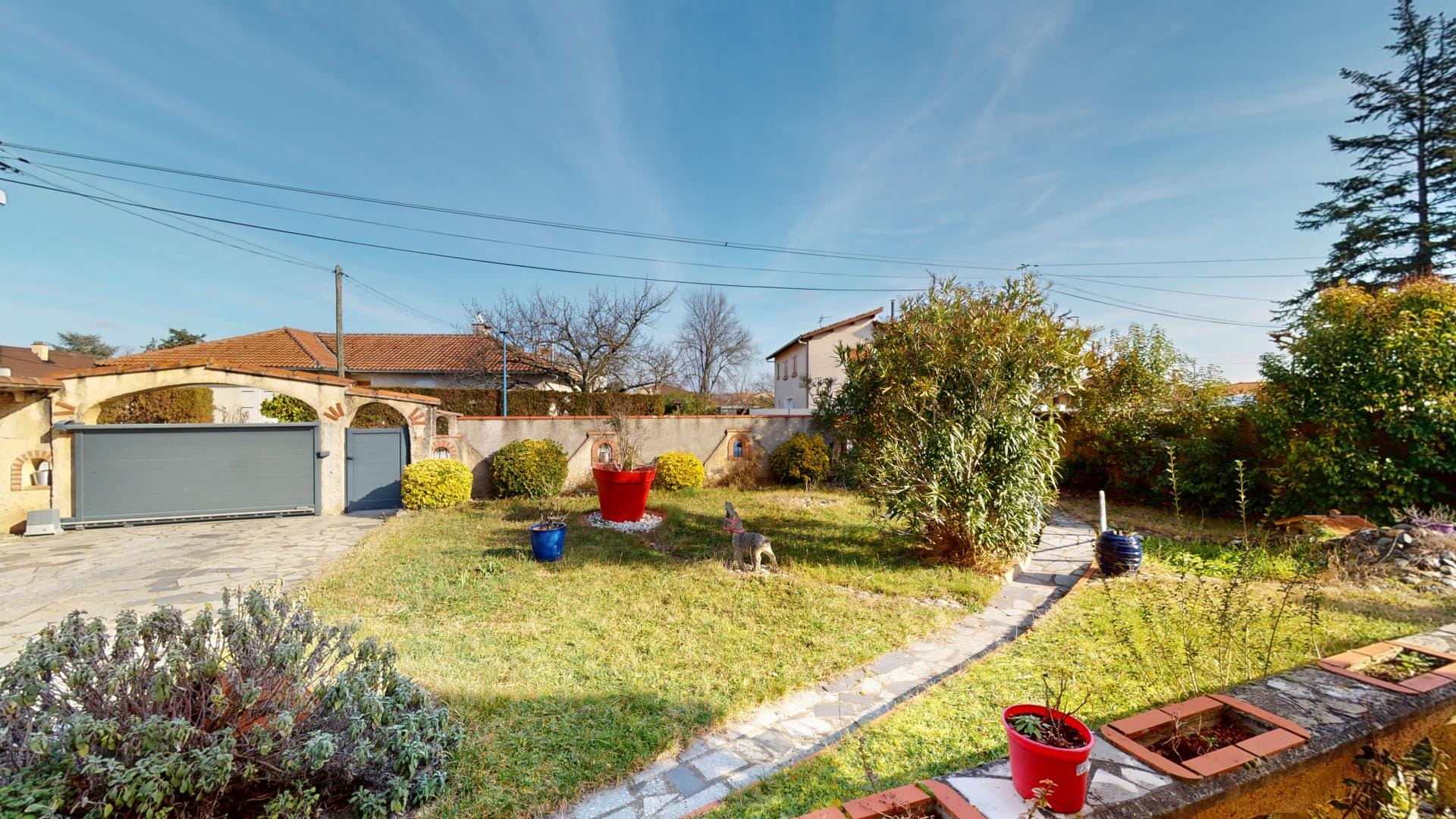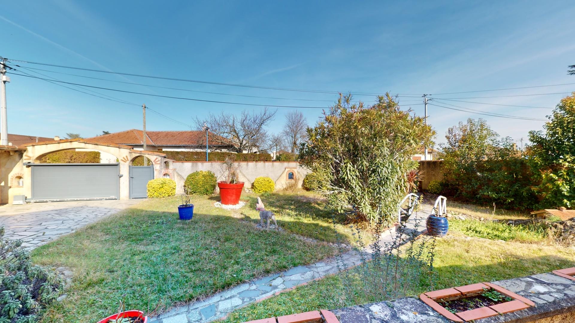 La maison se trouve sur une parcelle entièrement clôturée avec portail automatique et portillon, assurant sécurité et intimité.