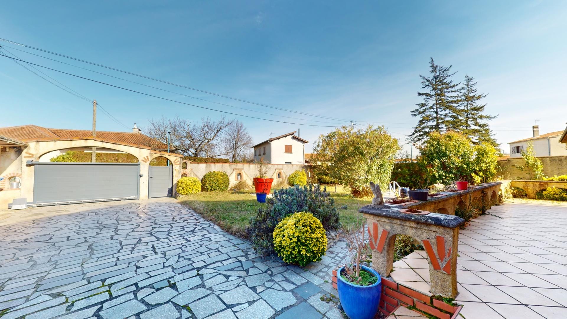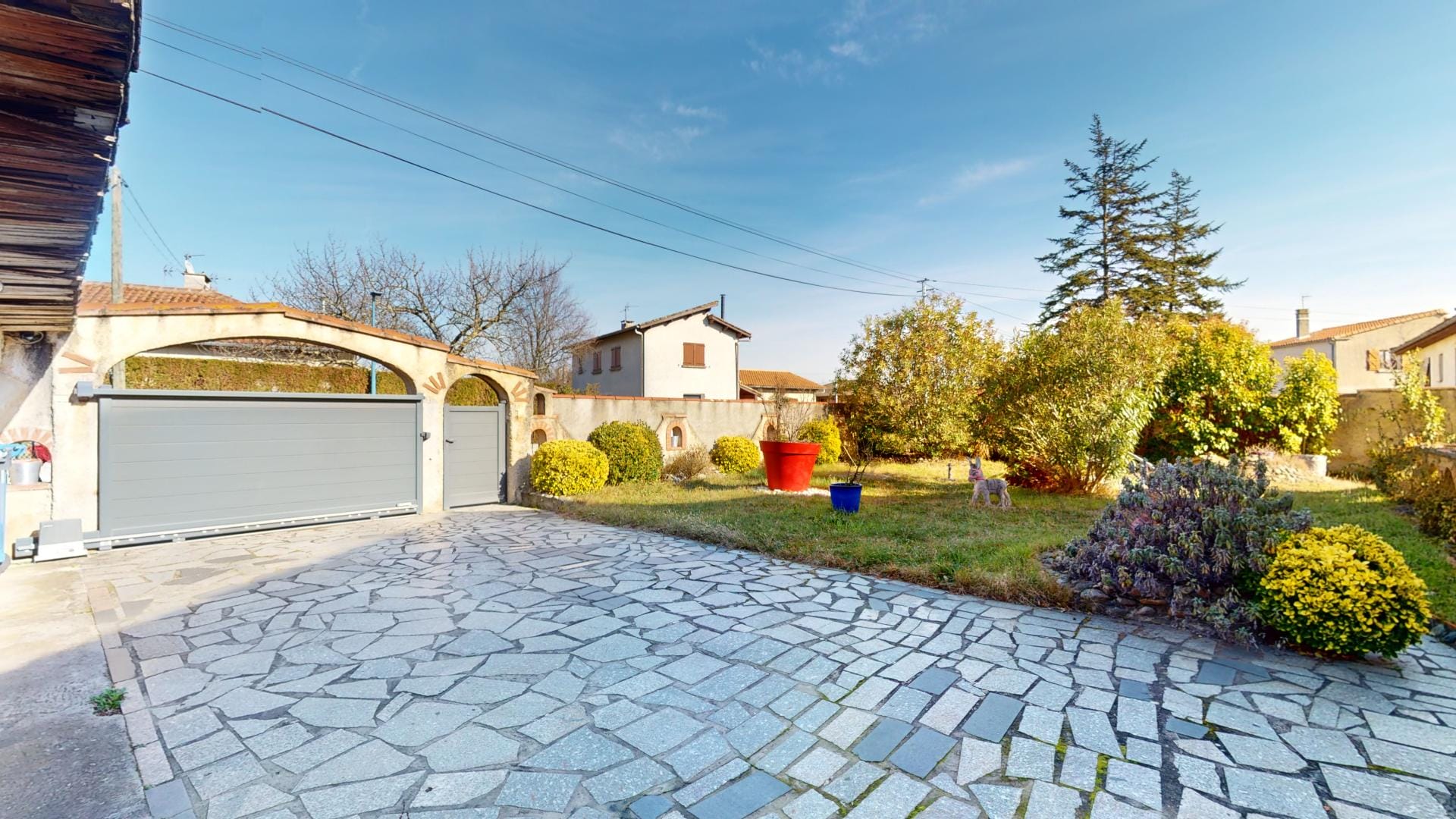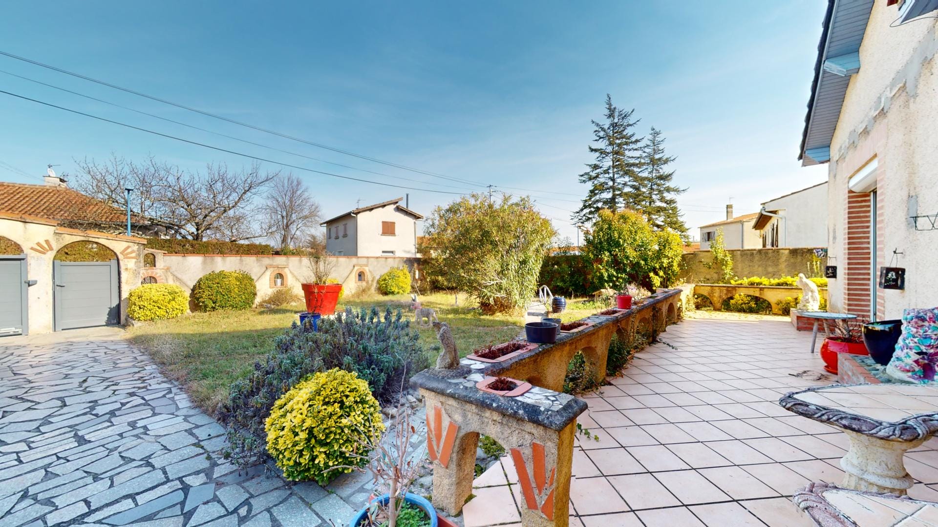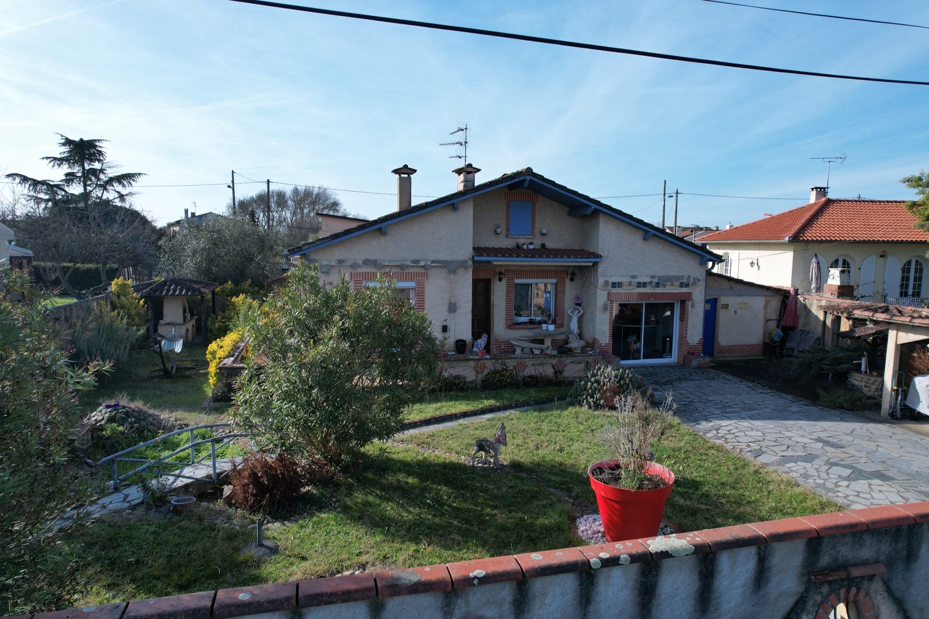 La maison se trouve sur une parcelle entièrement clôturée avec portail automatique et portillon, assurant sécurité et intimité.