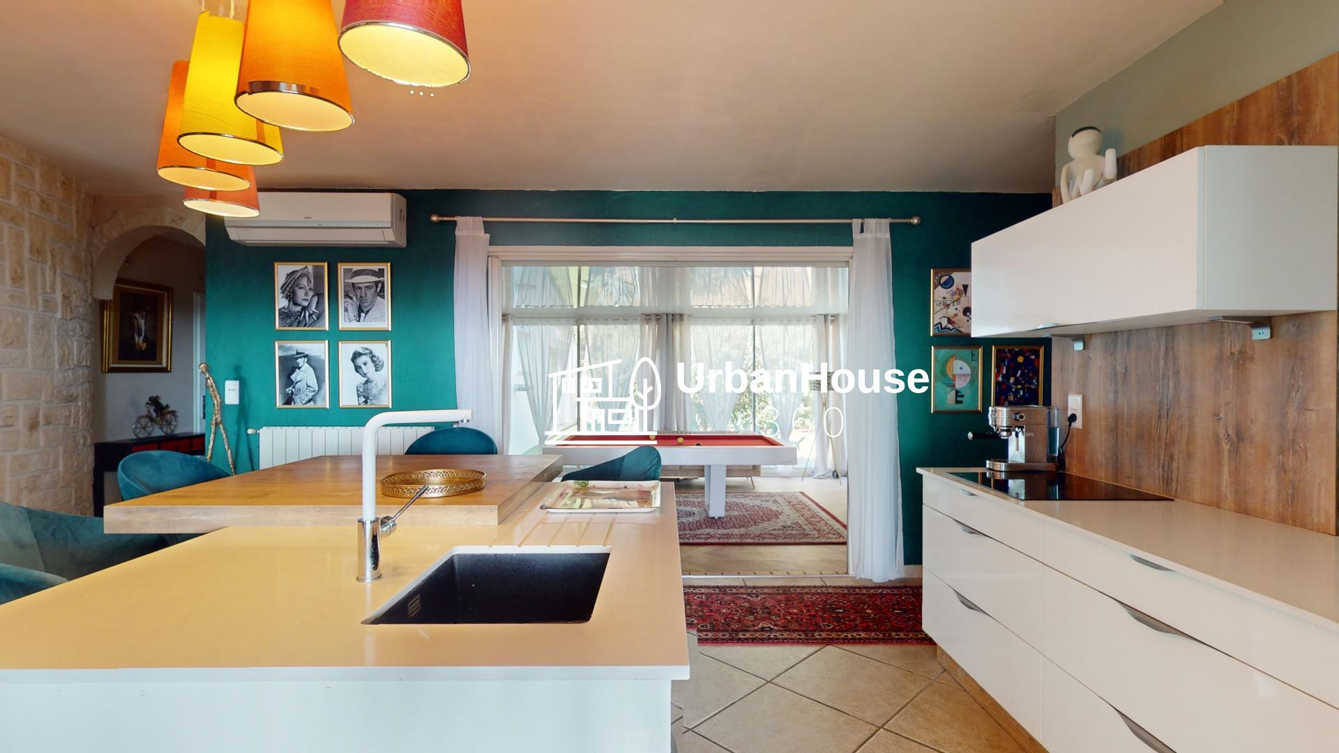 Regroupant cuisine, salle à manger et salon sur une superficie de 80 m², étendue à 130m2 par les ouvertures à galandage de la salle de billard et de la véranda, elle incarne l’essence même du bien-vivre, accueillant des moments partagés en famille