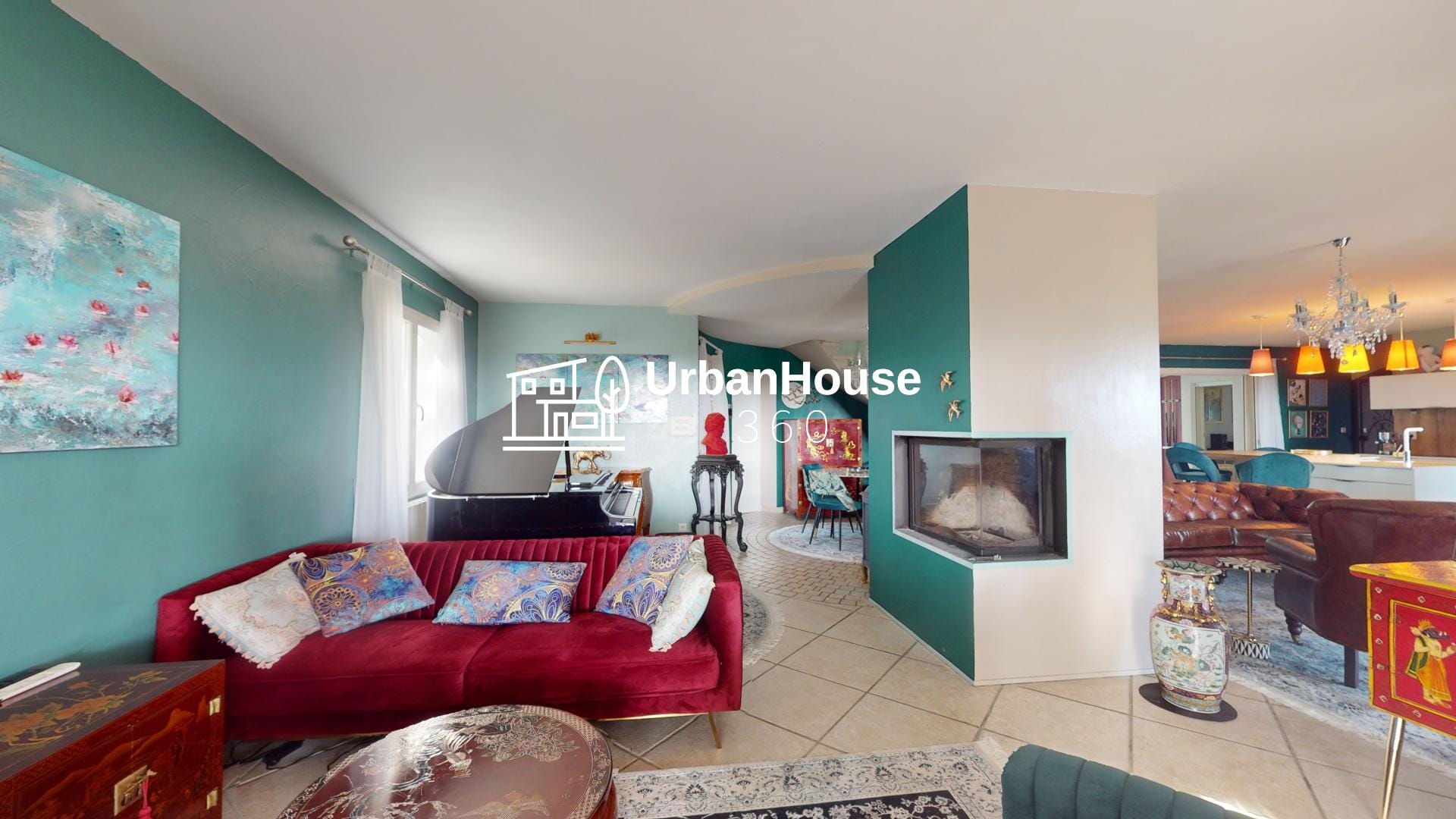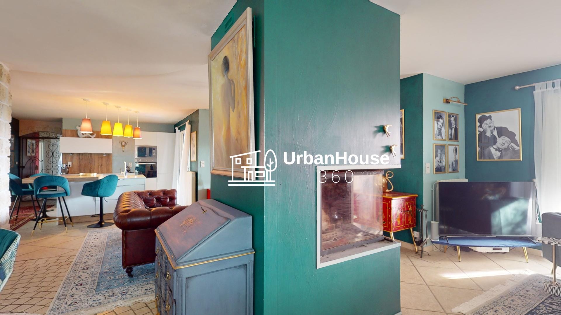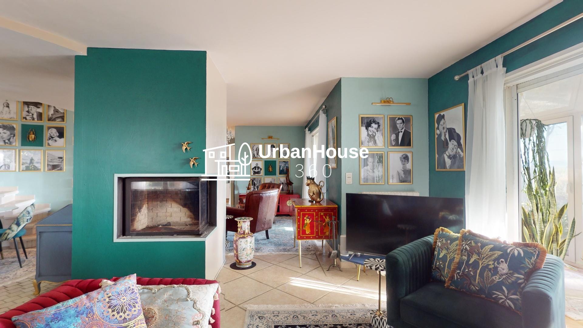 Adjacente à la véranda, un salon autour d’une cheminée à insert à double vitre de face et latérale.