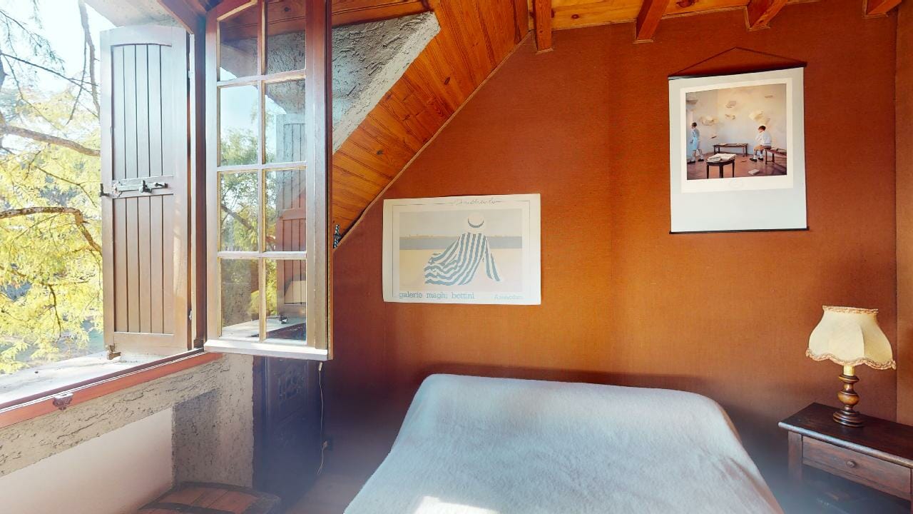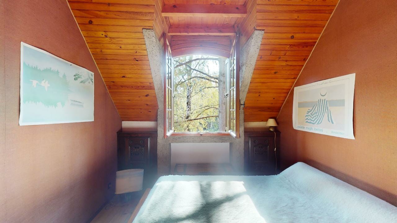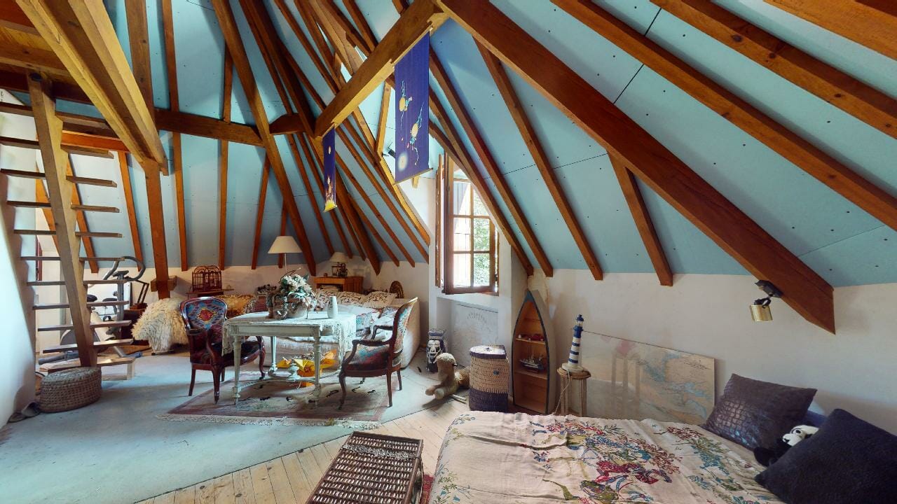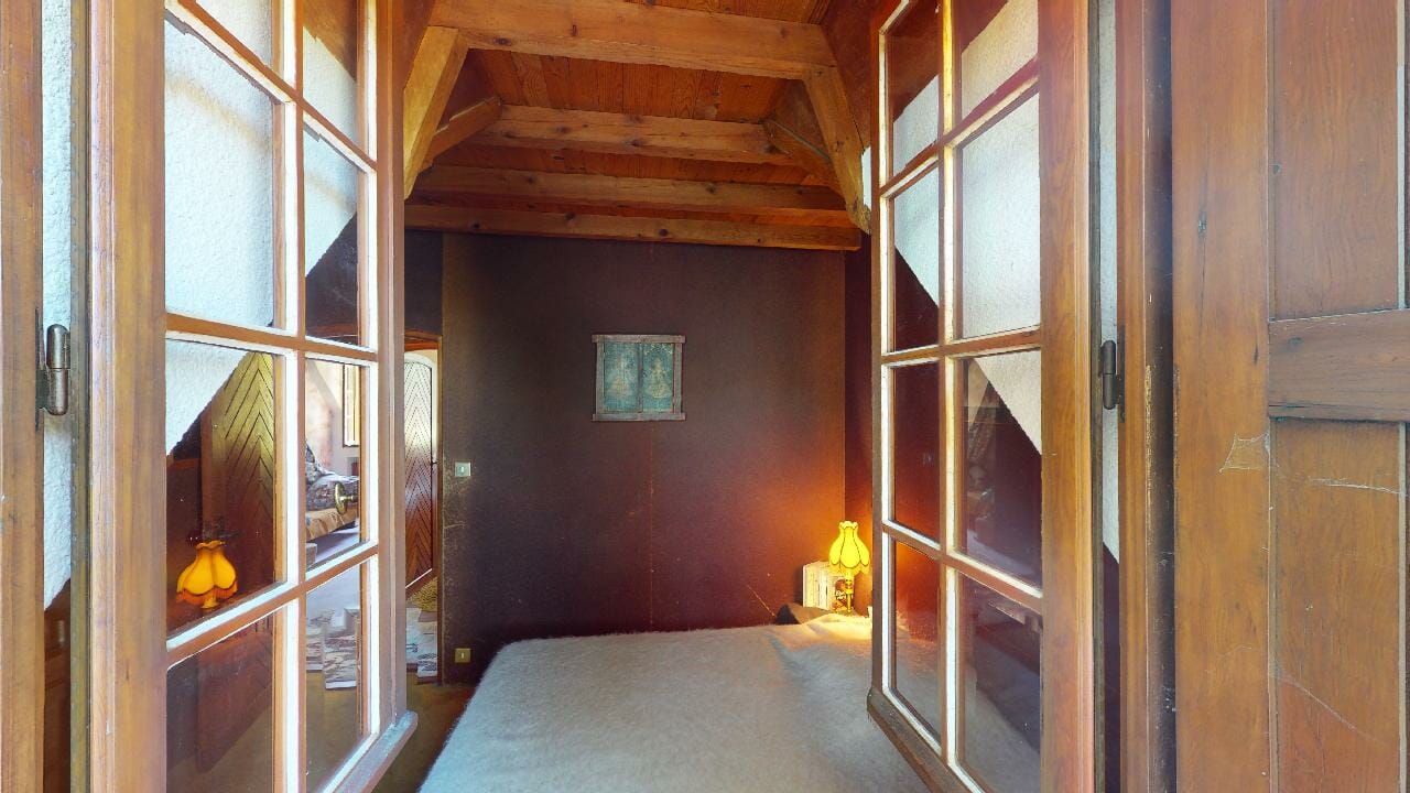 Enfin dernière chambre appartement, mêlant harmonieusement authenticité et modernité. Dès l’entrée, le regard est irrésistiblement attiré par les poutres apparentes qui traversent le plafond, apportant une touche chaleureuse à l’ensemble.