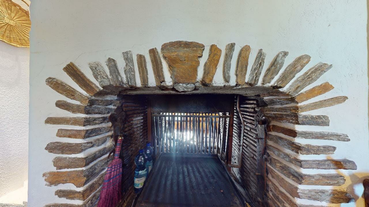 Le joyau de cette cuisine est sans conteste sa cheminée double foyer. Outre sa fonction première de réchauffer la pièce durant les mois plus froids, elle offre également un spectacle fascinant, visible à la fois depuis la cuisine et la salle à manger attenante. Ce foyer partagé renforce l’idée de lien et de partage entre les deux espaces.