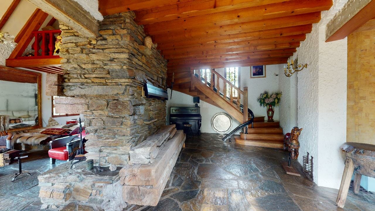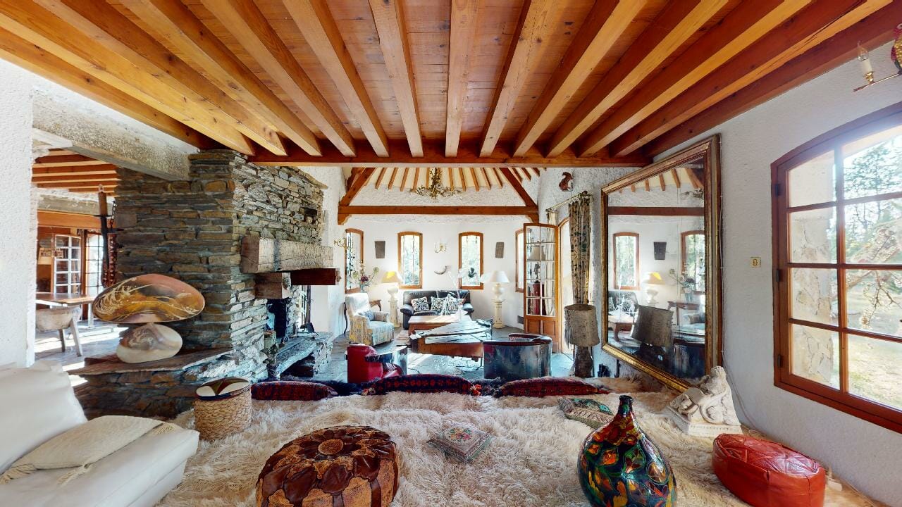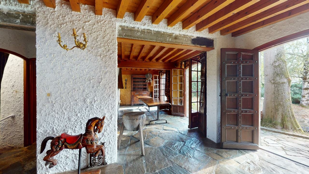Le hall d’entrée et la salle à manger respirent l’authenticité et l’élégance intemporelle, entre le bois massif des poutres et la pierre naturelle au sol, créant une ambiance paisible et chaleureuse.