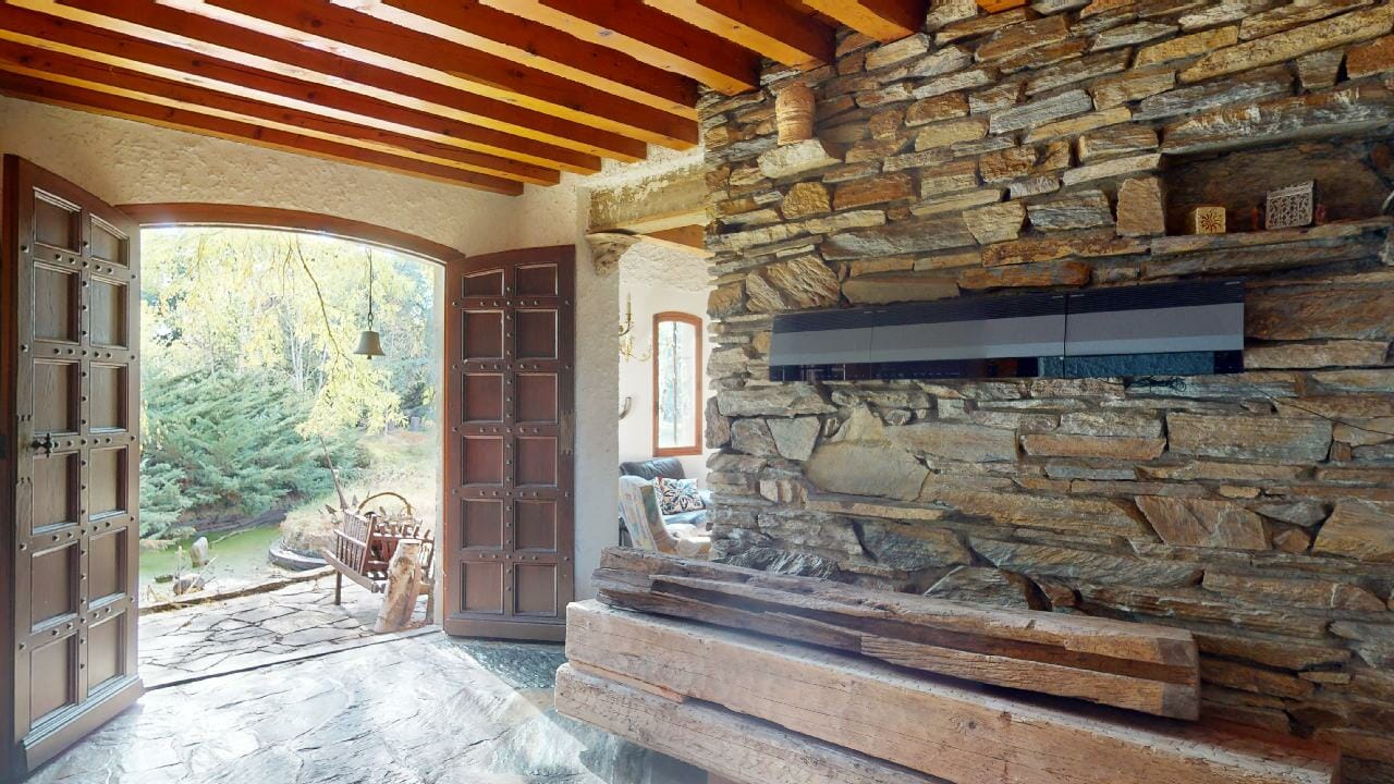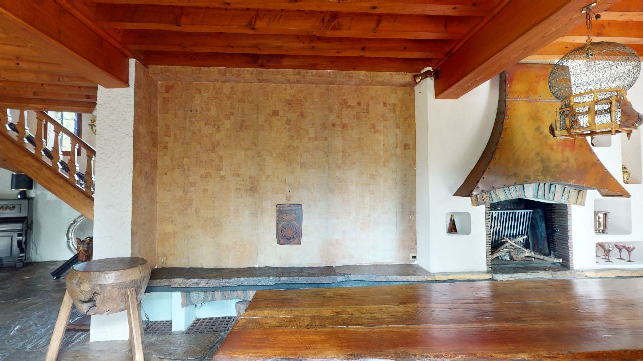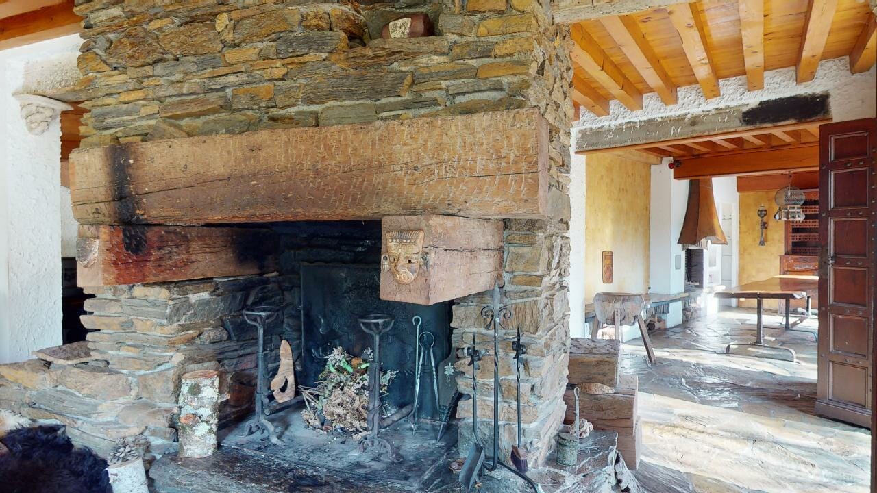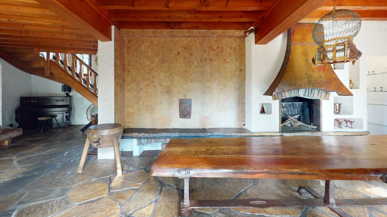 Le hall d’entrée et la salle à manger respirent l’authenticité et l’élégance intemporelle, entre le bois massif des poutres et la pierre naturelle au sol, créant une ambiance paisible et chaleureuse.