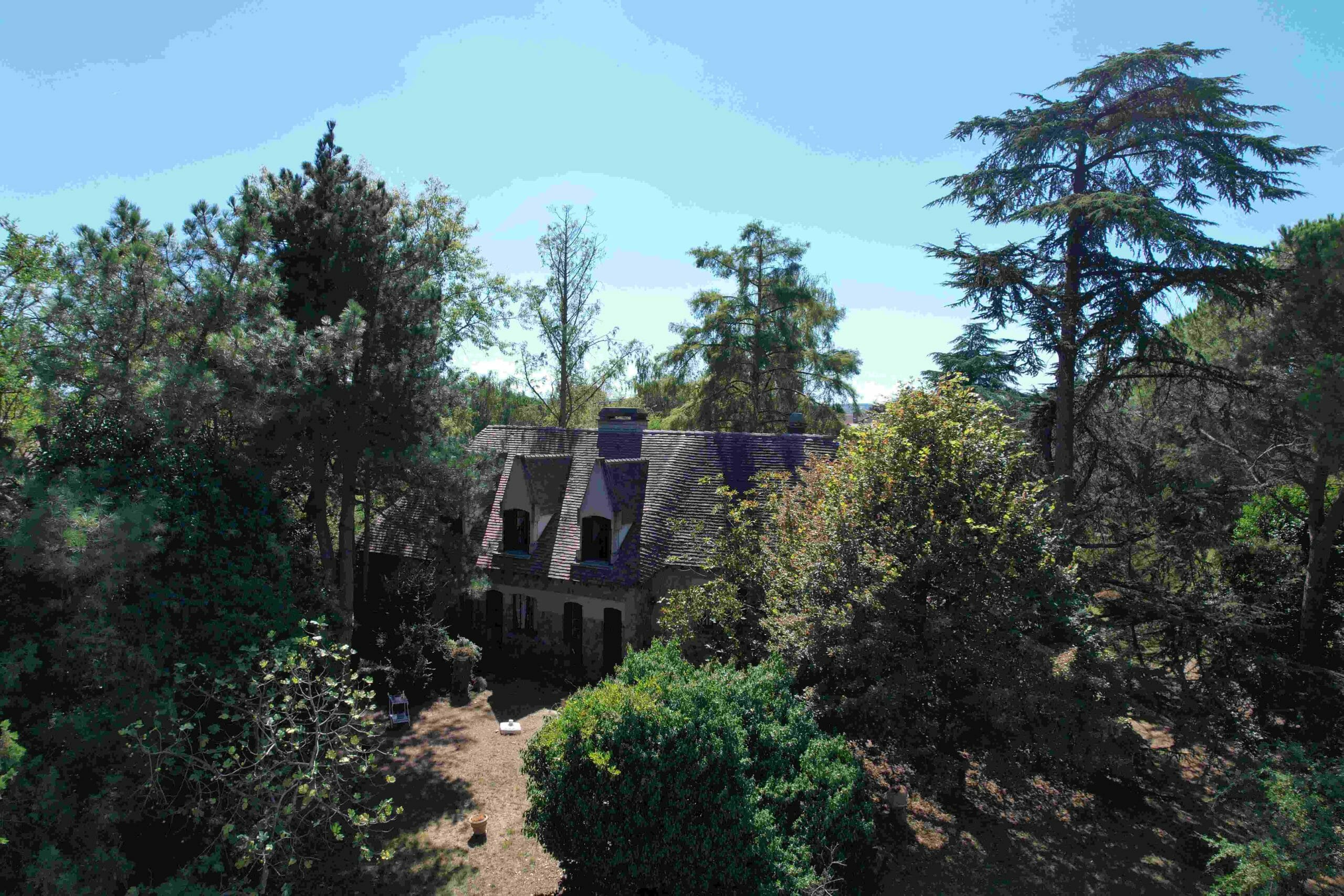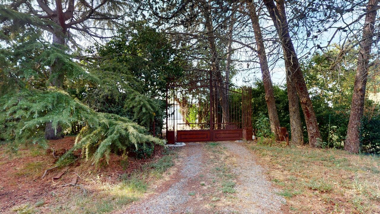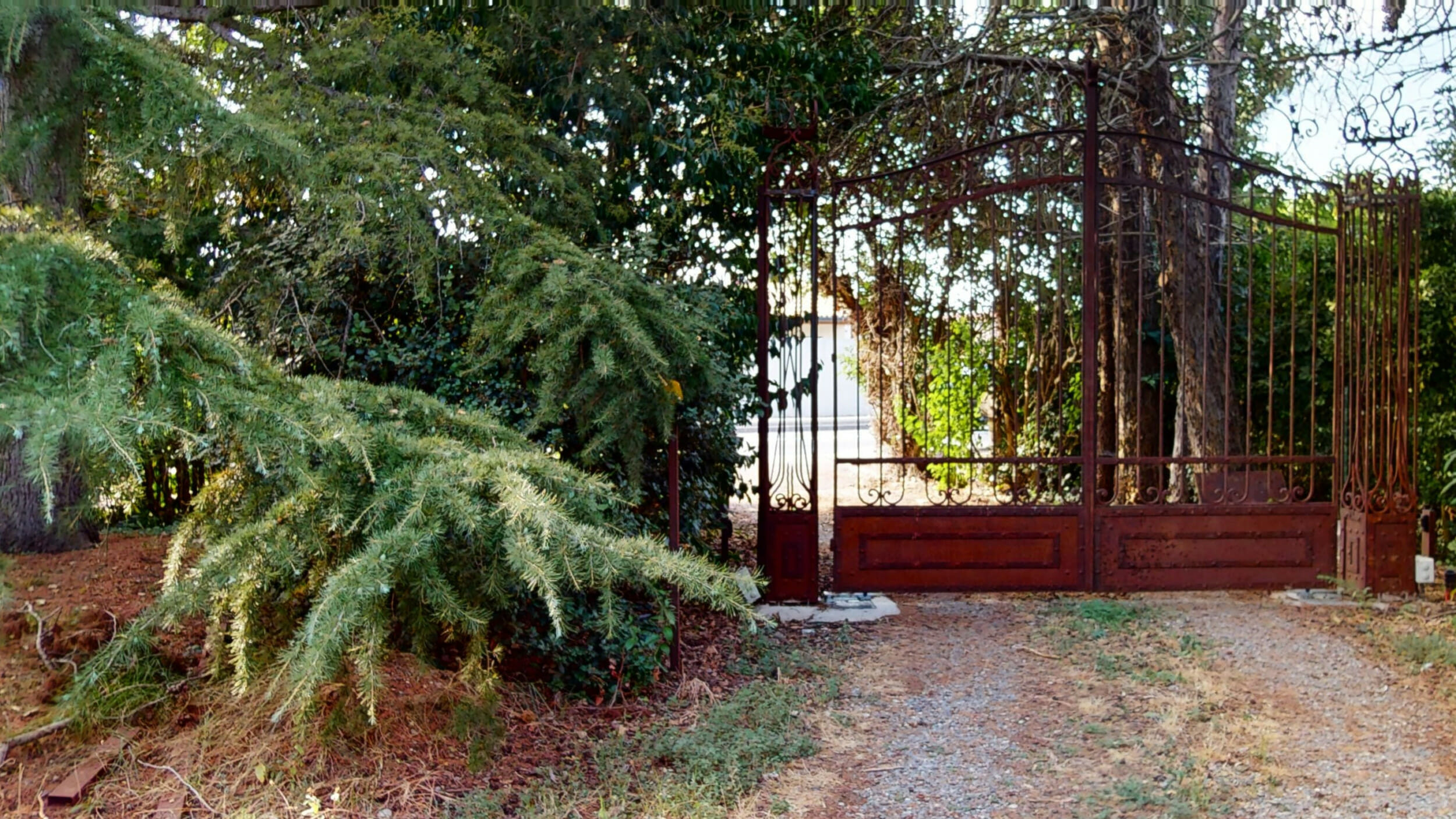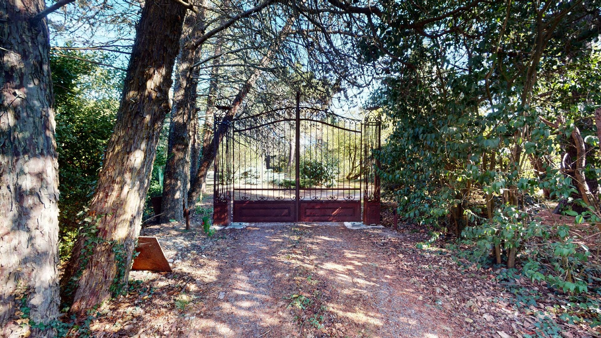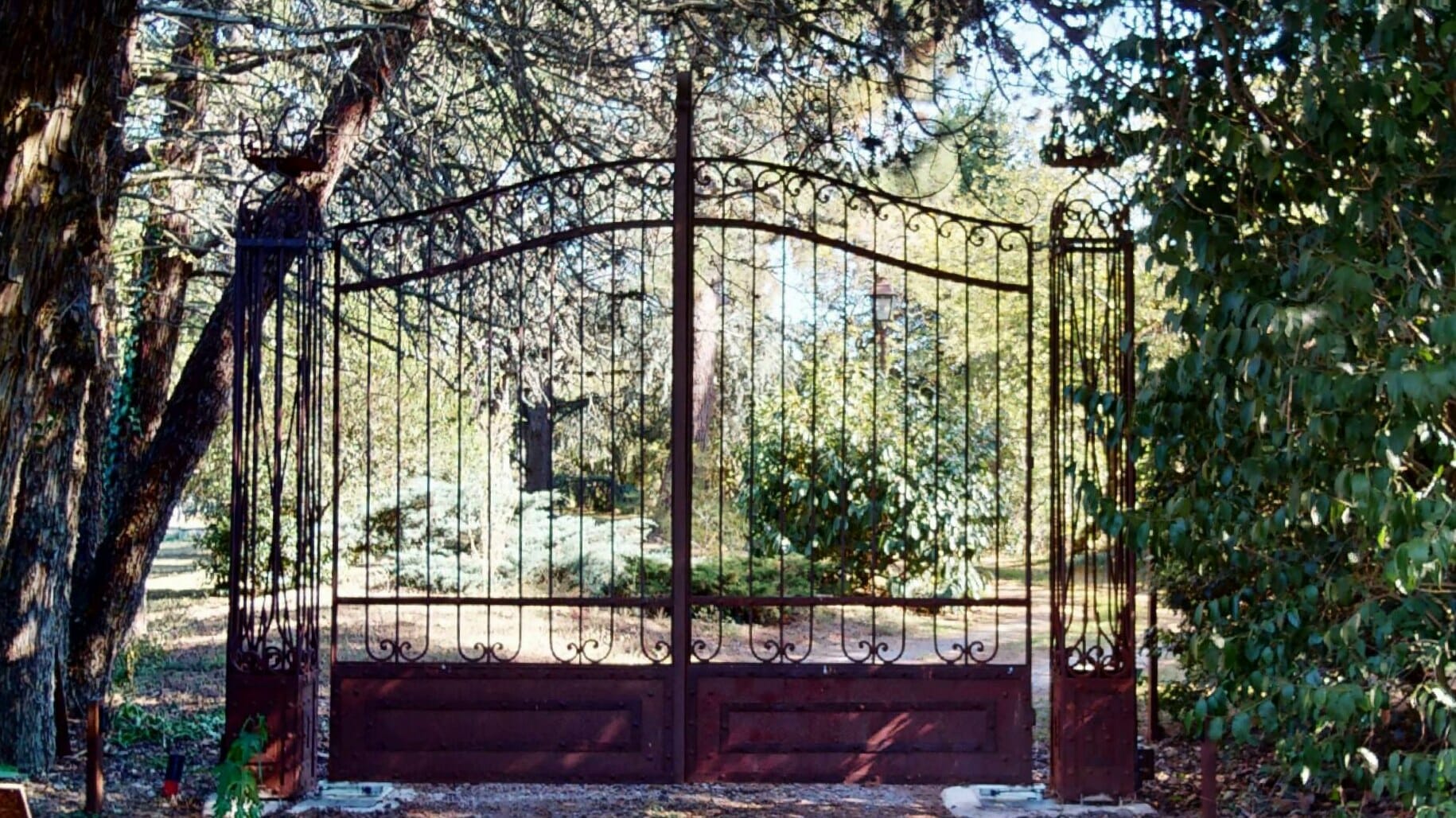 Le portail métallique semble ancré dans la terre même de la propriété, comme un passage entre deux mondes, celui du quotidien et celui de la sérénité, d’une nature grandiose, d’arbres quinquagénaires formant une garde respectueuse, comme pour protéger la demeure et ses occupants des aléas du monde extérieur.