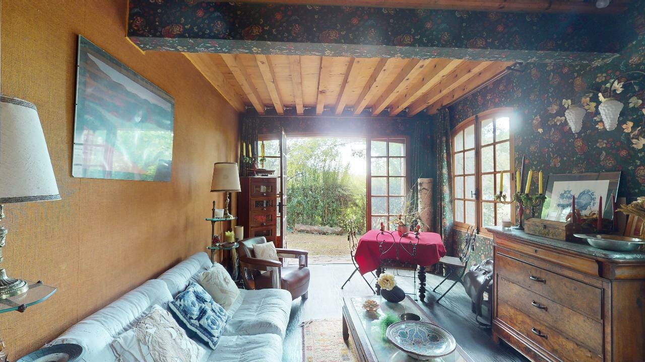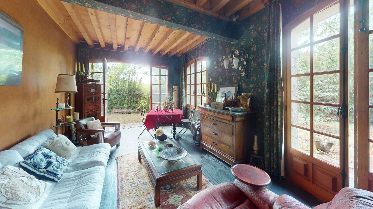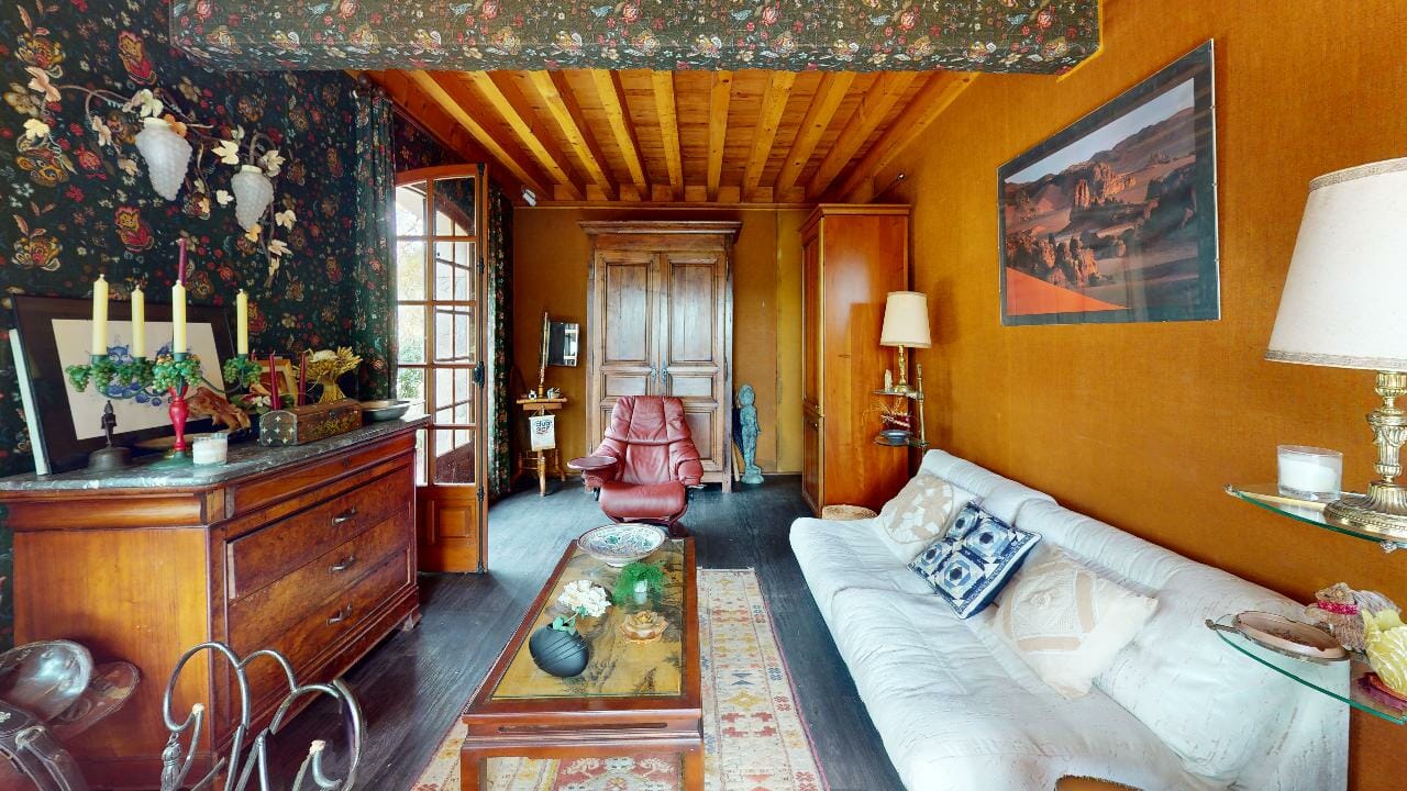 Dès l’entrée, on est frappé par l’abondance de lumière naturelle qui inonde la pièce. Grâce à de grandes fenêtres s’ouvrant sur l’arrière du jardin, le salon baigne dans une clarté douce et bienveillante, amplifiant ainsi son caractère chaleureux.