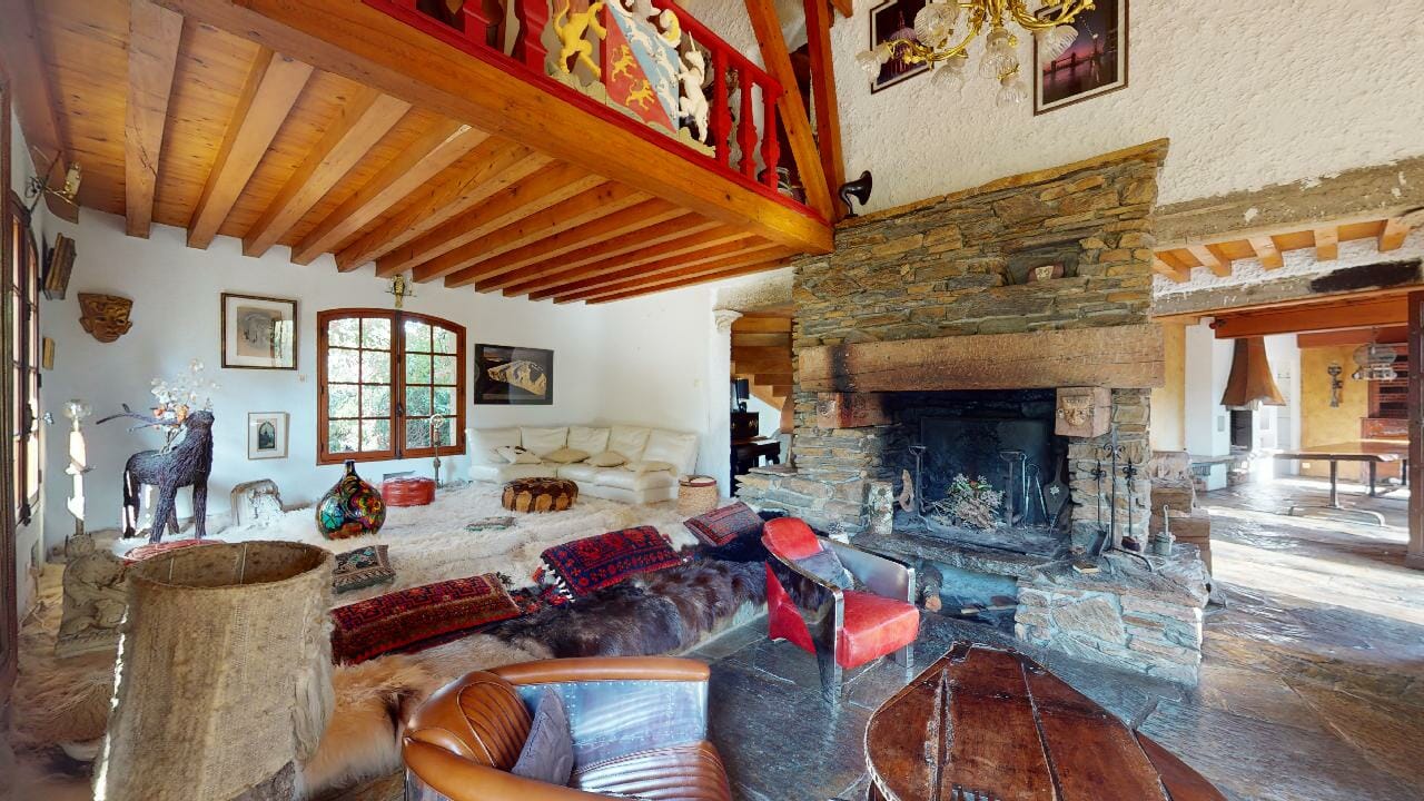 Au centre de la pièce, trône une cheminée double foyer traversant. Ce bijou architectural non seulement procure une chaleur enveloppante, mais offre également un spectacle flamboyant visible aussi bien depuis la salle à manger que la cuisine, ainsi la cheminée est un élément central de convivialité entre les 2 pièces.