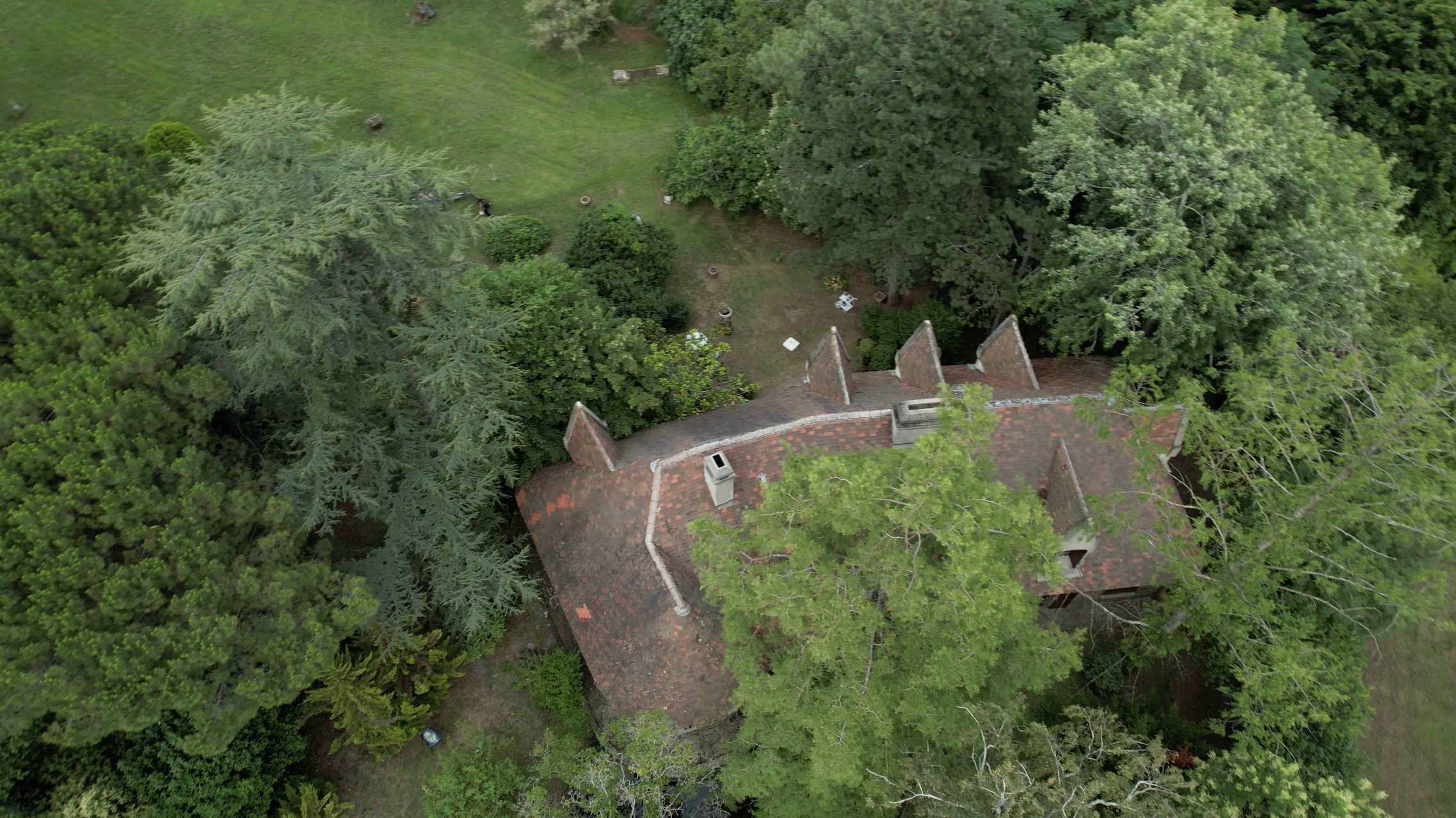 Au fur et à mesure de la progression, le chemin révèle des points de vue soigneusement orchestrés, offrant des aperçus de la propriété qui se dévoile peu à peu, flirtant avec le mystère et la promesse d’une découverte majestueuse. Le bâtiment, inspiré des manoirs normands, se dessine en arrière-plan, une présence à la fois forte et discrète, entourée d’un écrin de verdure.