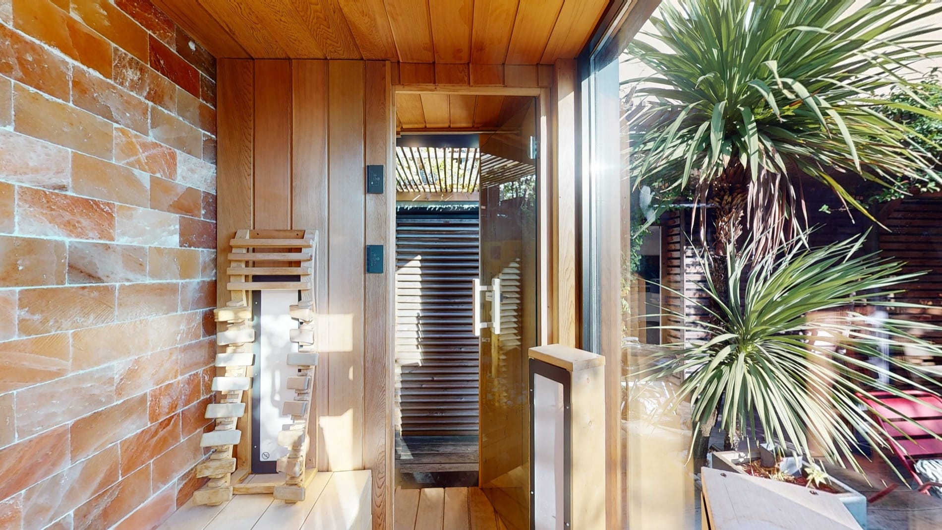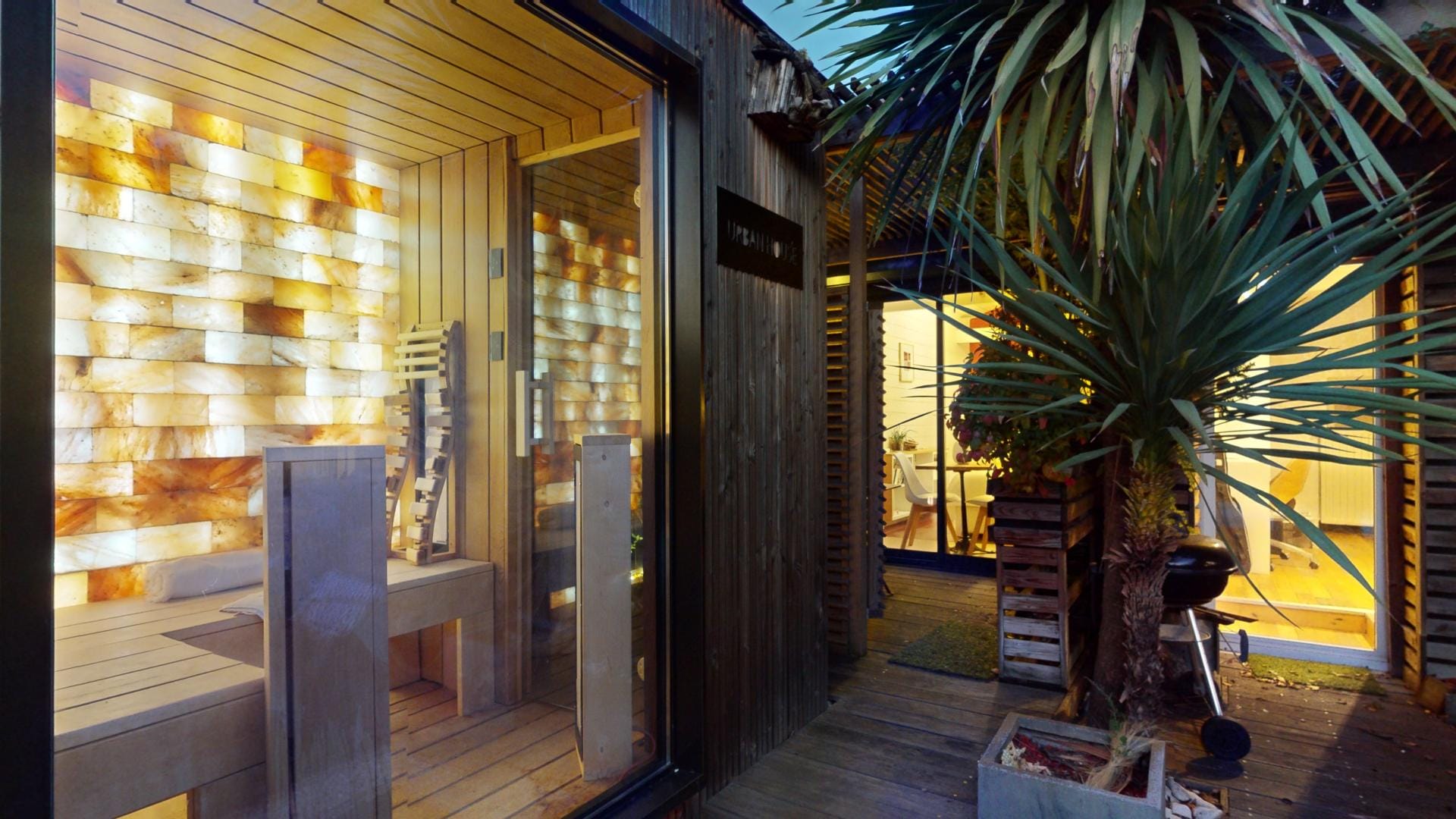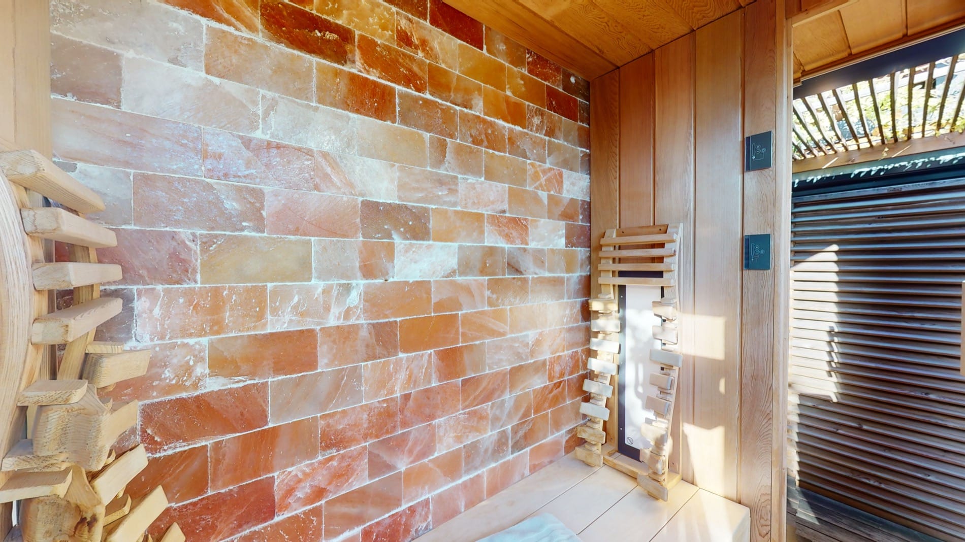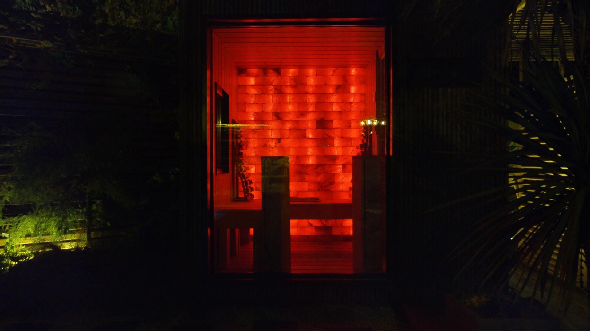 Sauna infrarouge chaleur instantanée autour des 40° avec mur de briques de “Sel de l’Himalaya” rétro-éclairé.