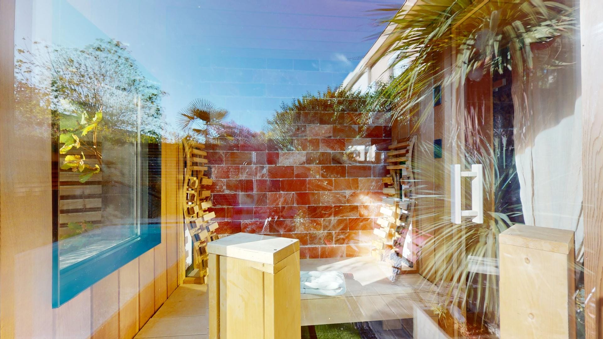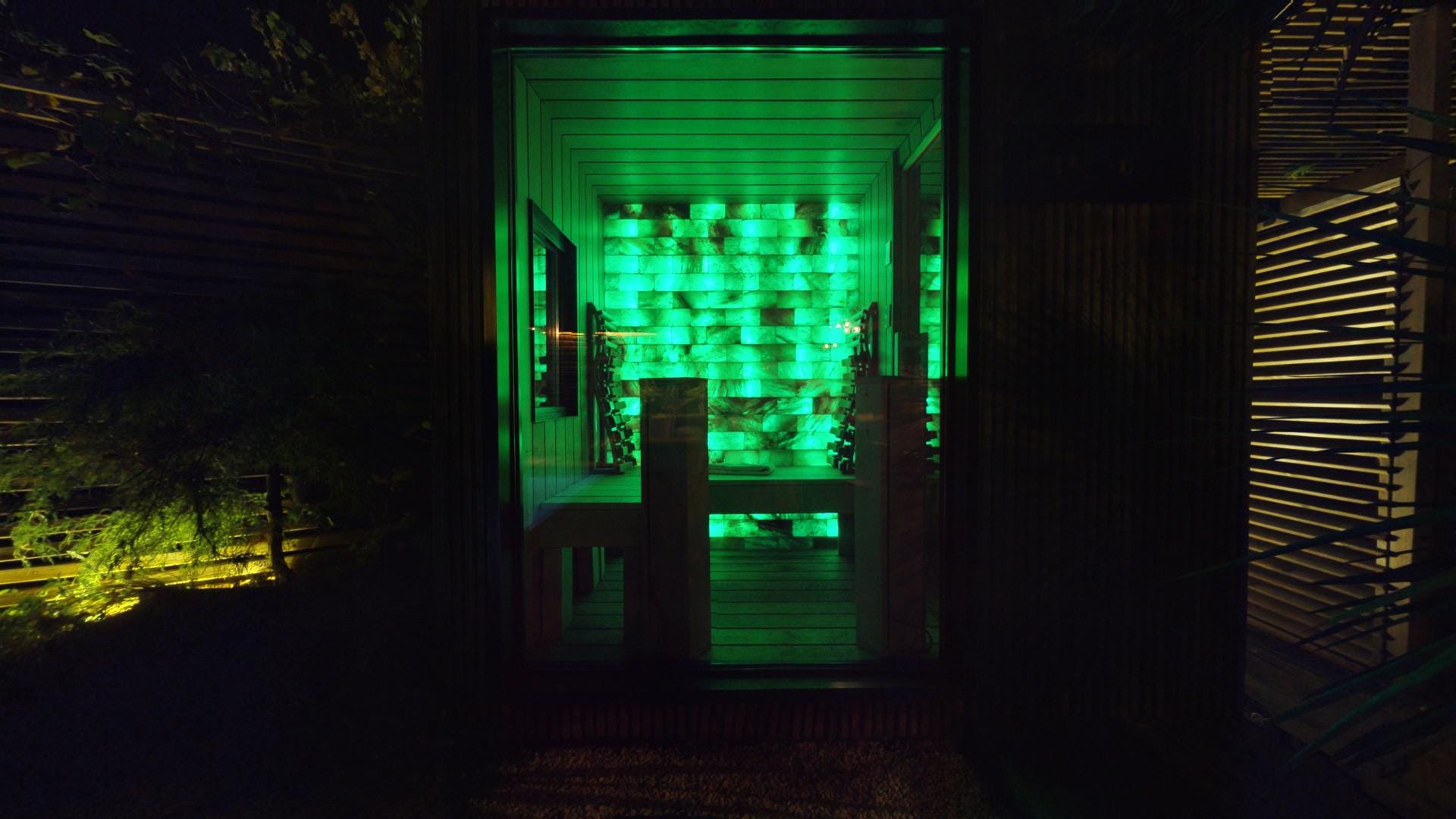 Relaxation, élimination, détox, avec une séance de Sauna lampes infra-rouge long équivalent onde bénéfique courbe C du soleil, mur rétro-éclairé en brique de sel de l’Himalaya.
