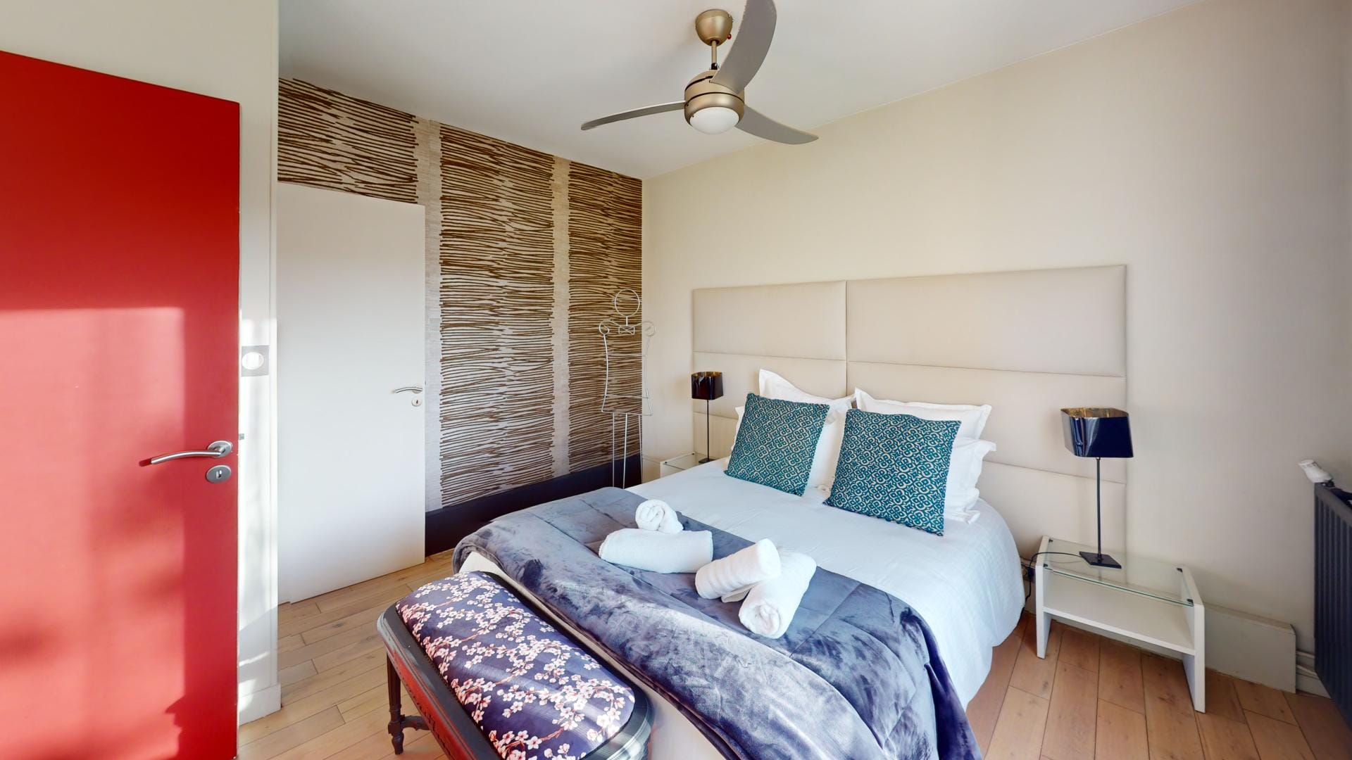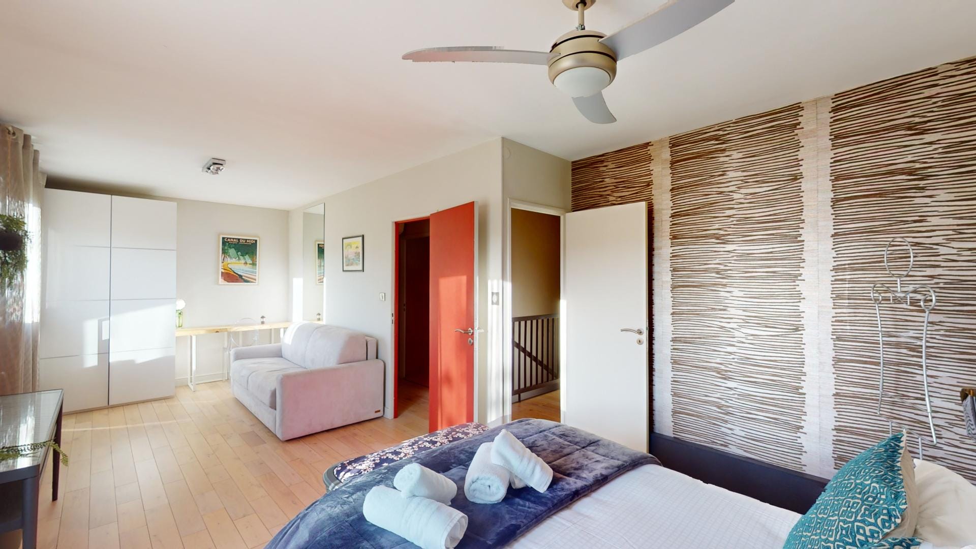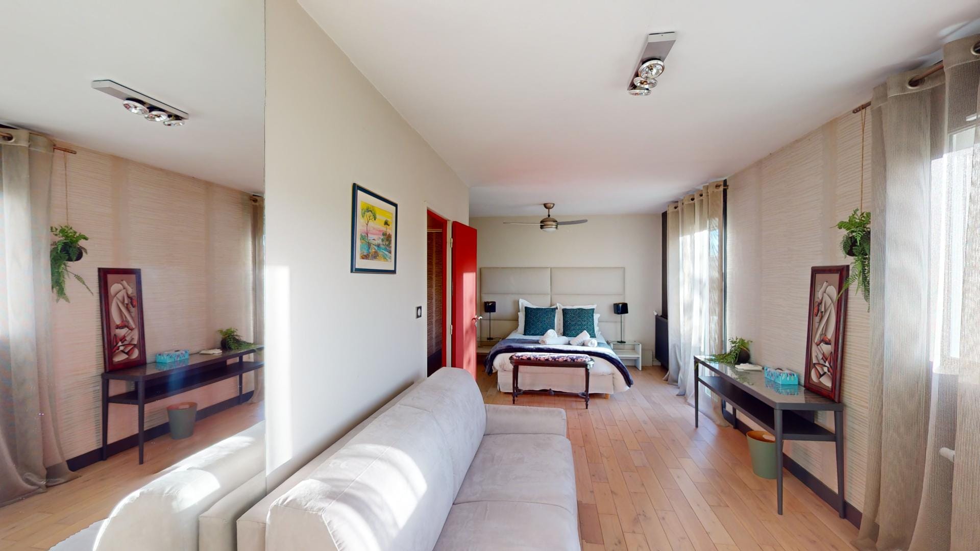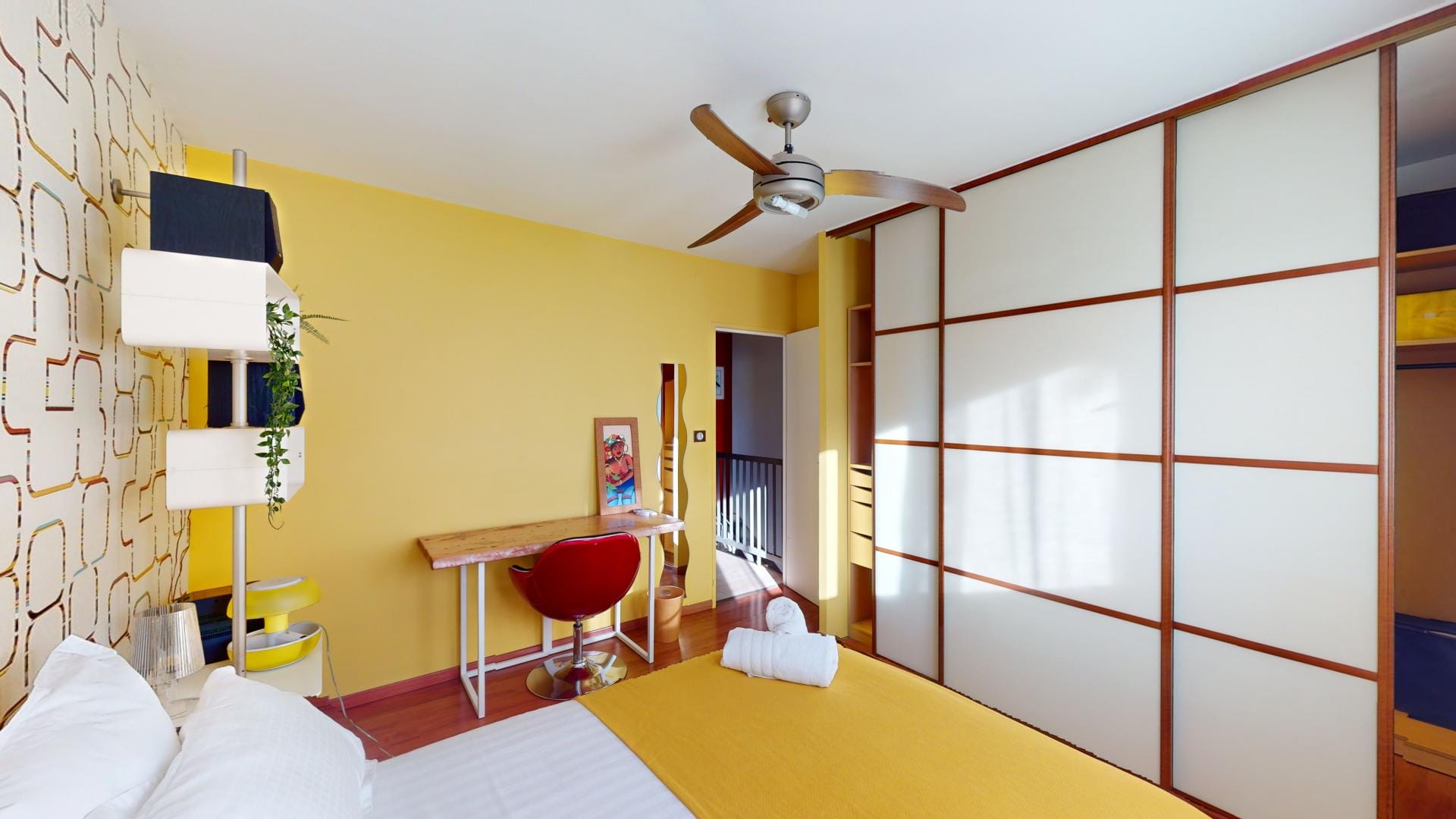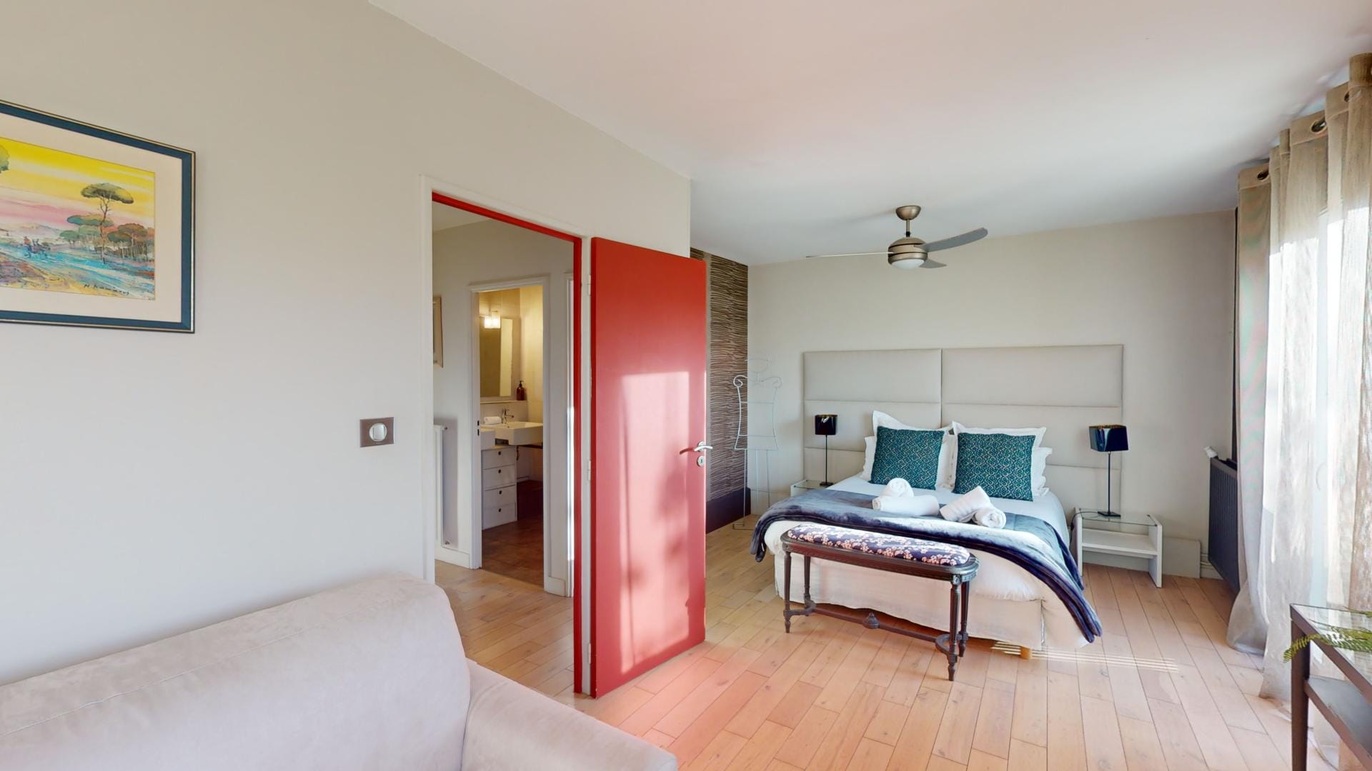 Designé Eighties’s, le style de cette chambre reste pourtant dans un esprit contemporain. Une belle luminosité, un espace confortable, le point fort de cette pièce est sans aucun doute le dressing spacieux dont elle dispose…