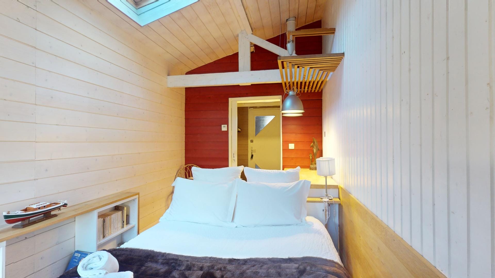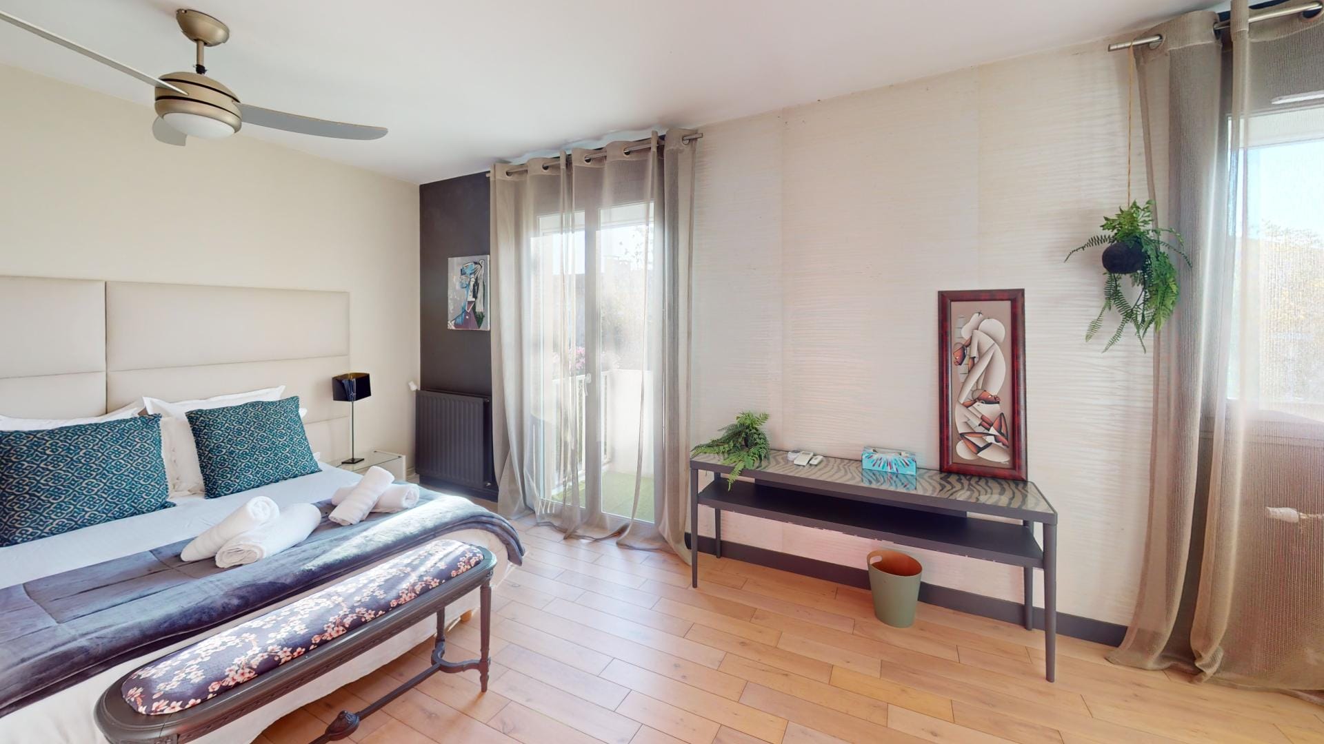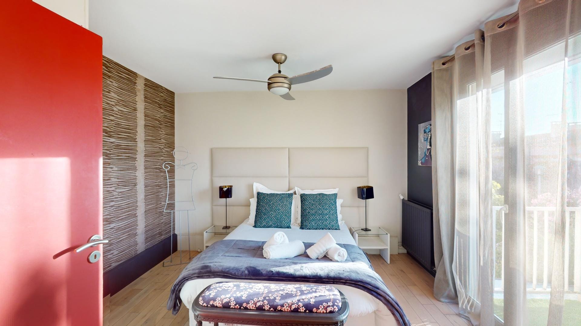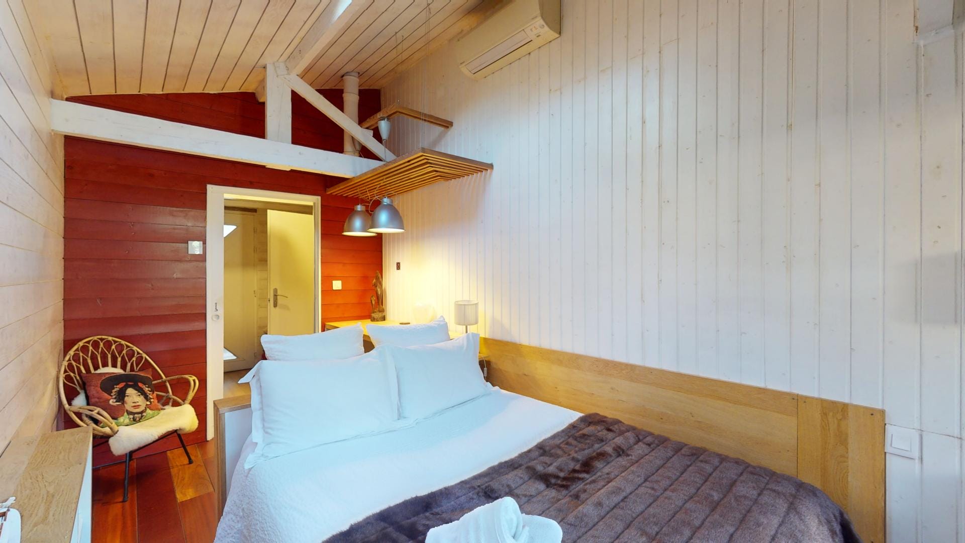 Designé Eighties’s, le style de cette chambre reste pourtant dans un esprit contemporain. Une belle luminosité, un espace confortable, le point fort de cette pièce est sans aucun doute le dressing spacieux dont elle dispose…
