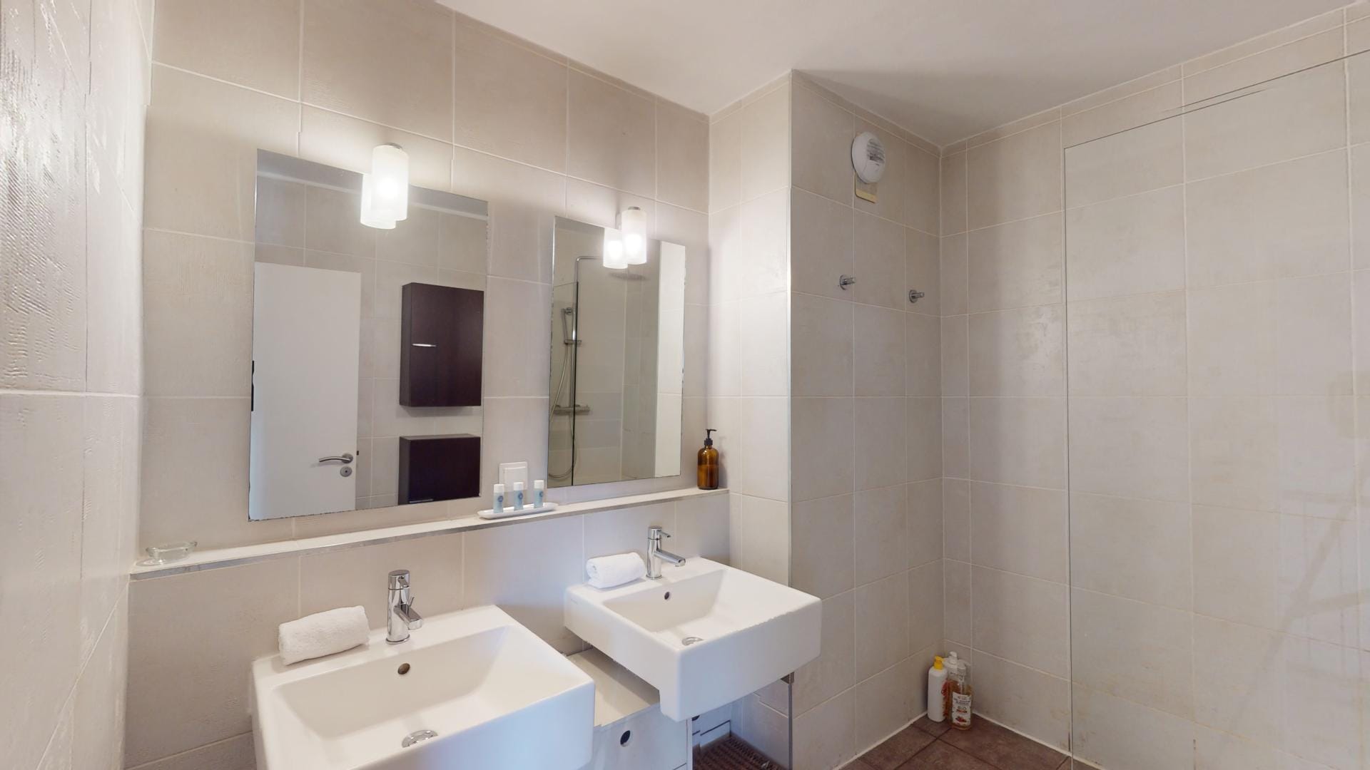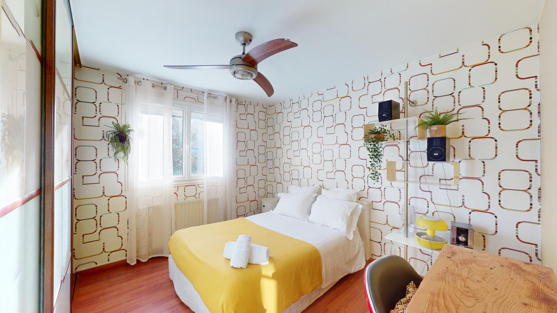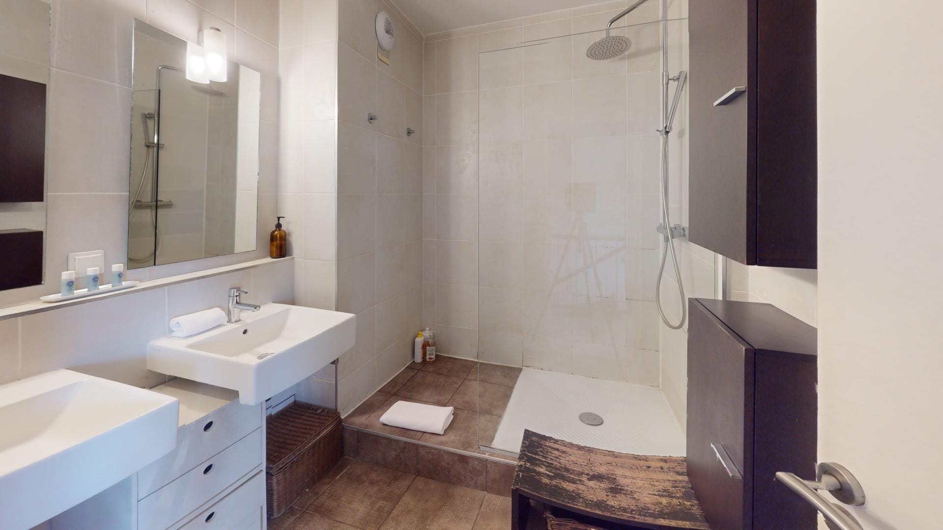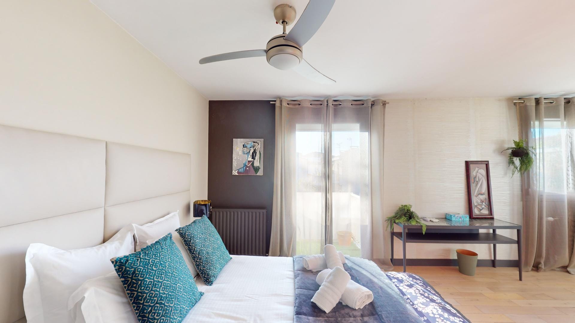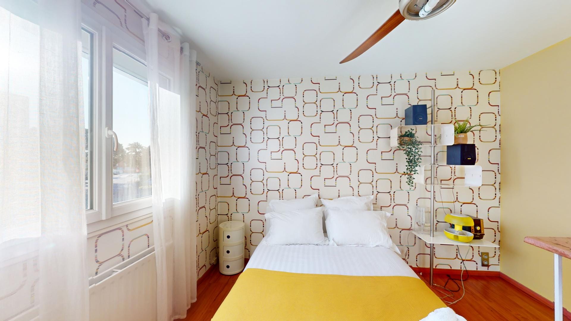 Designé Eighties’s, le style de cette chambre reste pourtant dans un esprit contemporain. Une belle luminosité, un espace confortable, le point fort de cette pièce est sans aucun doute le dressing spacieux dont elle dispose…