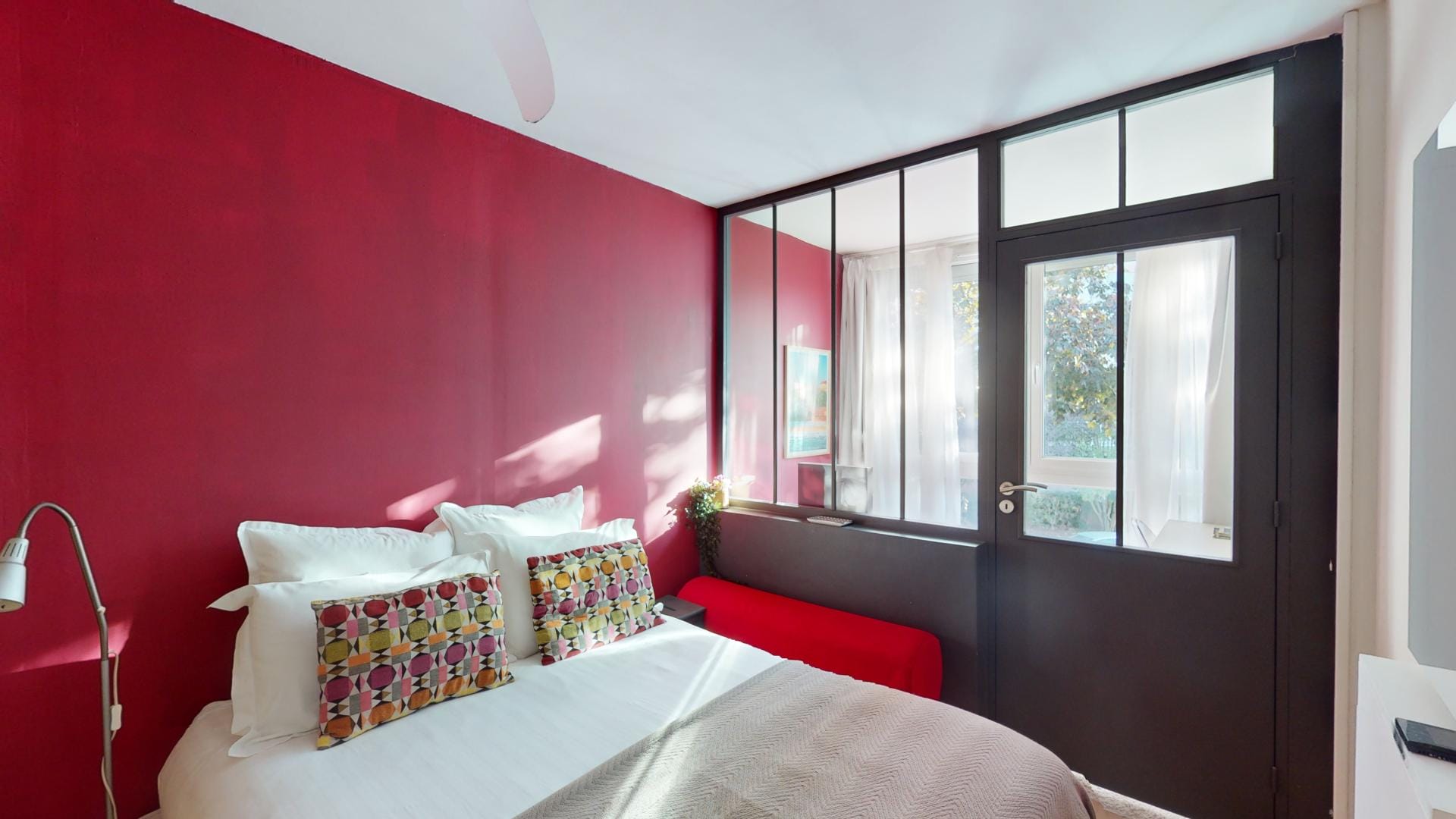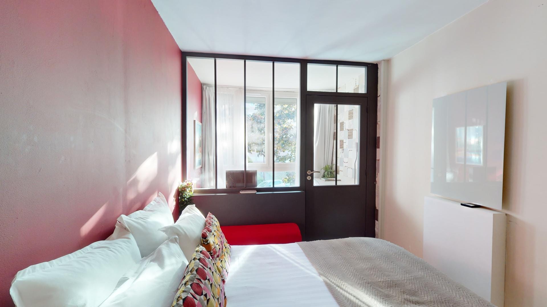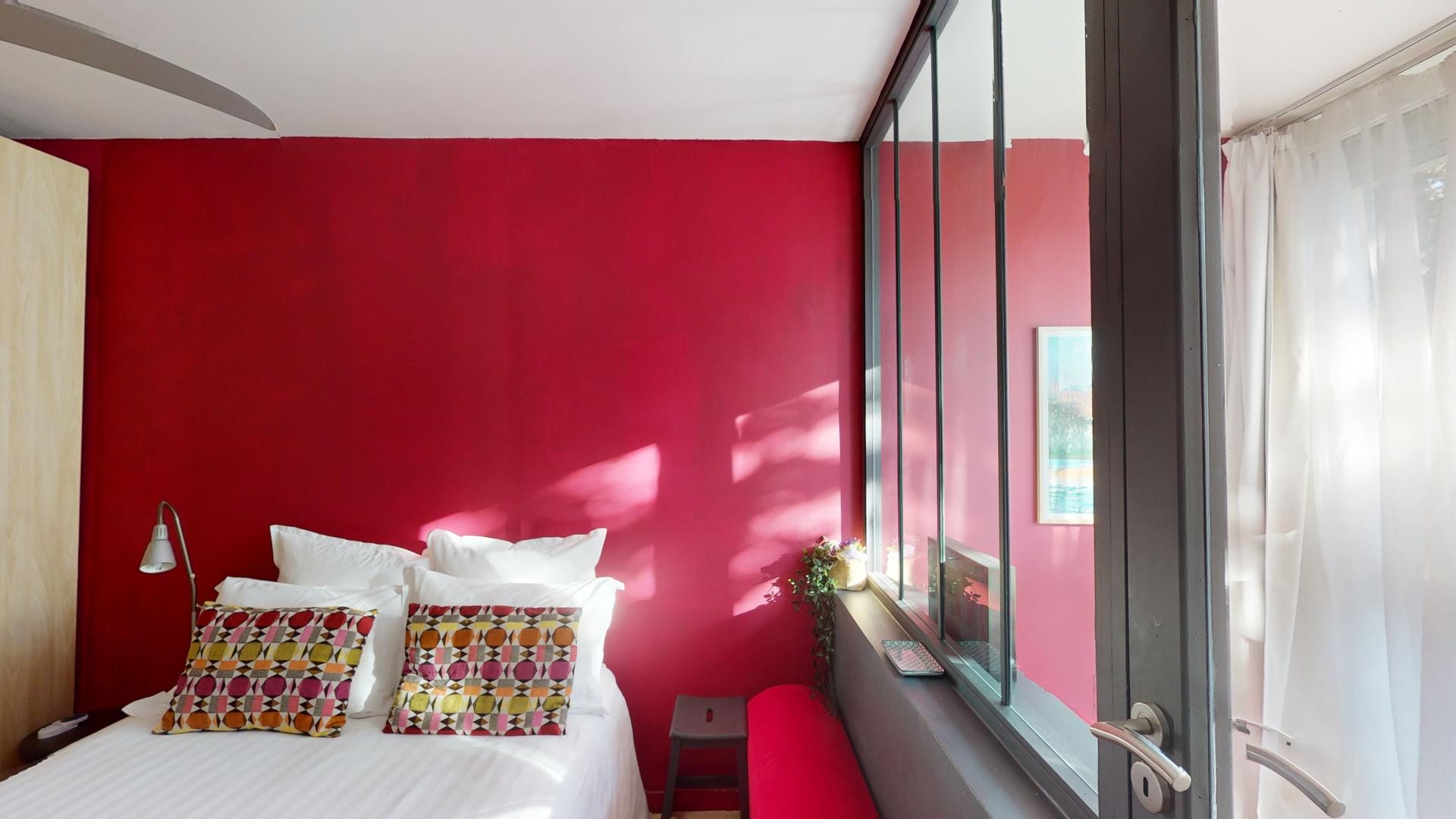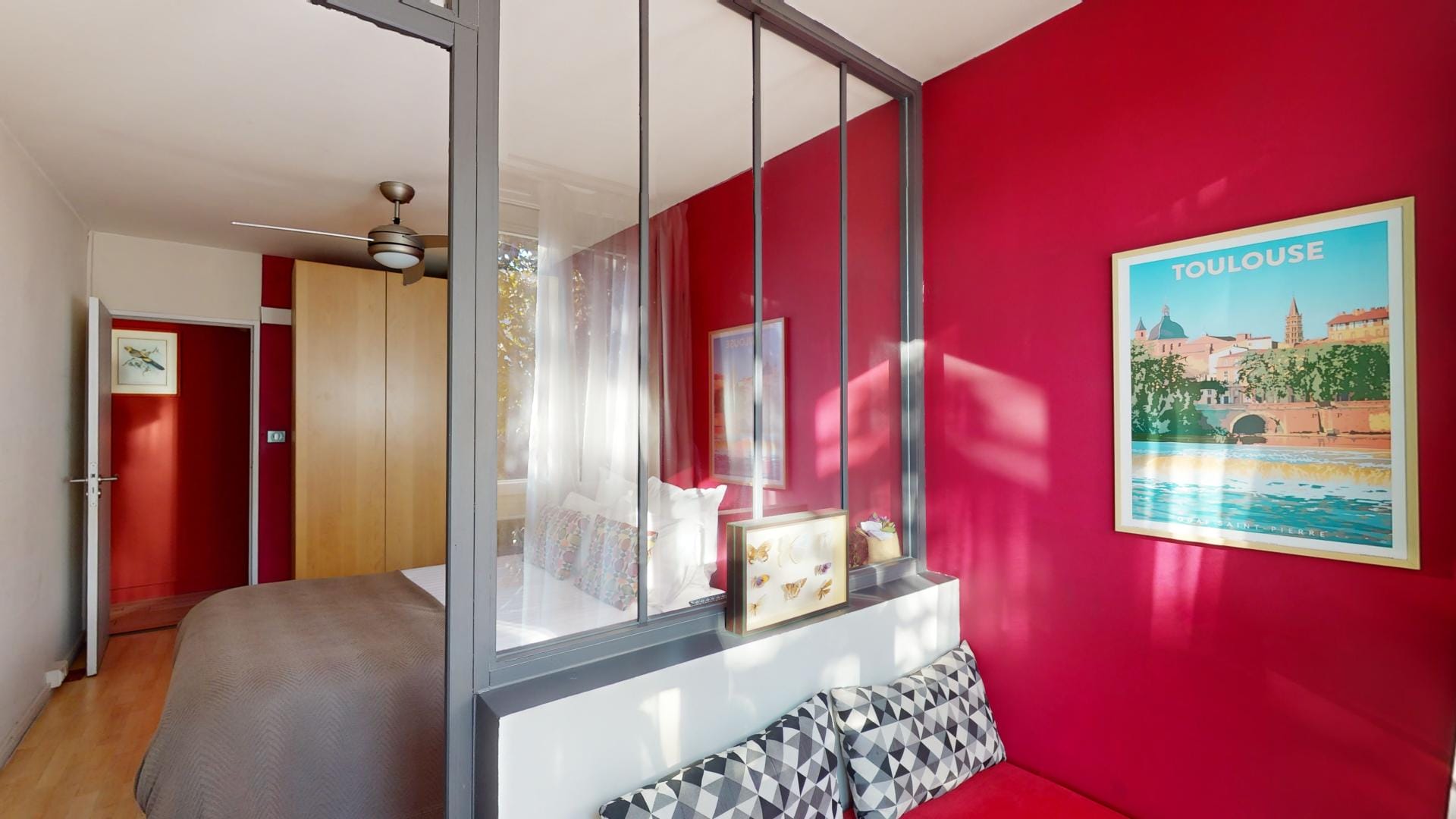Chambre framboise avec sa verrière, son espace rangement, espace nuit, et loggia fermée avec bureau et coin lecture.