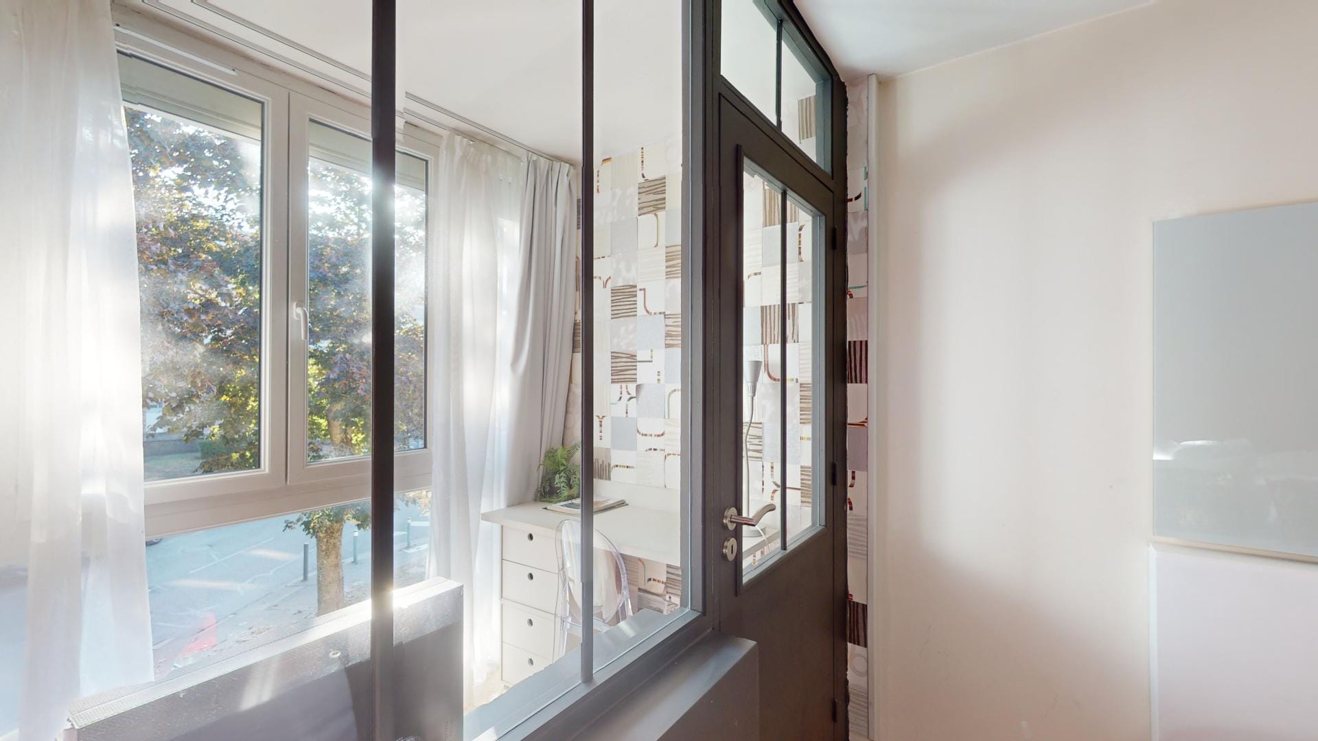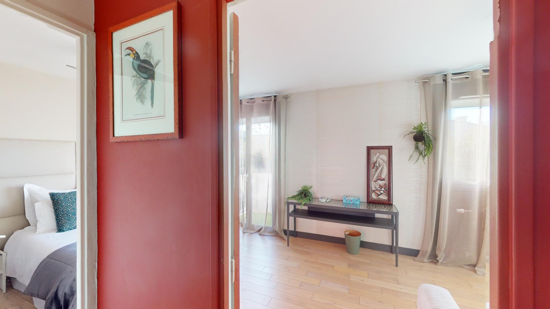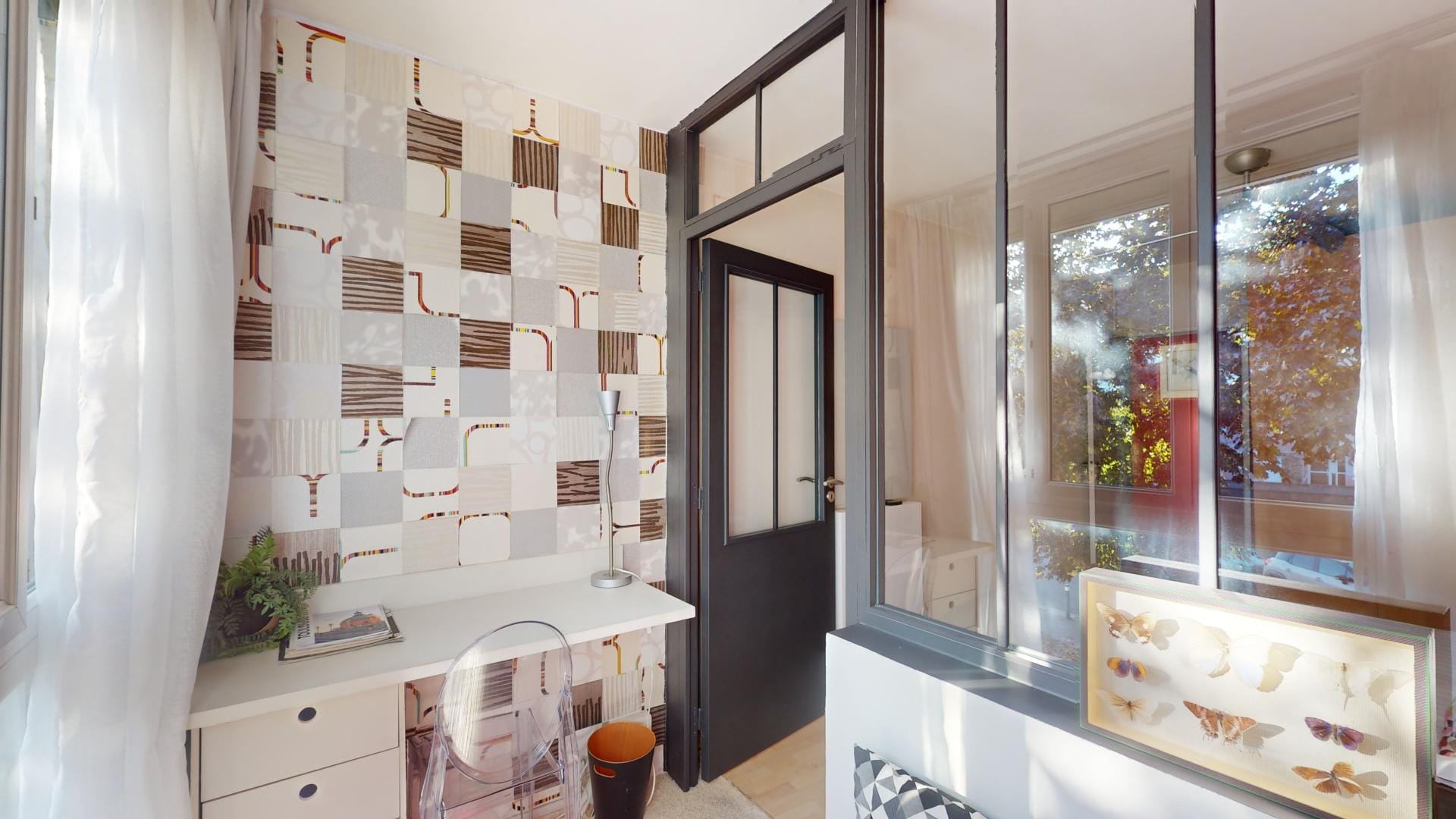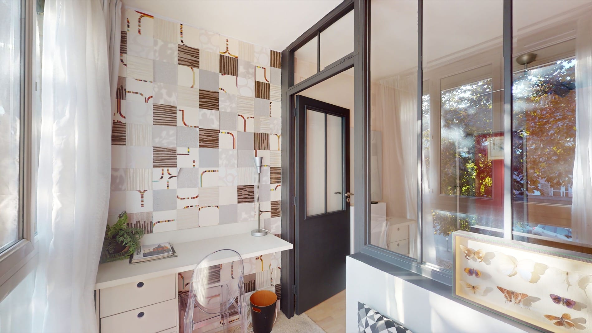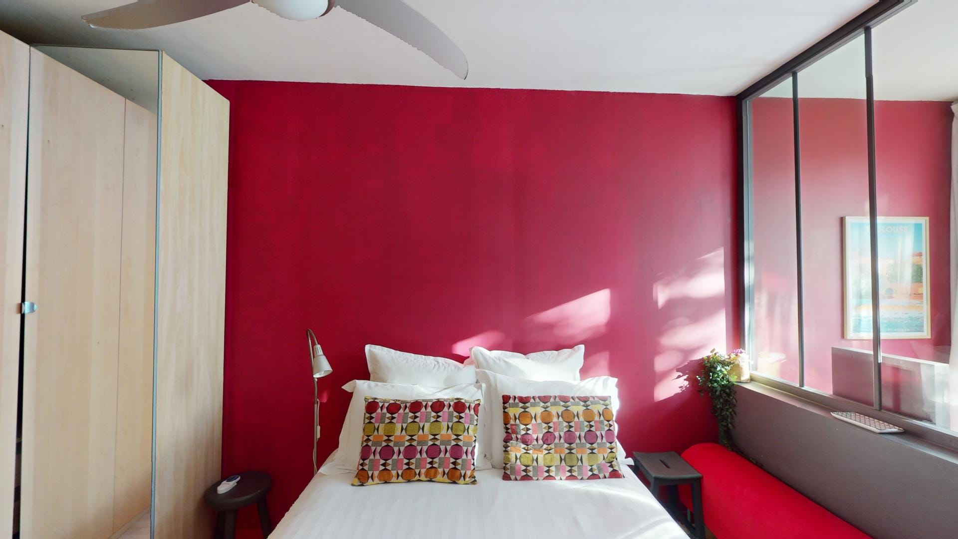 Chambre framboise avec sa verrière, son espace rangement, espace nuit, et loggia fermée avec bureau et coin lecture.