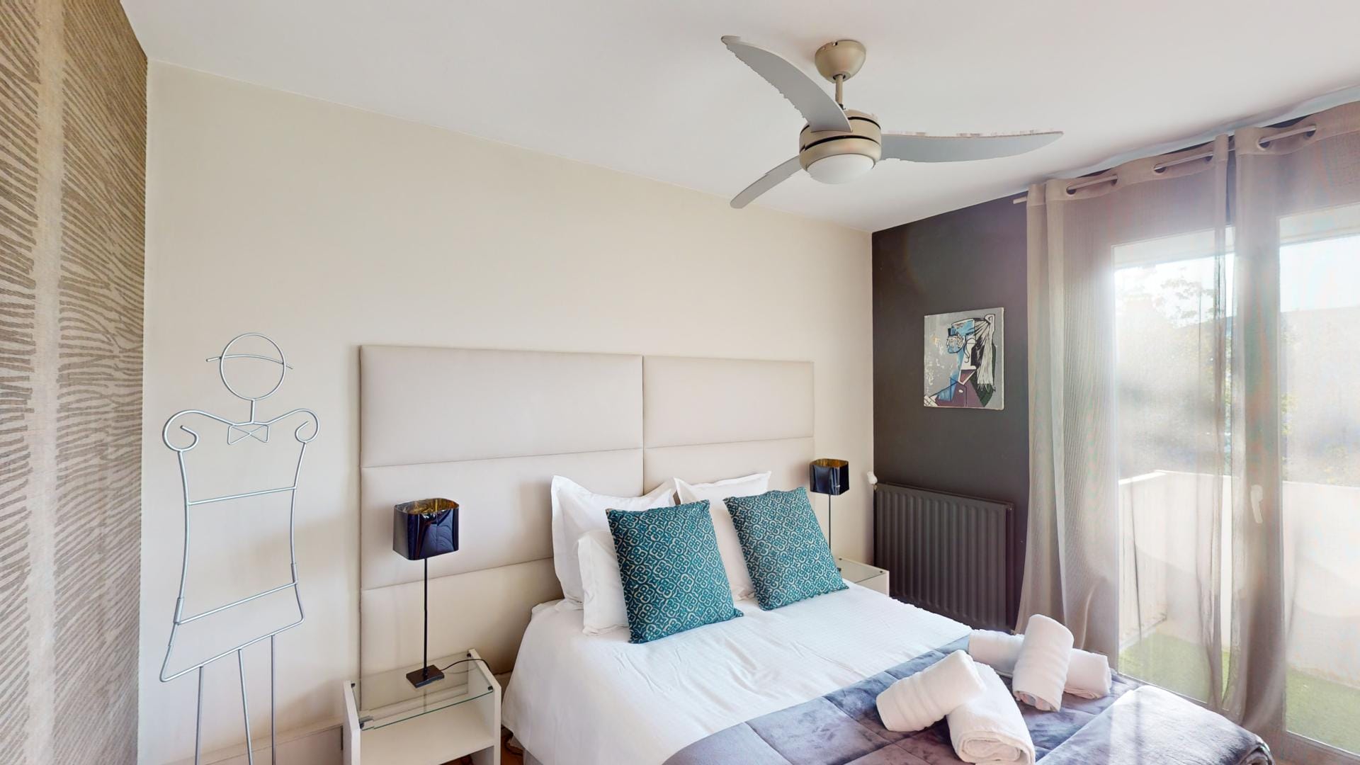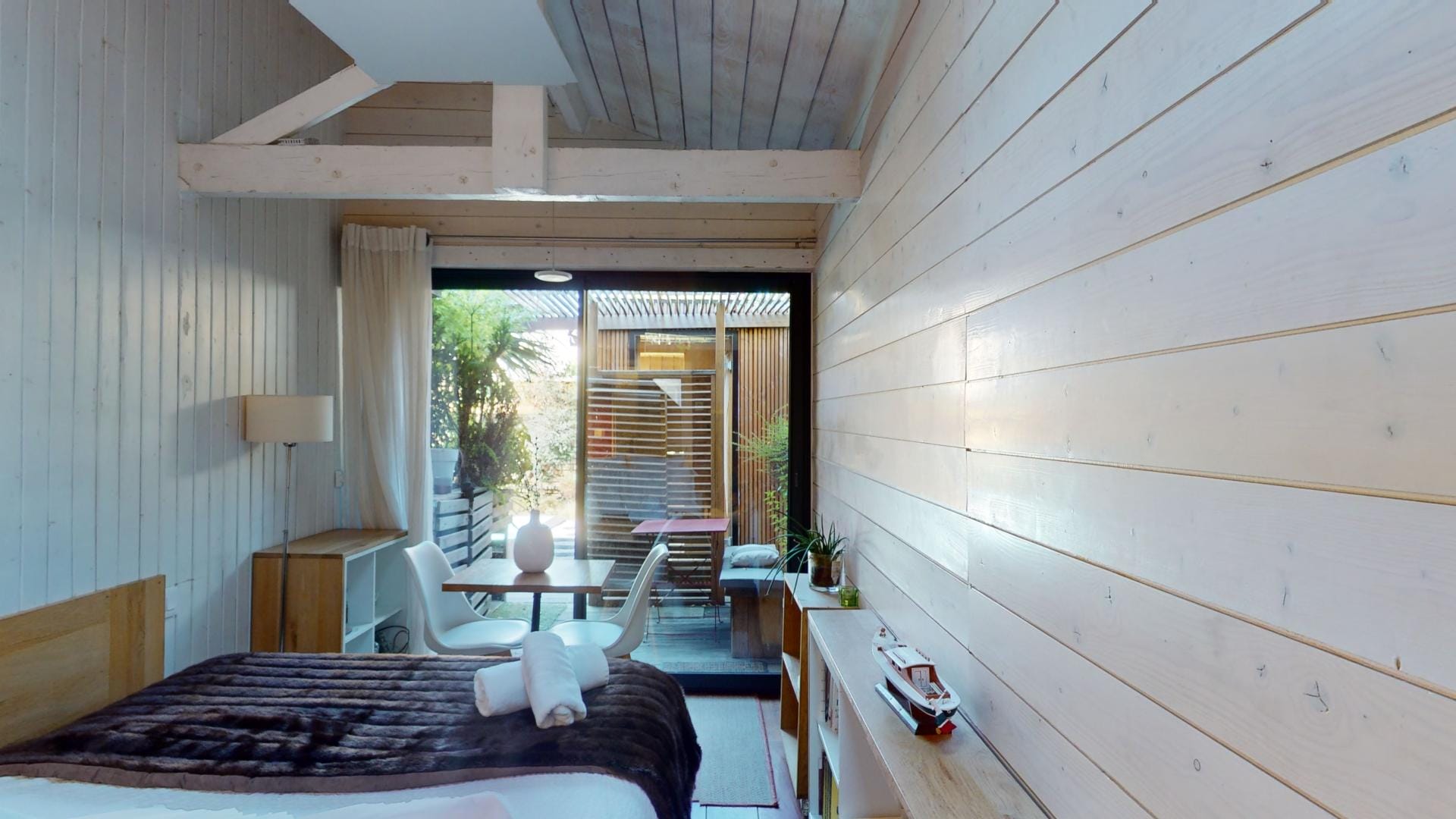 Située côté jardin cette chambre offre une vue sur le jardin. Son petit balcon recouvert de pelouse synthétique est une invitation à profiter de la lumière et du grand air.
