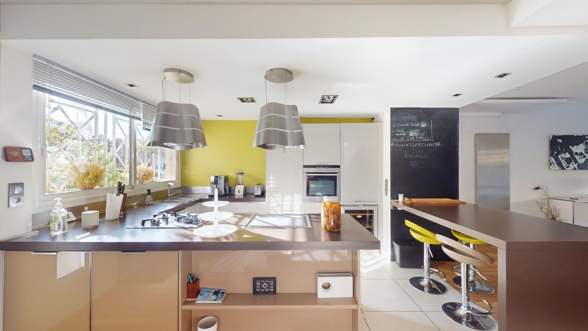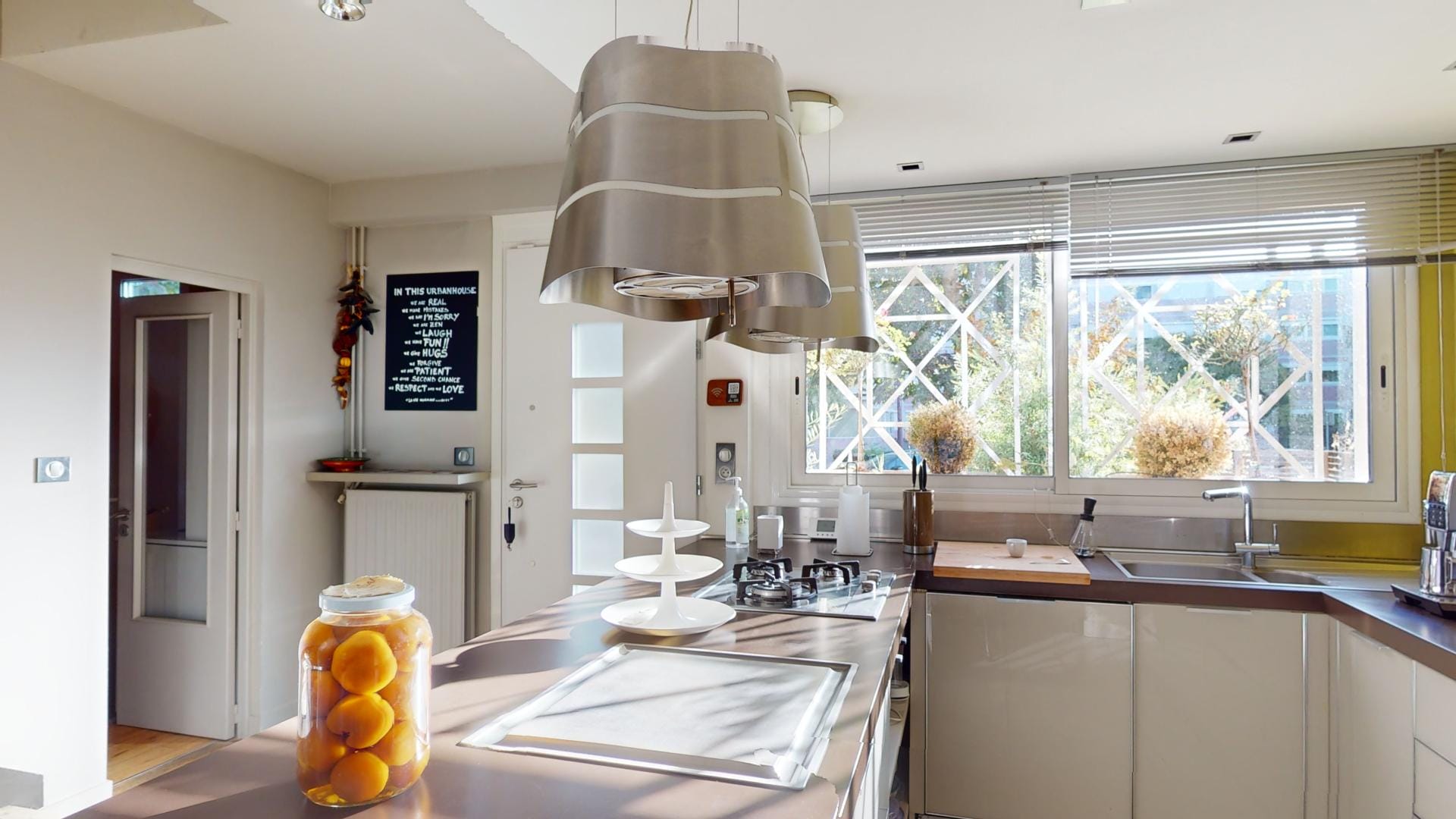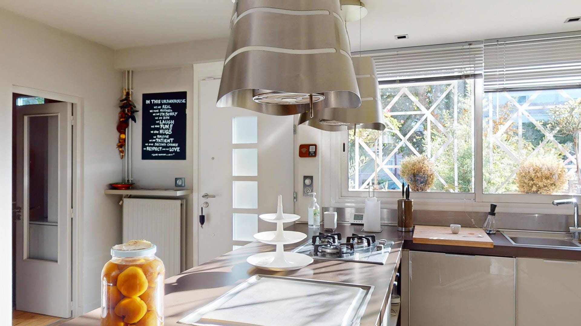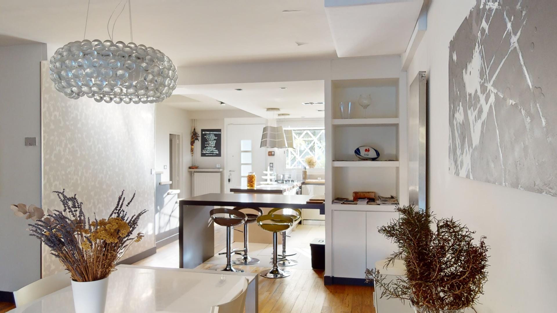 3 espaces en continuité Cuisine – Repas – Réception, même plan horizontal, séparés virtuellement par des axes verticaux comme radiateur mural en acier, mur tableau noir ou mur papier peint.