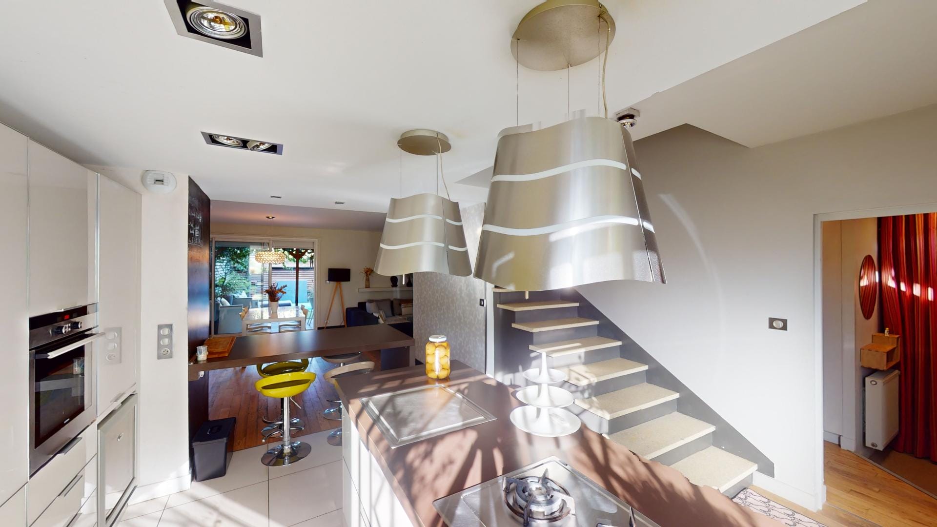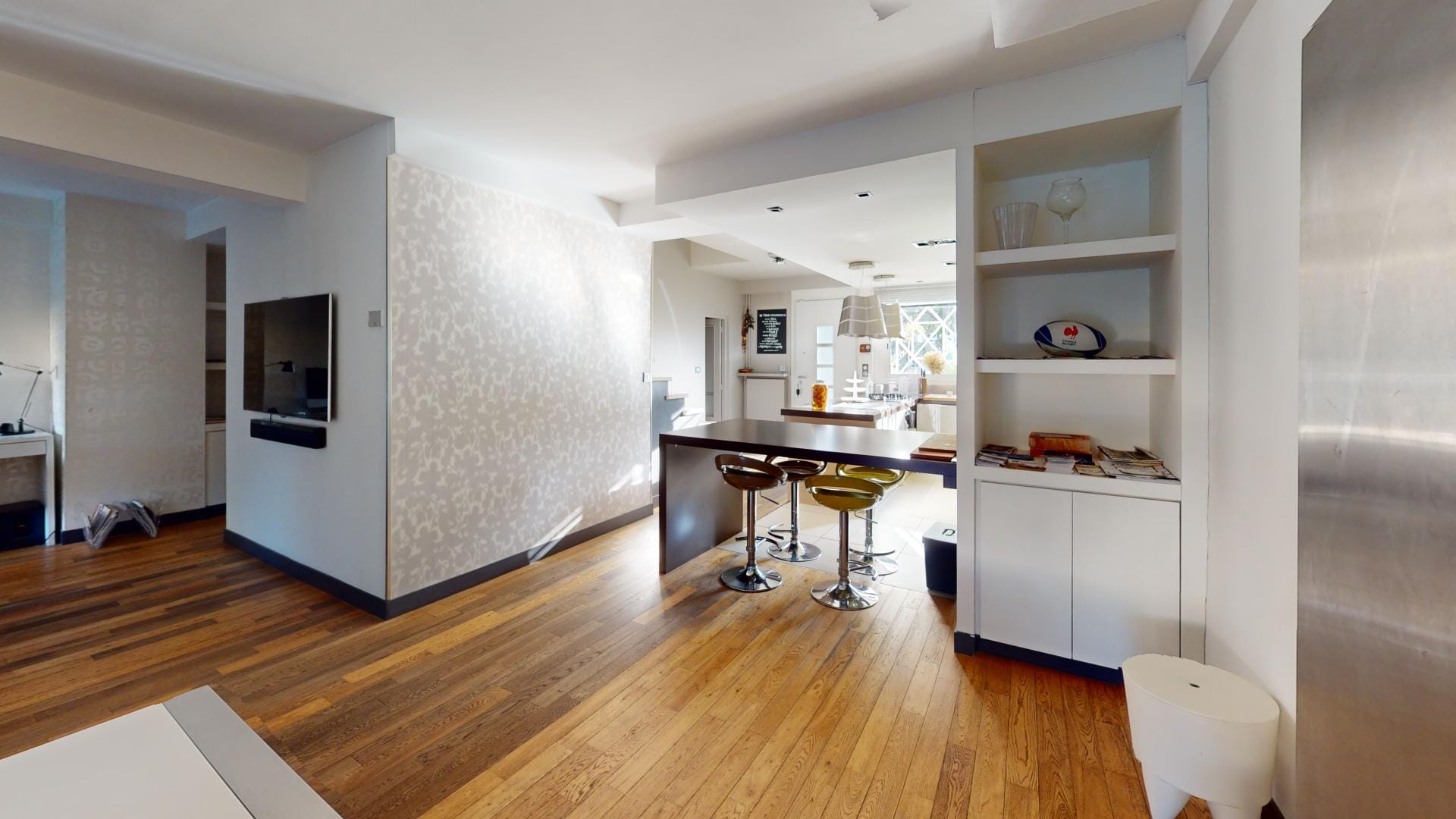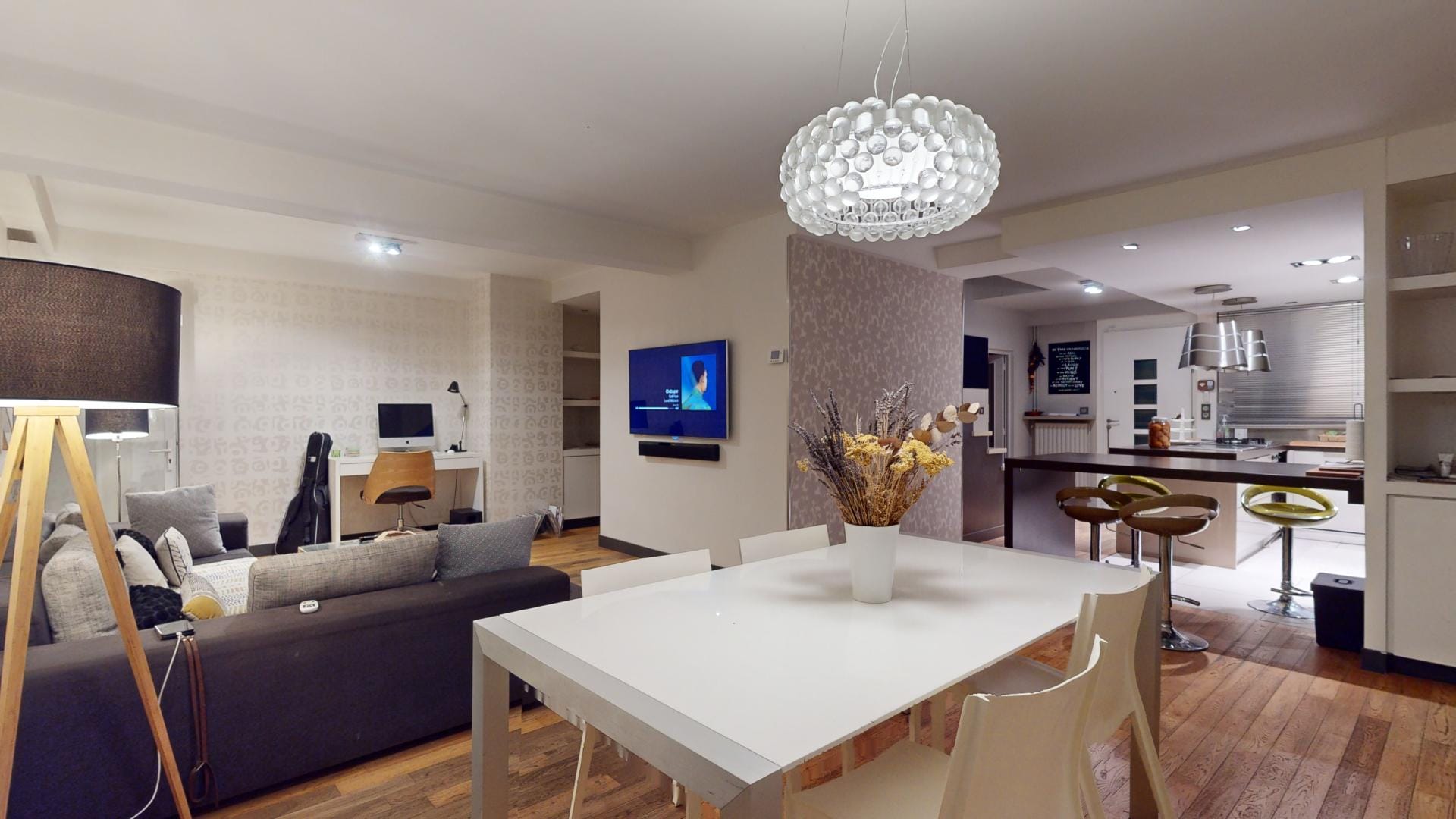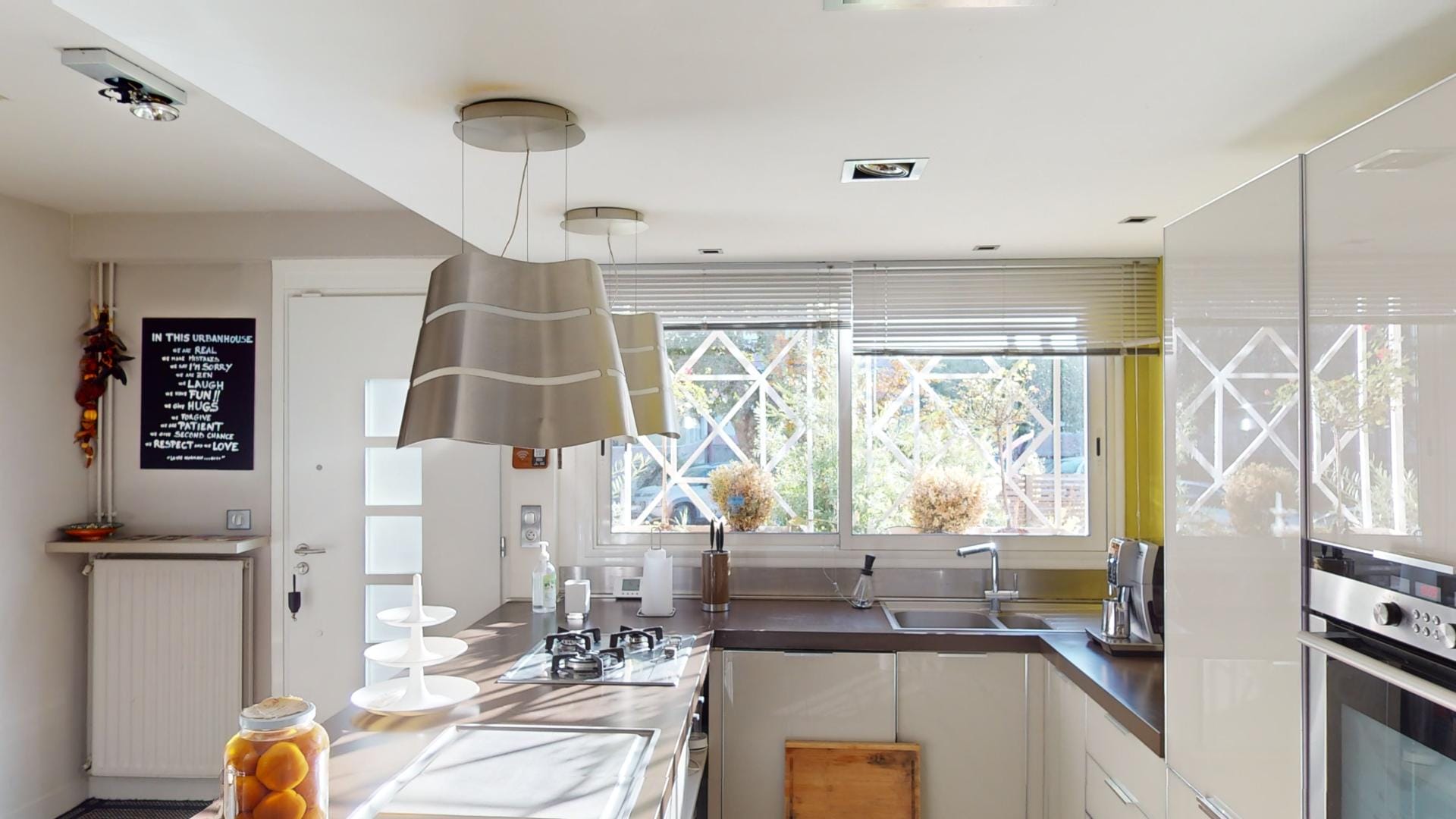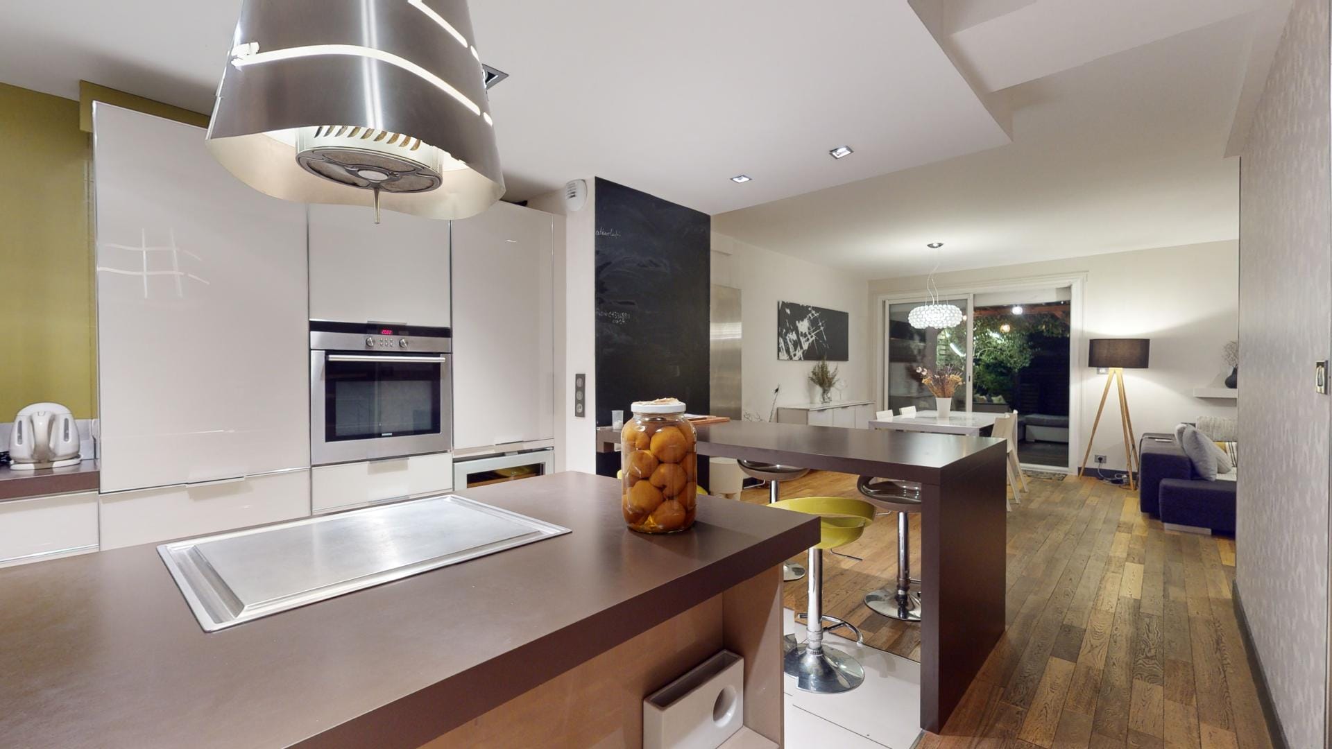 3 espaces en continuité Cuisine – Repas – Réception, même plan horizontal, séparés virtuellement par des axes verticaux comme radiateur mural en acier, mur tableau noir ou mur papier peint.