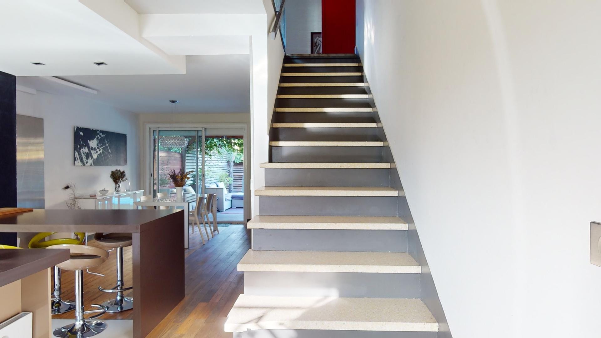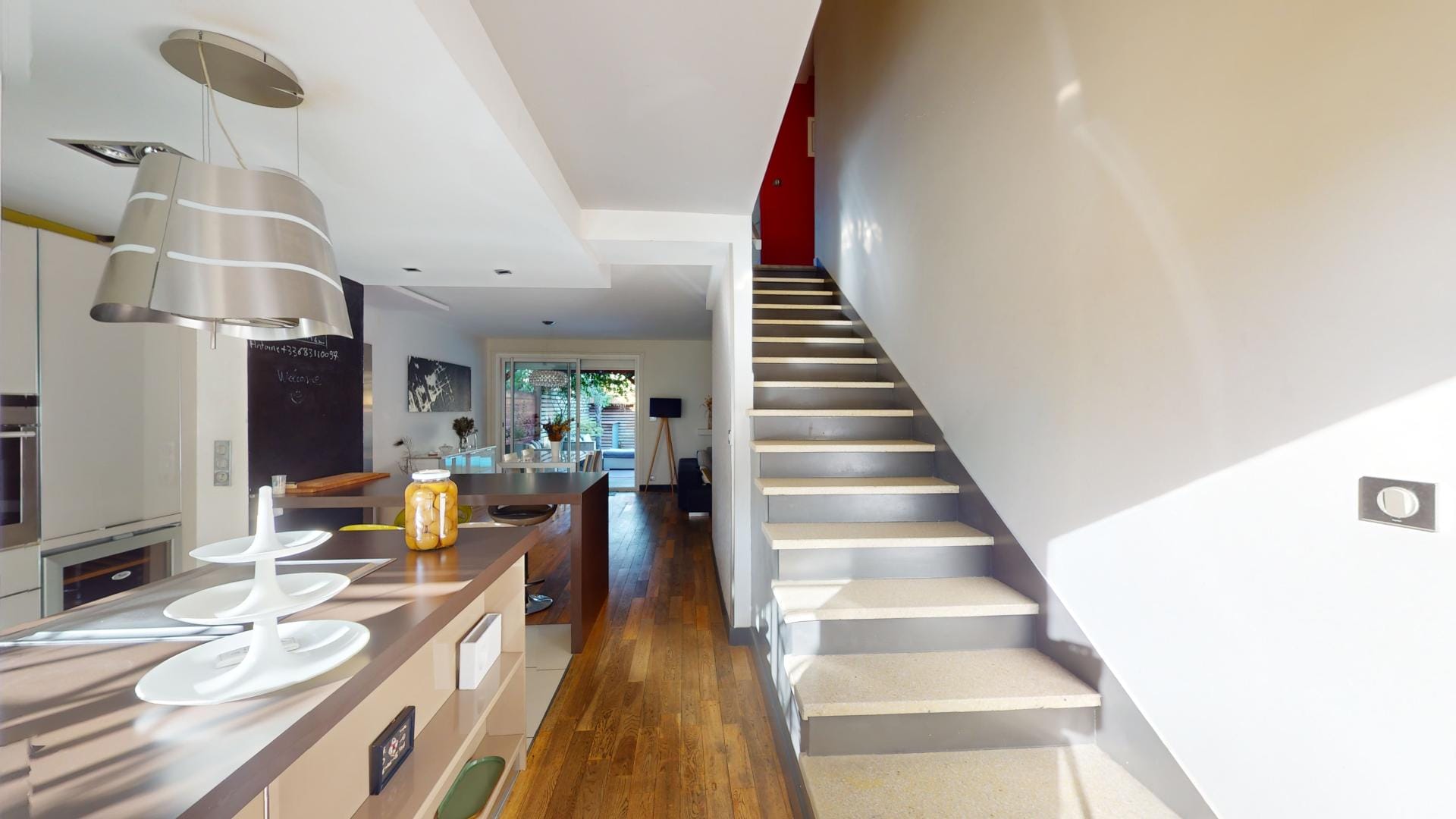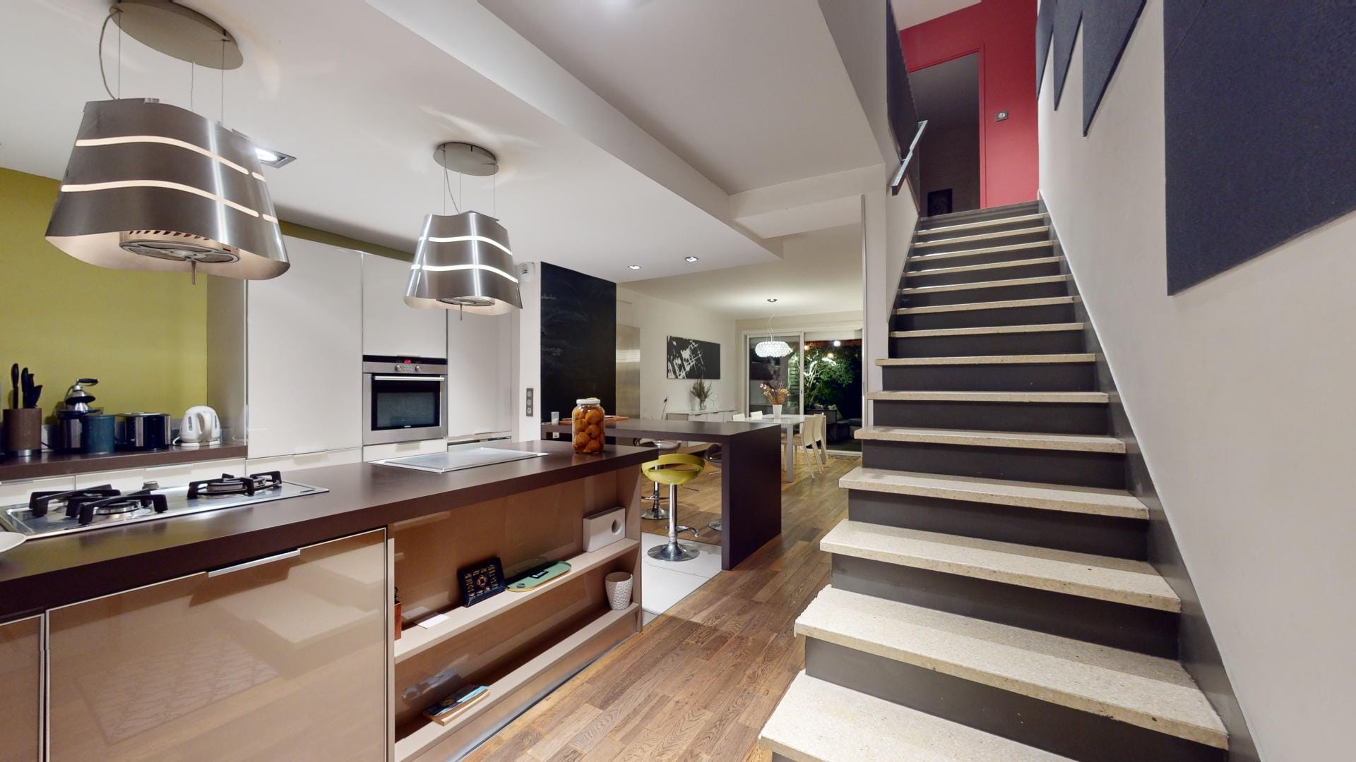 Intérieur contemporain, designé, axé sur l’usage et la circulation naturelle entre les espaces de vie de la maison.