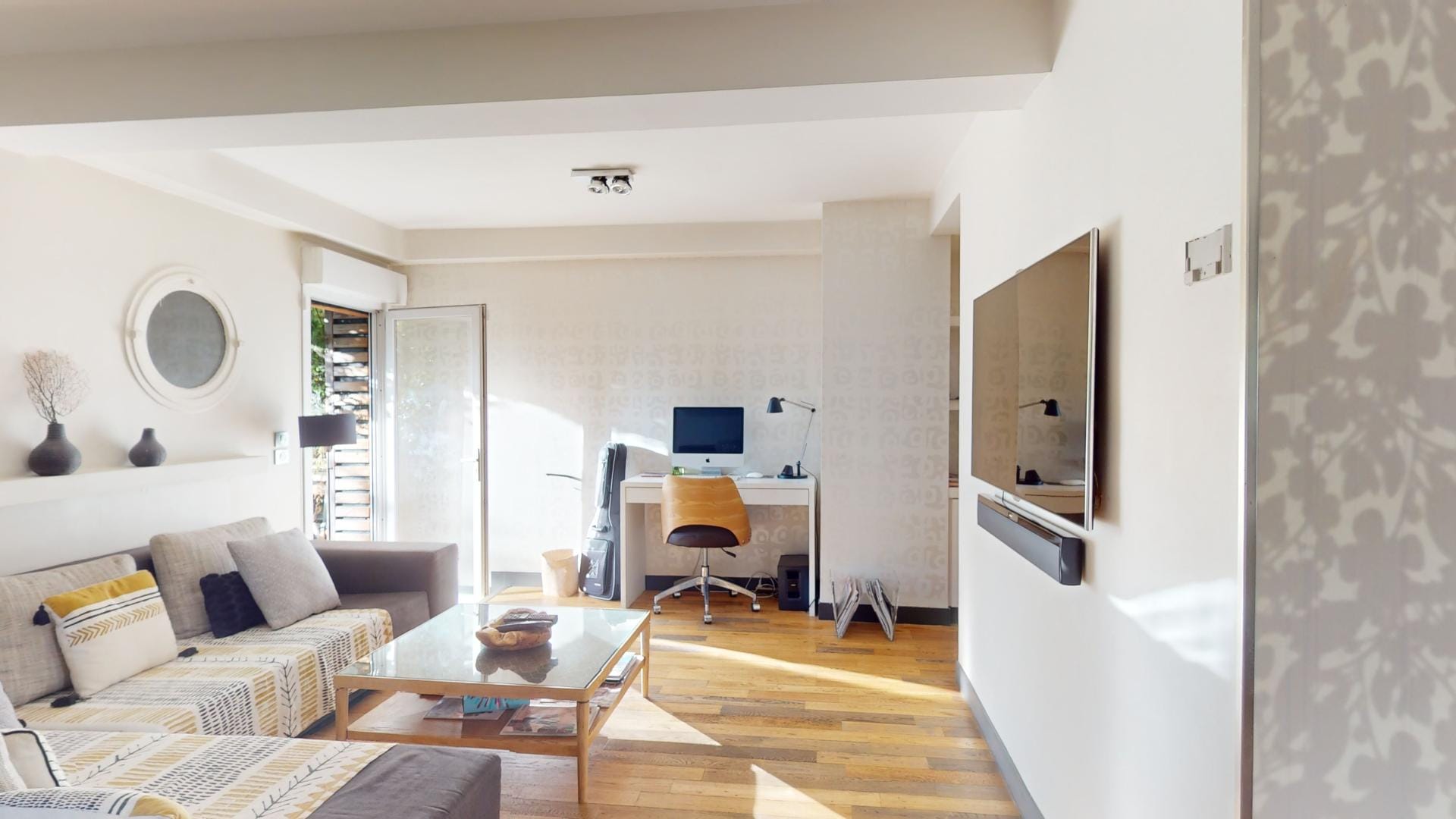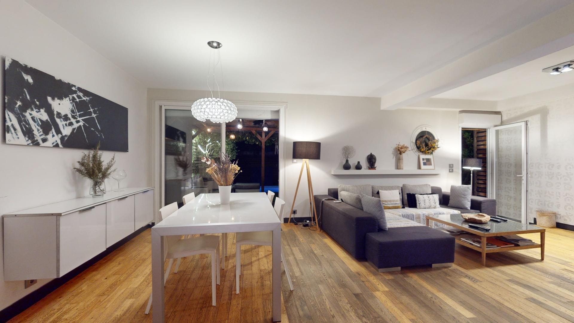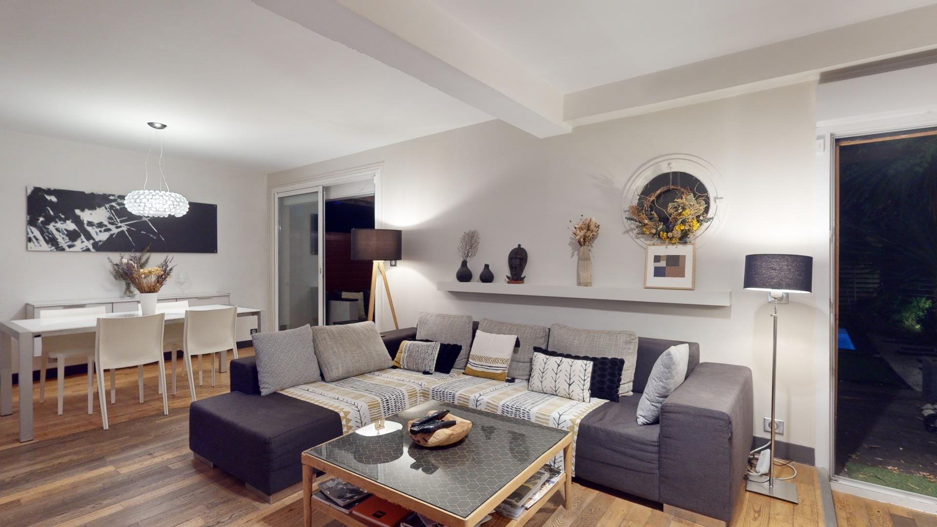 En prolongement de l’espace réception, le salon bénéficie de la lumière de deux portes fenêtres donnant sur le jardin.