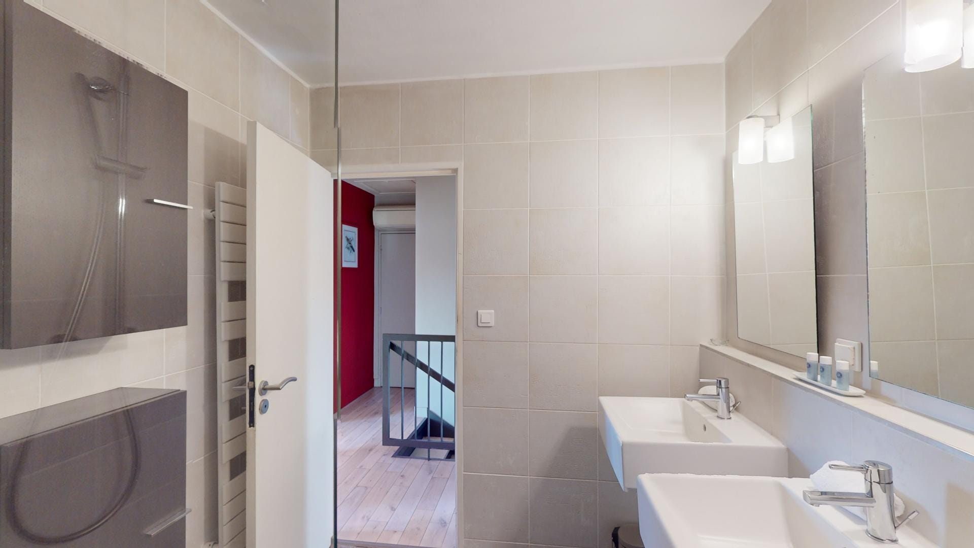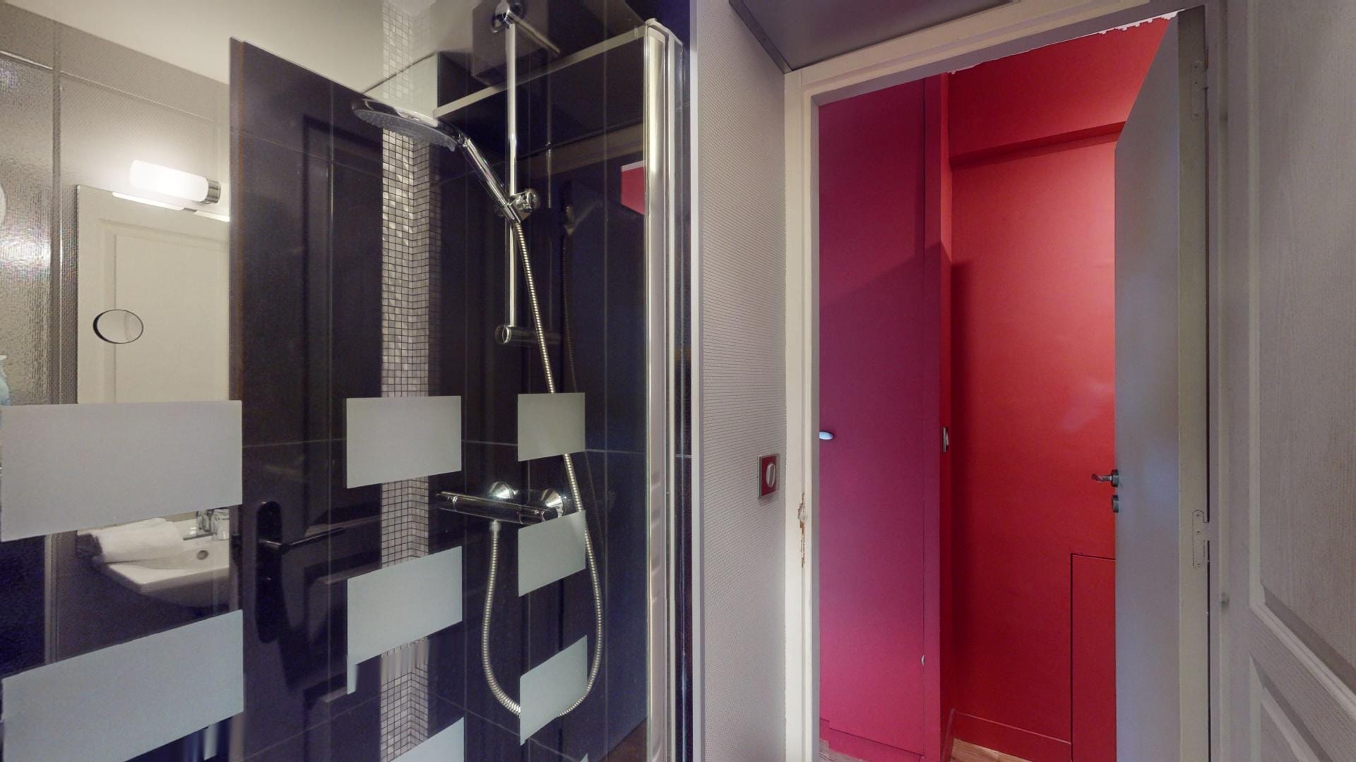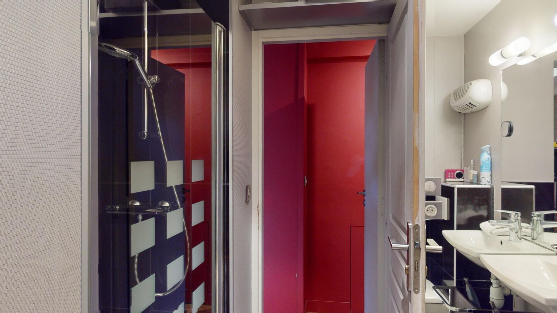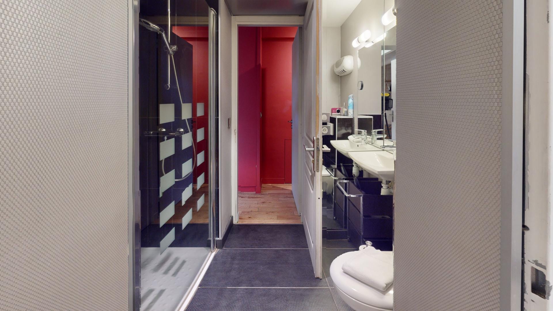 Salle d’eau rez-de-chaussée couleur noire pailleté et gris argent, spot encastré, lave-mains, miroir toute hauteur, toilettes suspendues, radiateur chauffant.