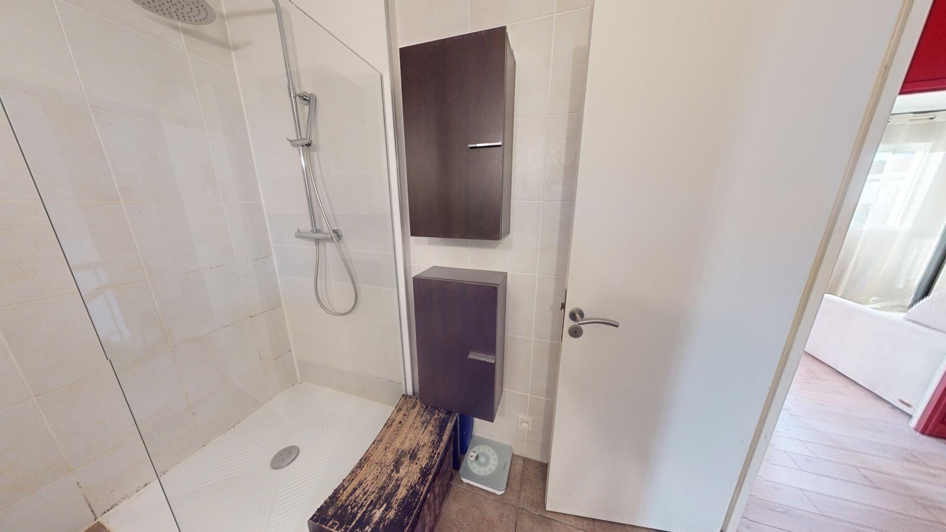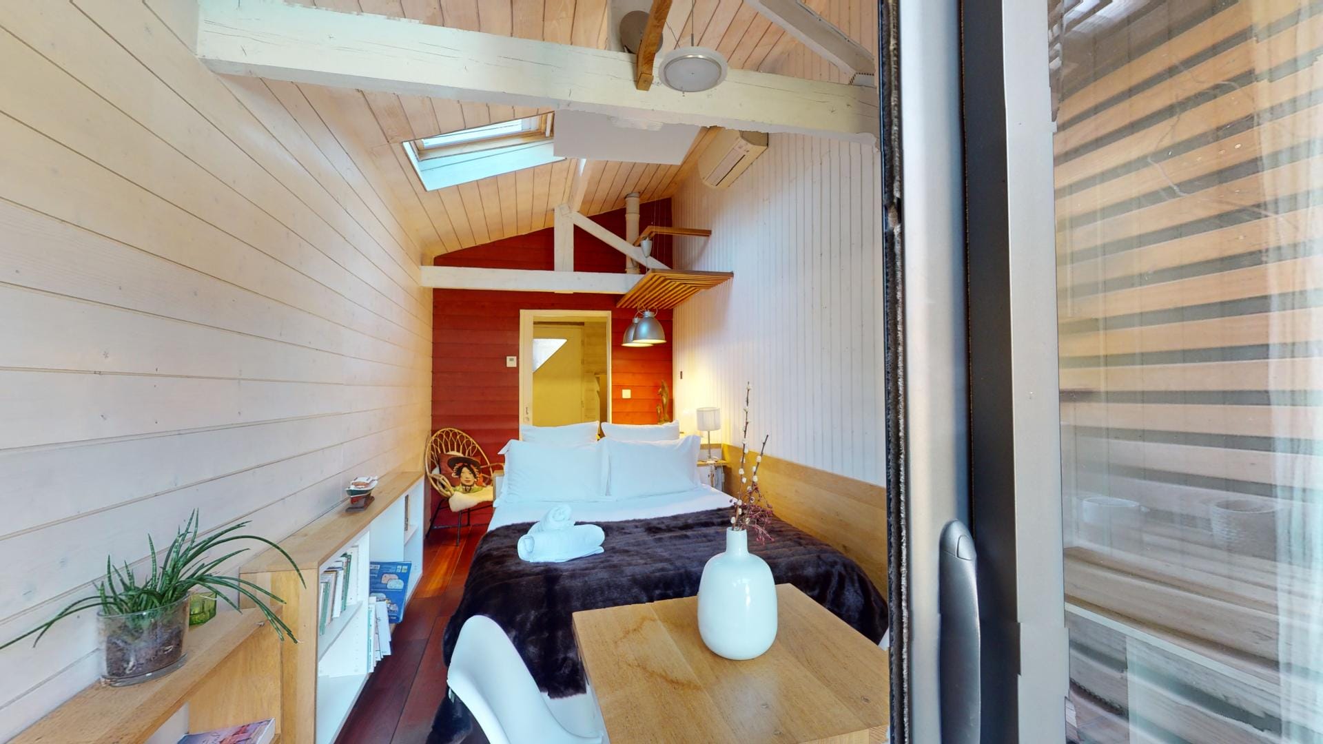 A l’entrée, espace rangement hauteur sous plafond face au lit.