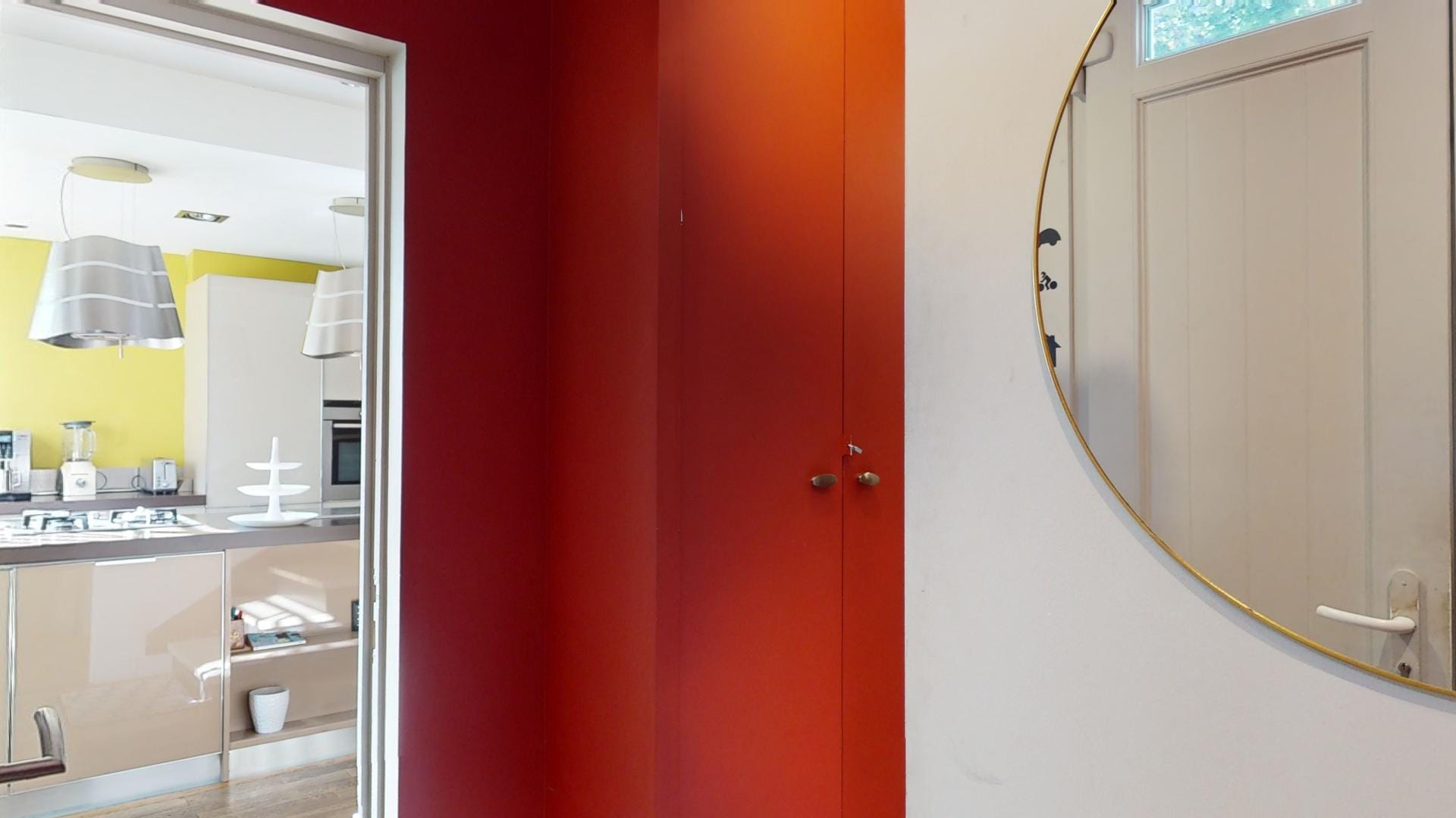 Papier peint Elitis, peintures Ressource, portes de placard en verre, profilés assortis au sol acajou.