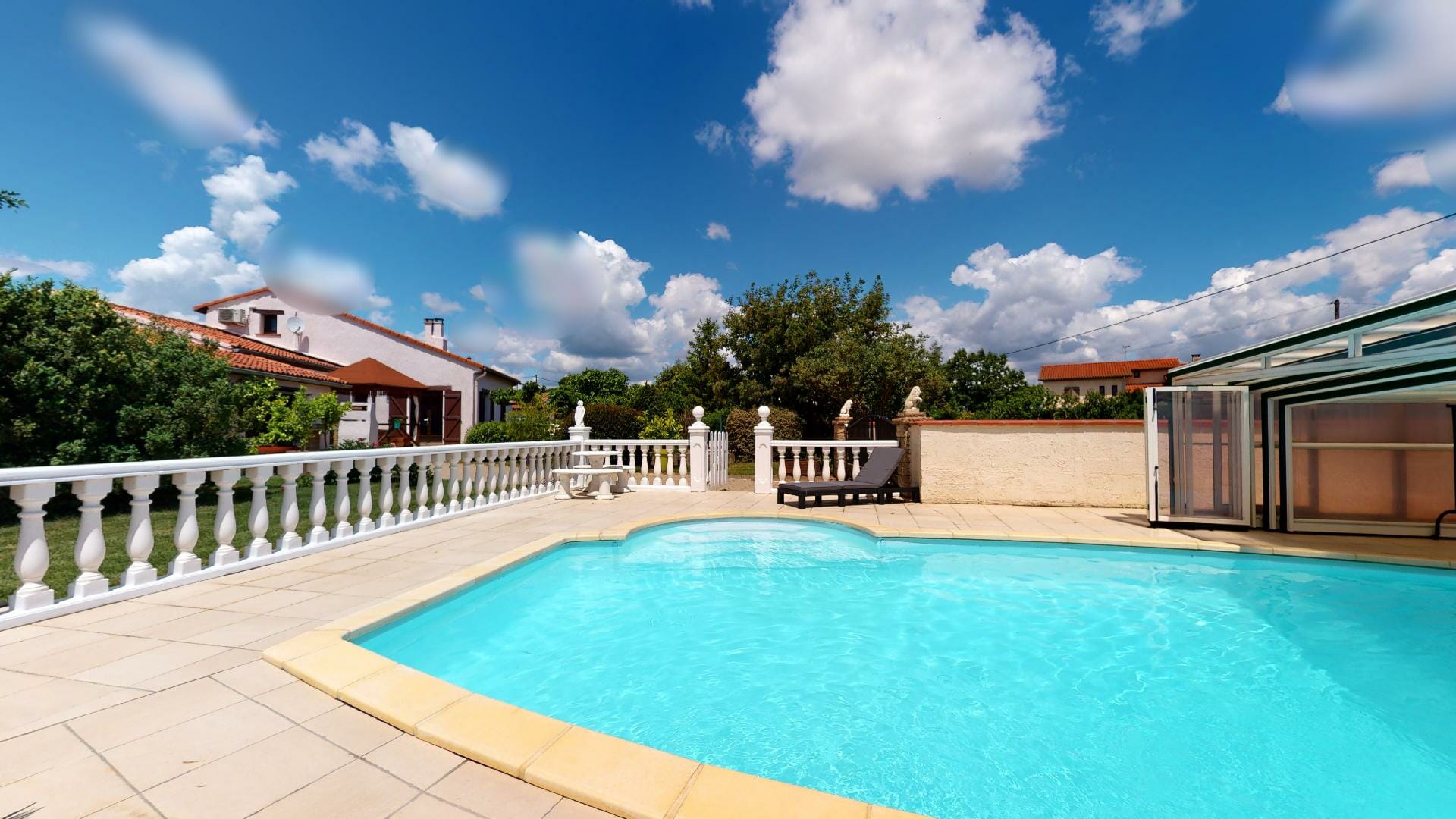 Une piscine traitement au sel, avec un abri piscine Mi-haut télescopique façades en verre sécurité, pour profiter de la piscine durant une bonne période de l’année, coulissement facile grâce à son système de monoguidage.