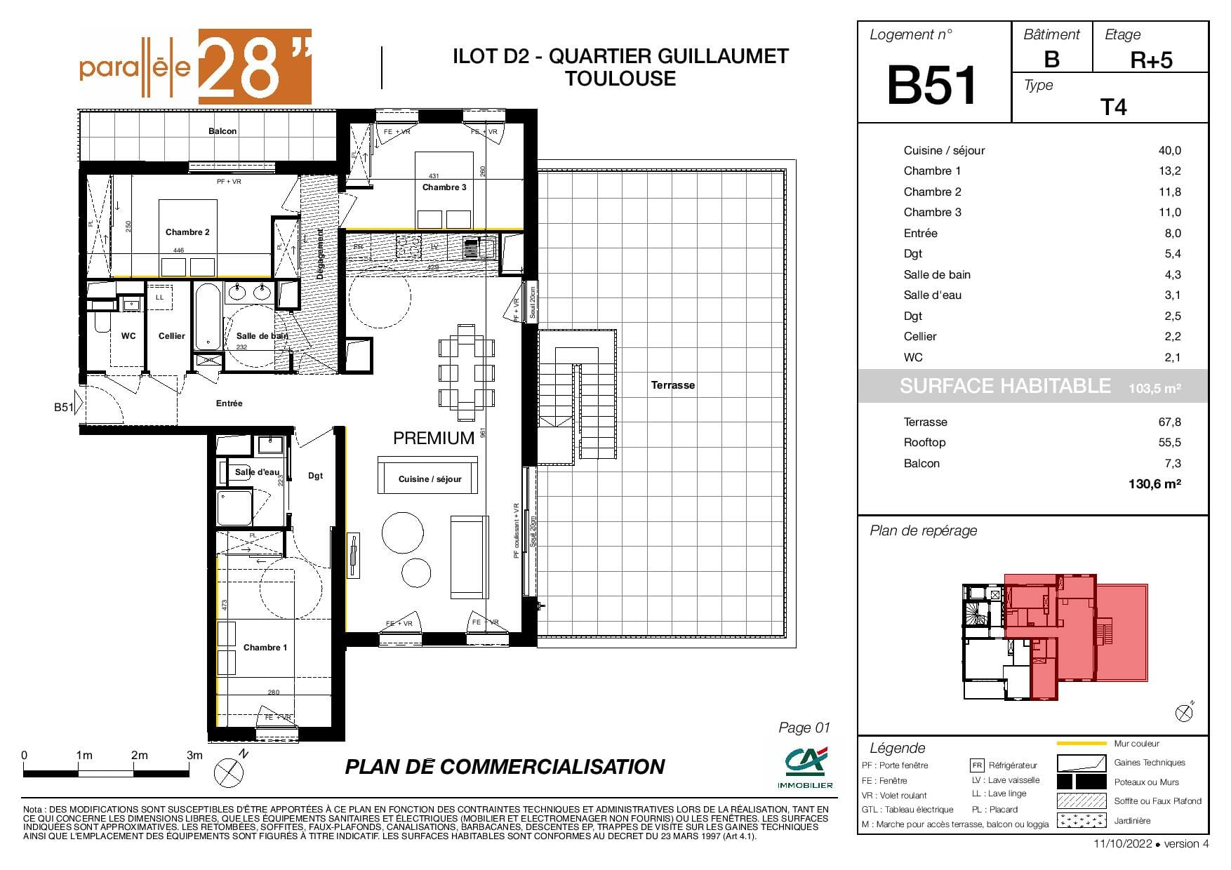 T4 Résidence Parallèle 28 à Guillaumet, avec Terrasse 67,08 m², Roof top 55.5 m² et balcon 7.03 m² pour une surface extérieure 130.06 m²