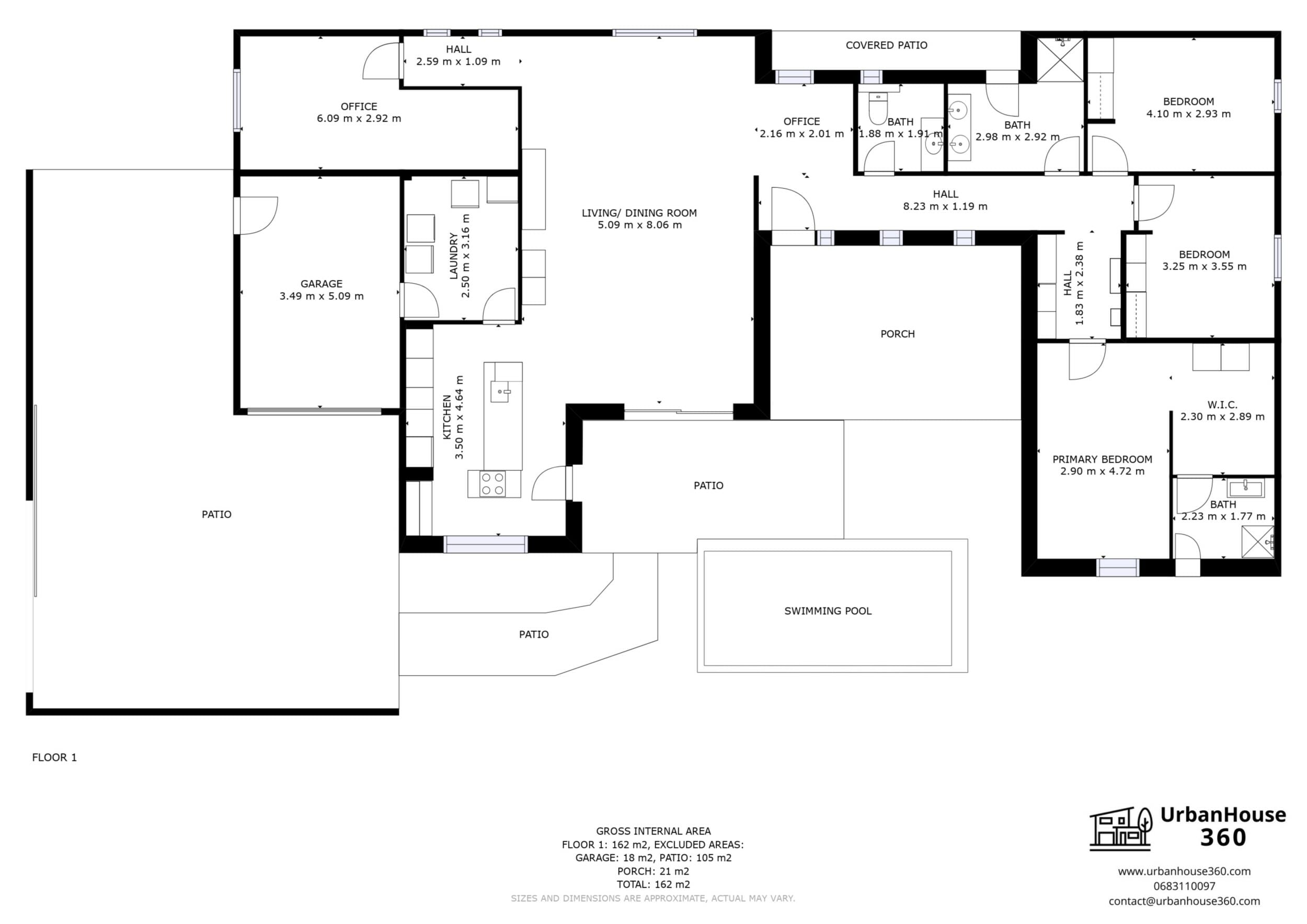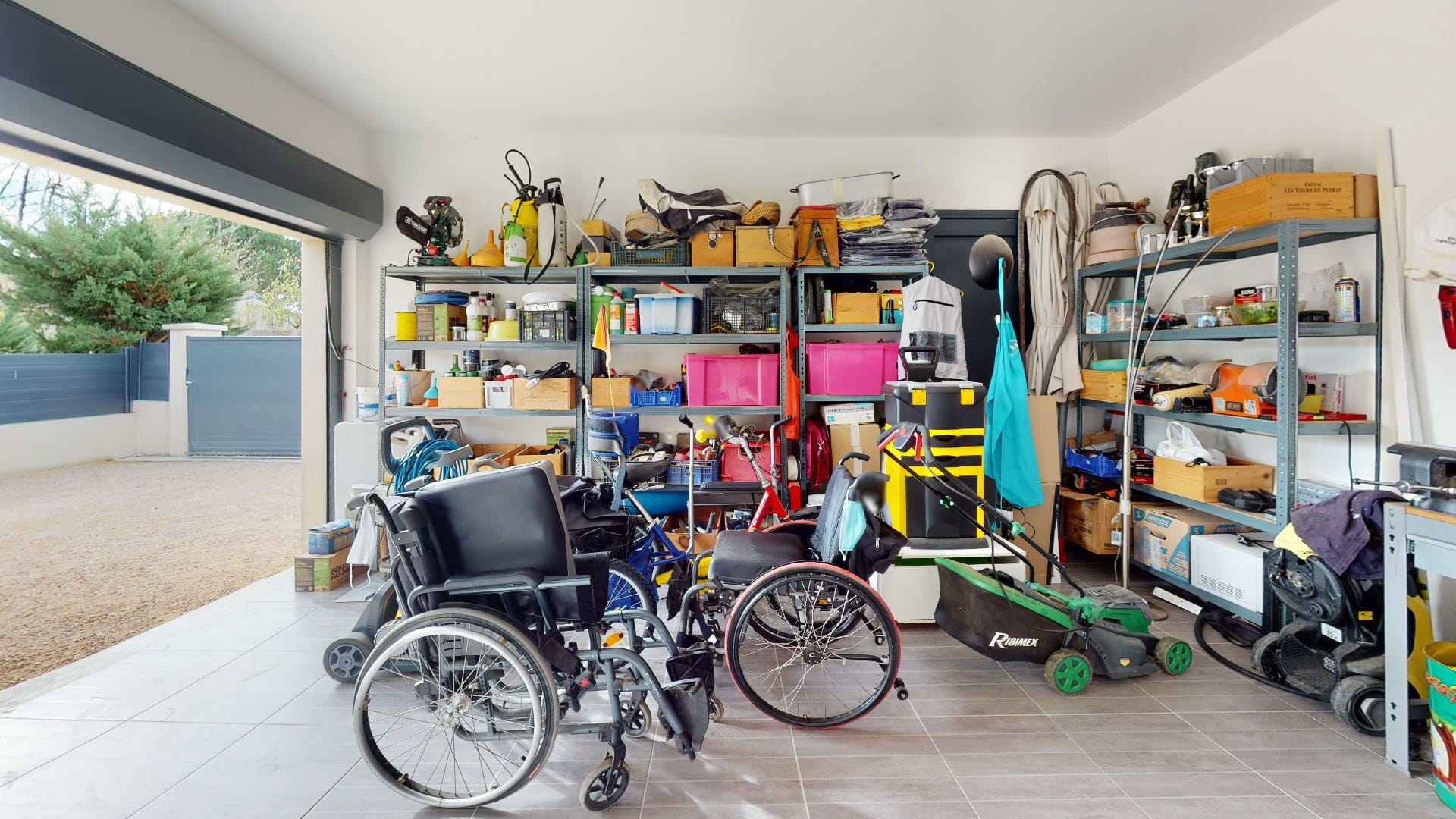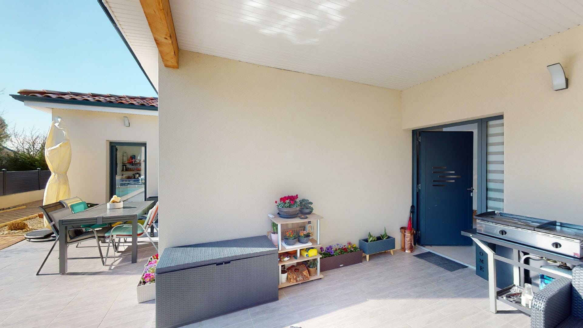 Patio de 105m2 sur le devant, avec piscine couverte et jardin arboré, clôturé. Porche d’entrée couvert de 21m2.