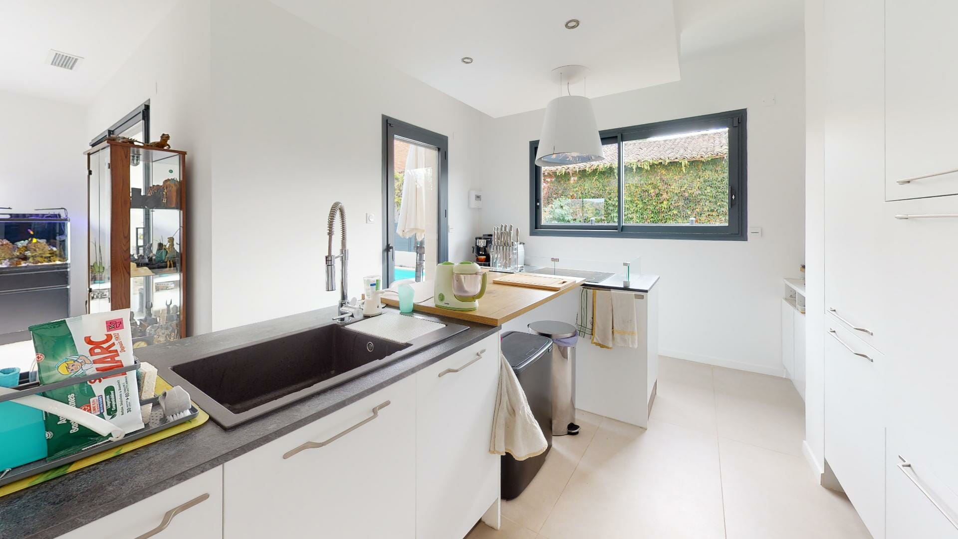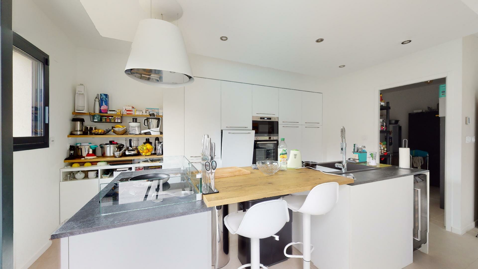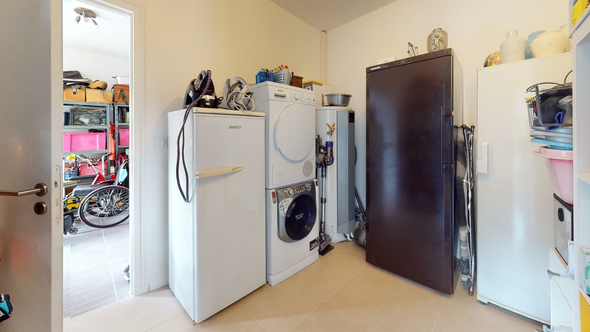 Cuisine moderne entièrement équipée à neuf avec un ilot central, ouverte sur le séjour. Attenant à la cuisine, un cellier/buanderie communiquant également avec le garage.