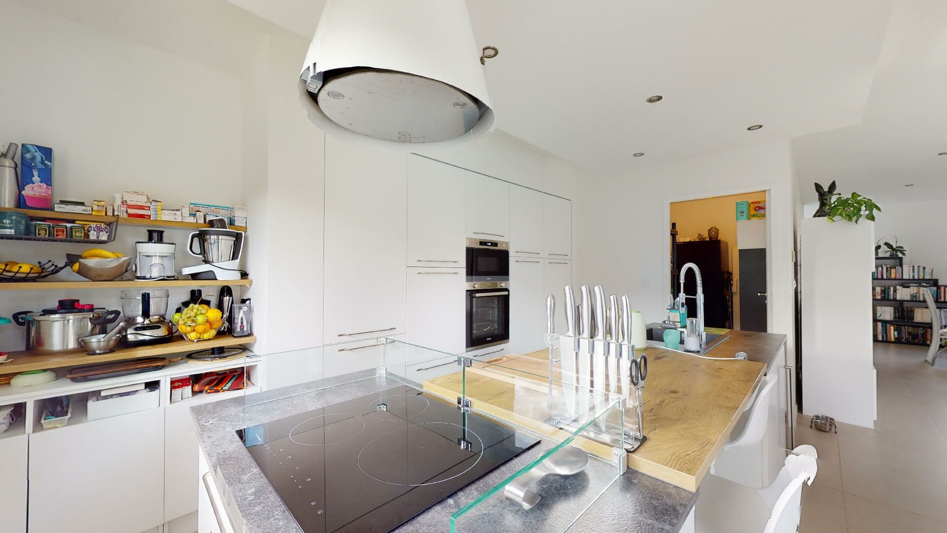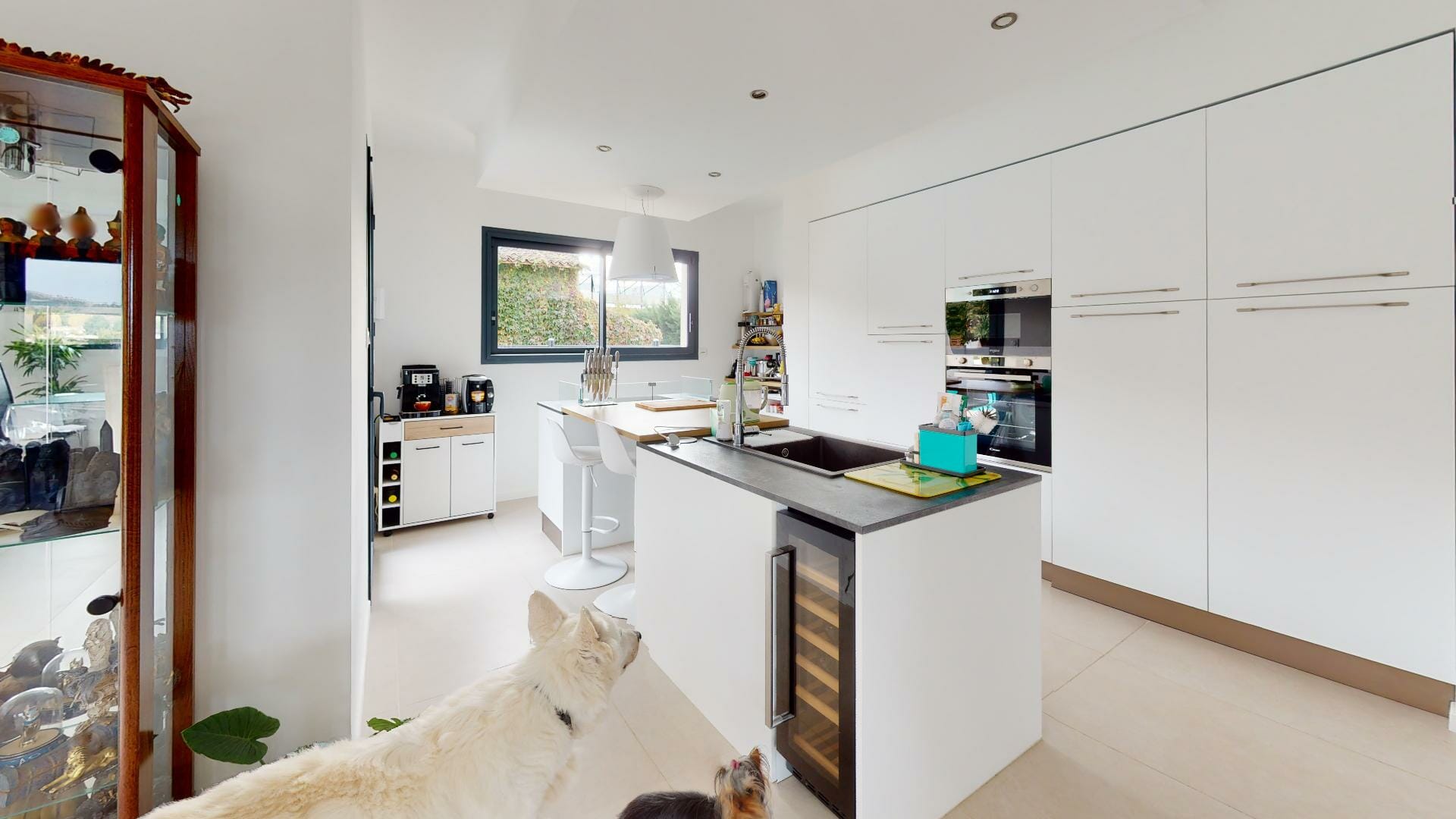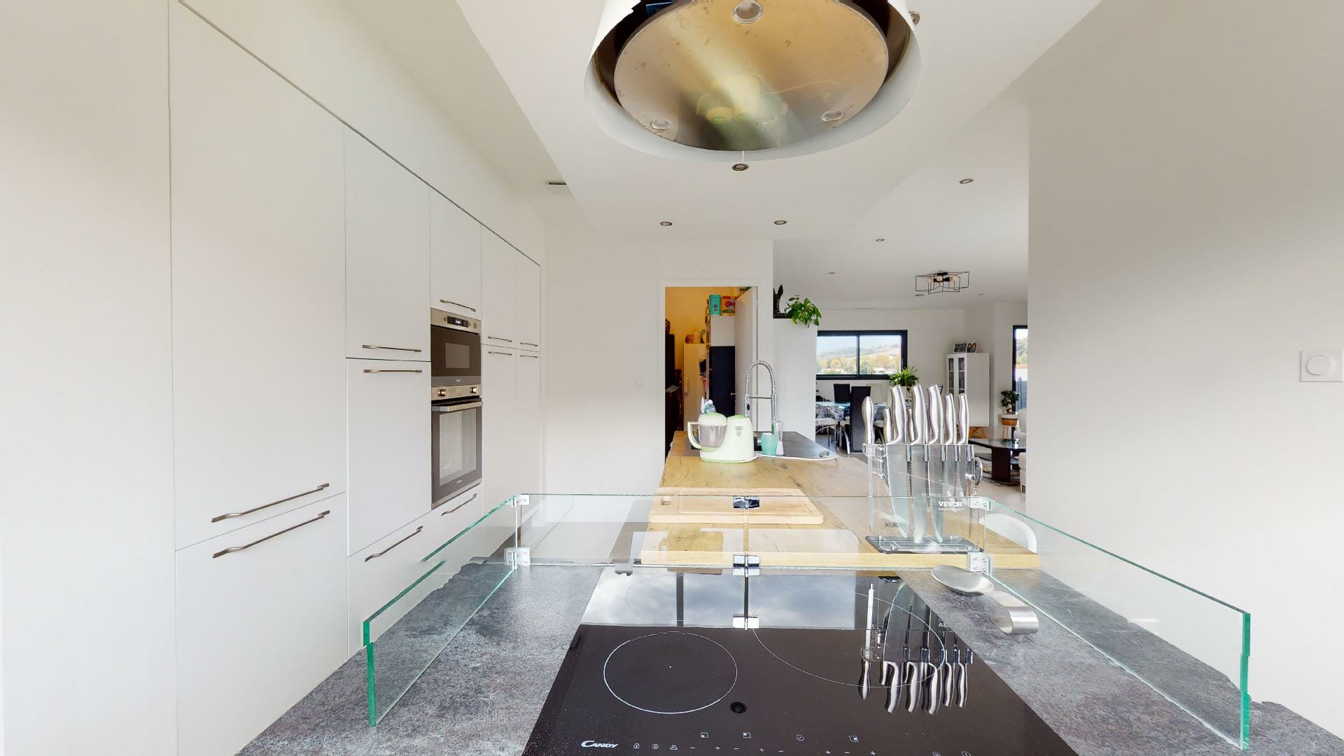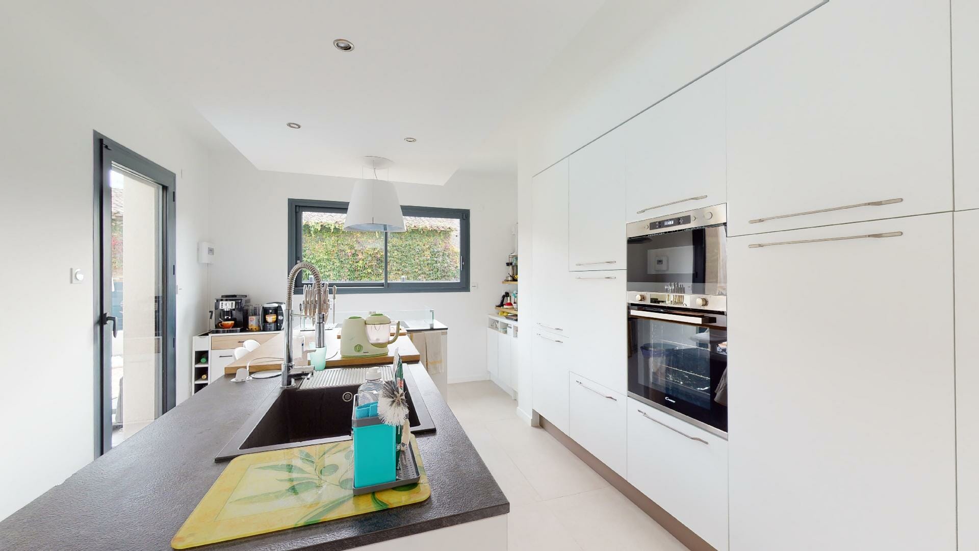 Cuisine moderne entièrement équipée à neuf avec un ilot central, ouverte sur le séjour. Attenant à la cuisine, un cellier/buanderie communiquant également avec le garage.