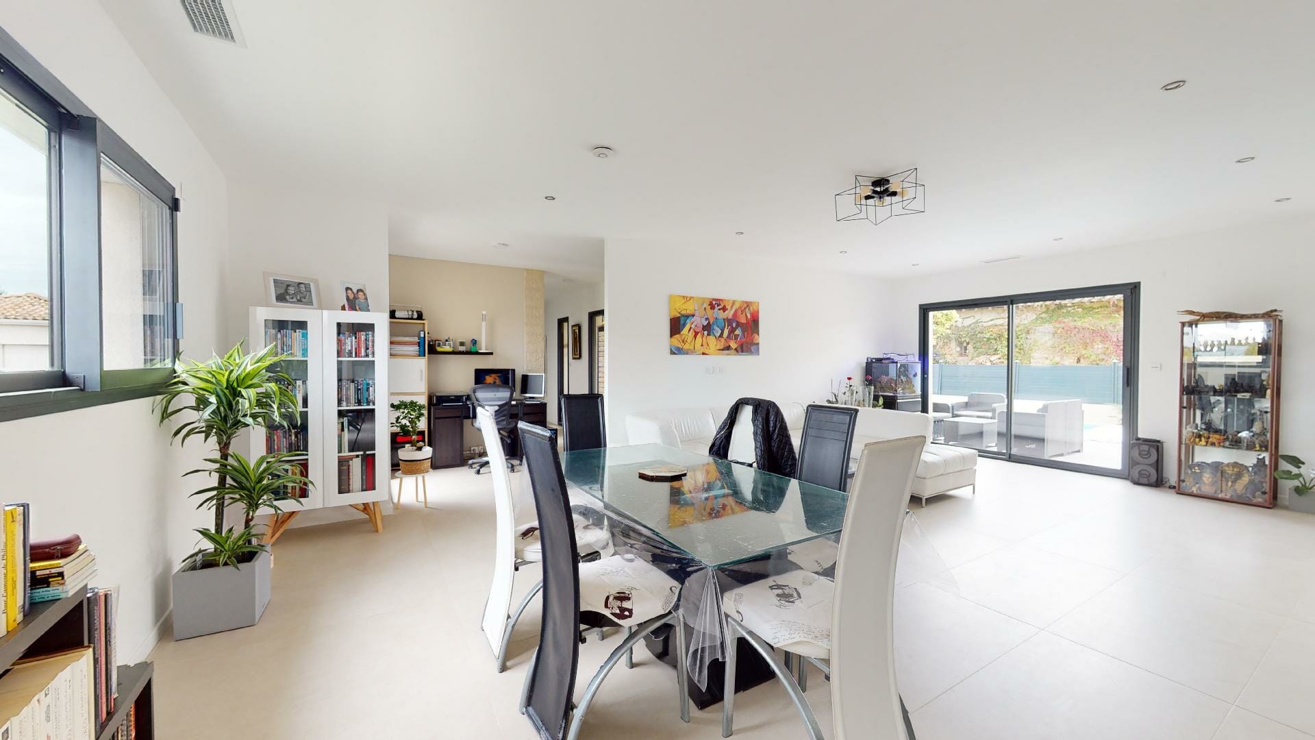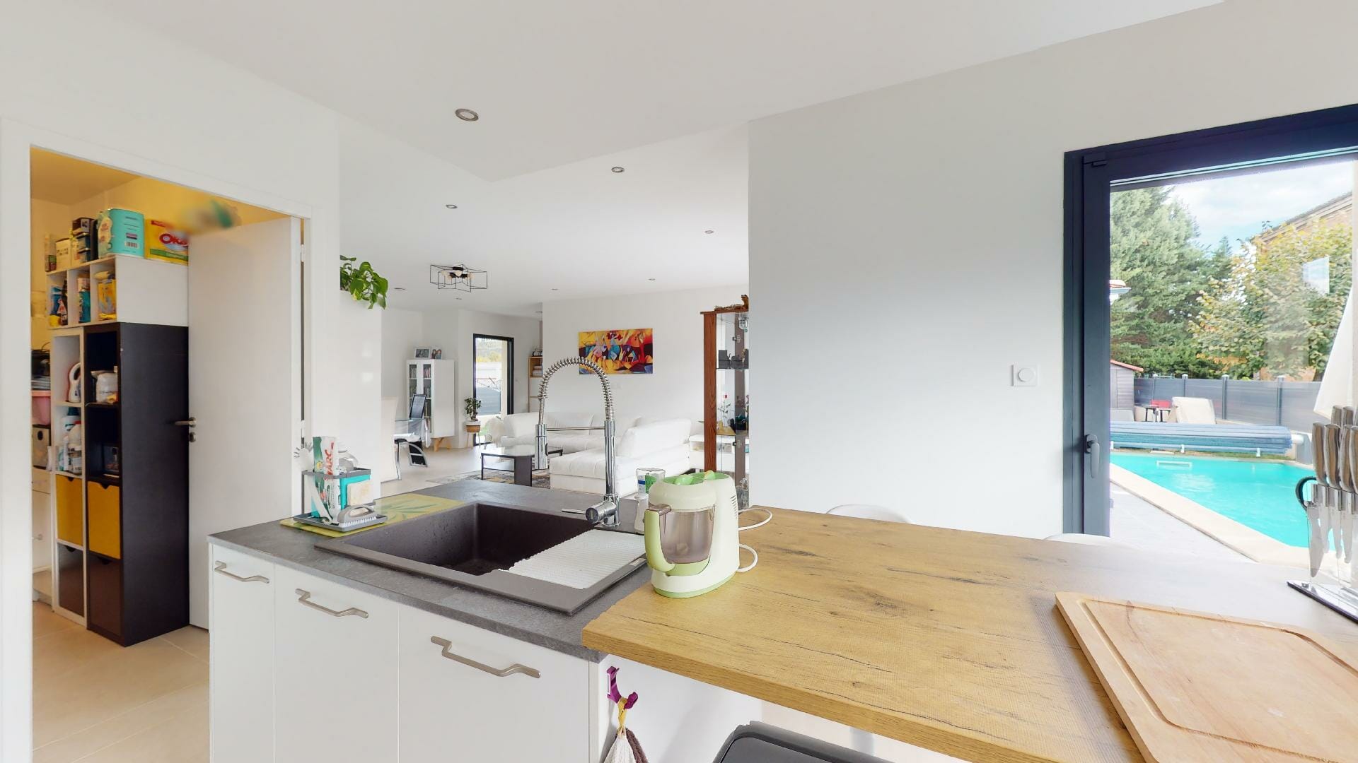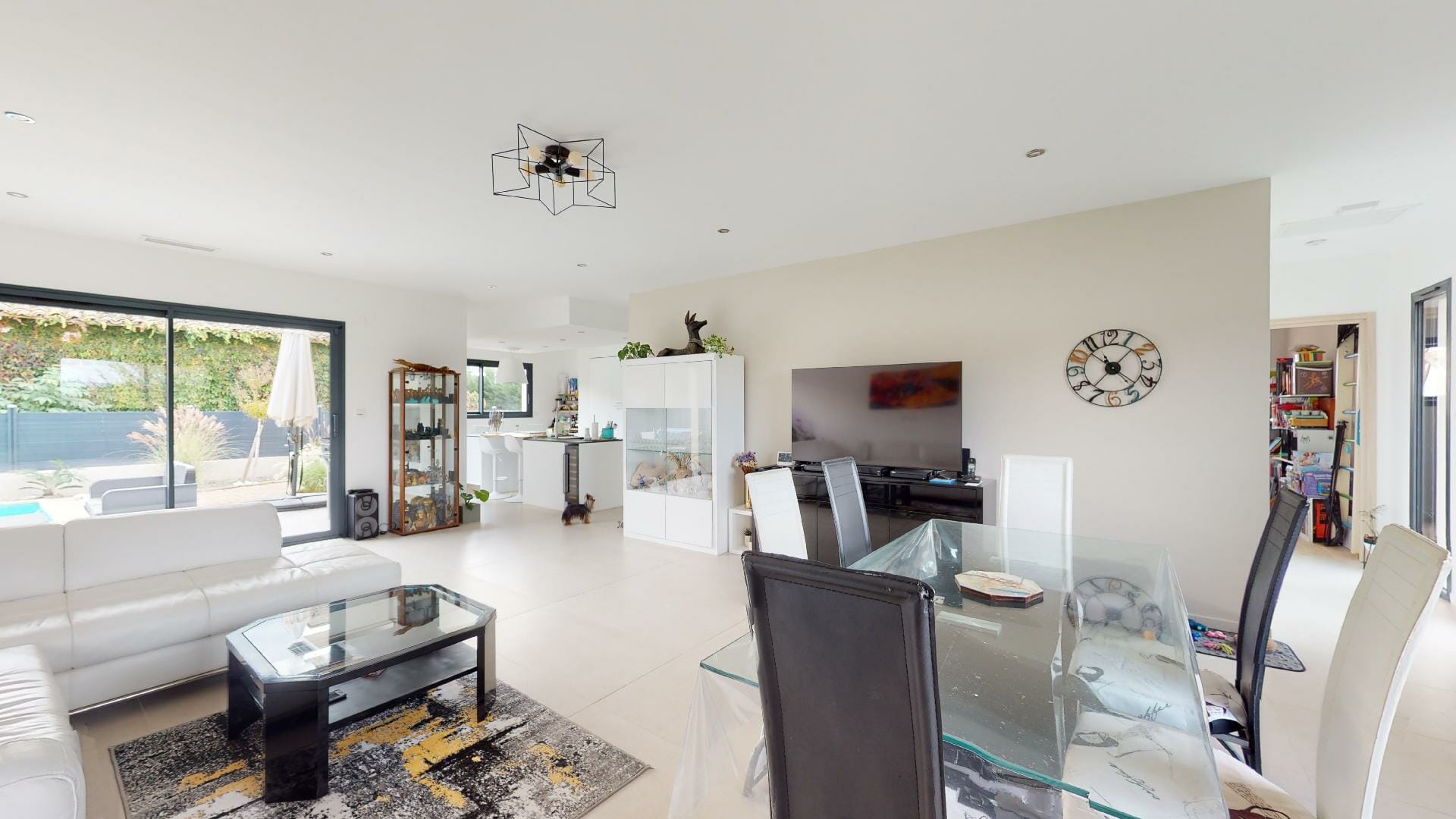 Cuisine salle à manger séjour, ouvrant sur la terrasse côté piscine.