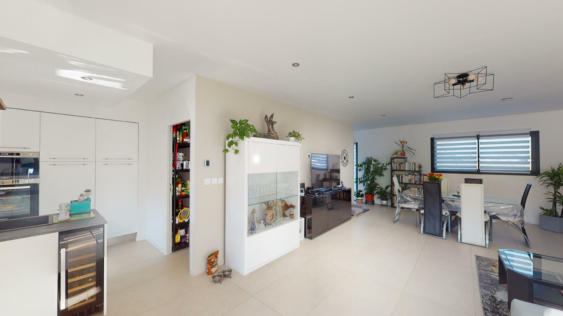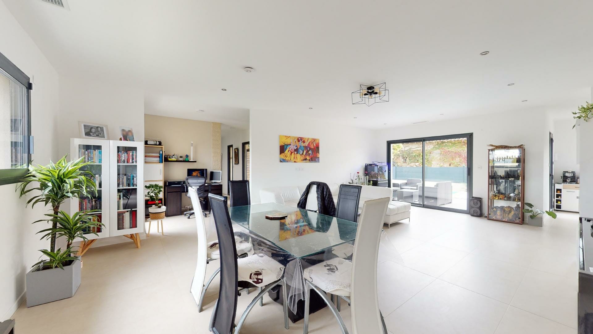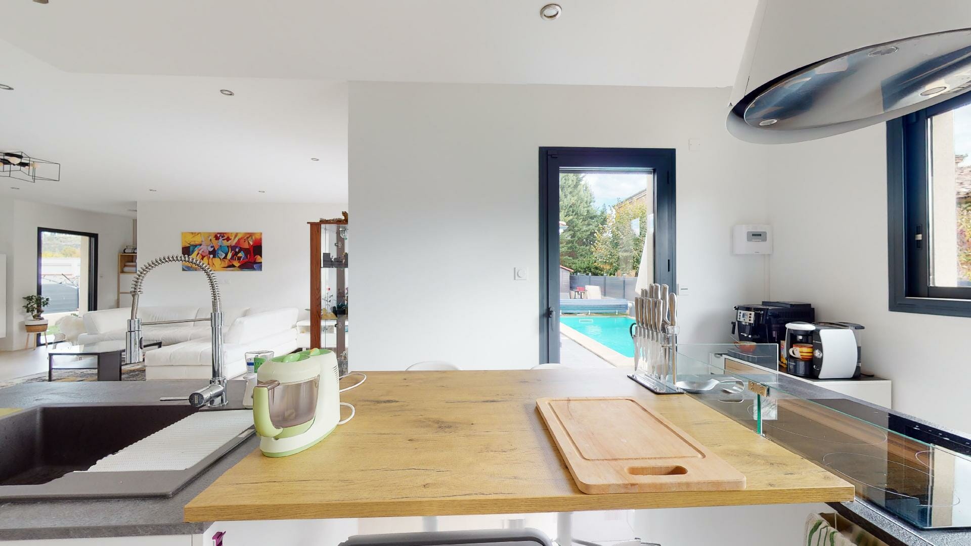 Cuisine salle à manger séjour, ouvrant sur la terrasse côté piscine.