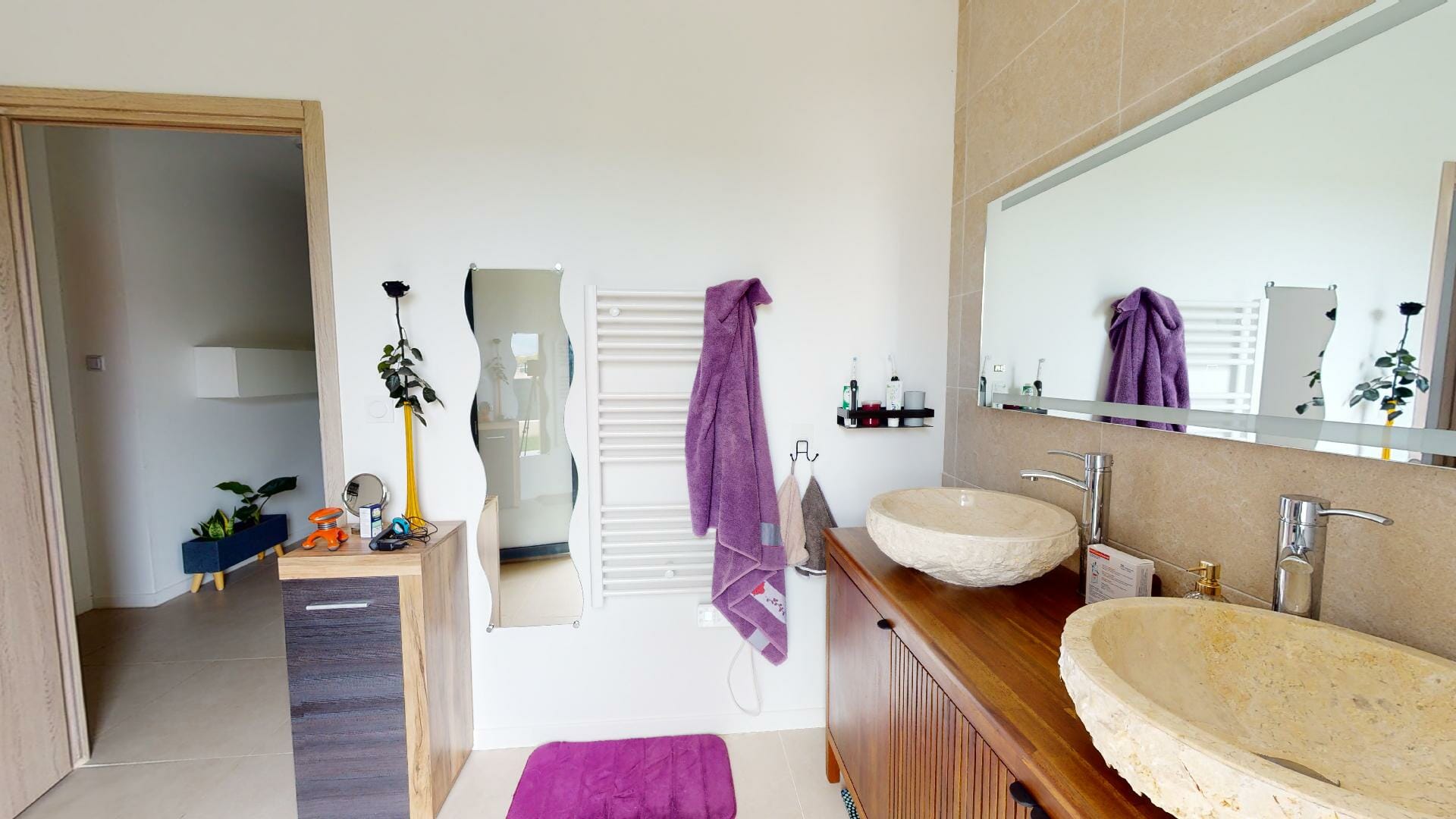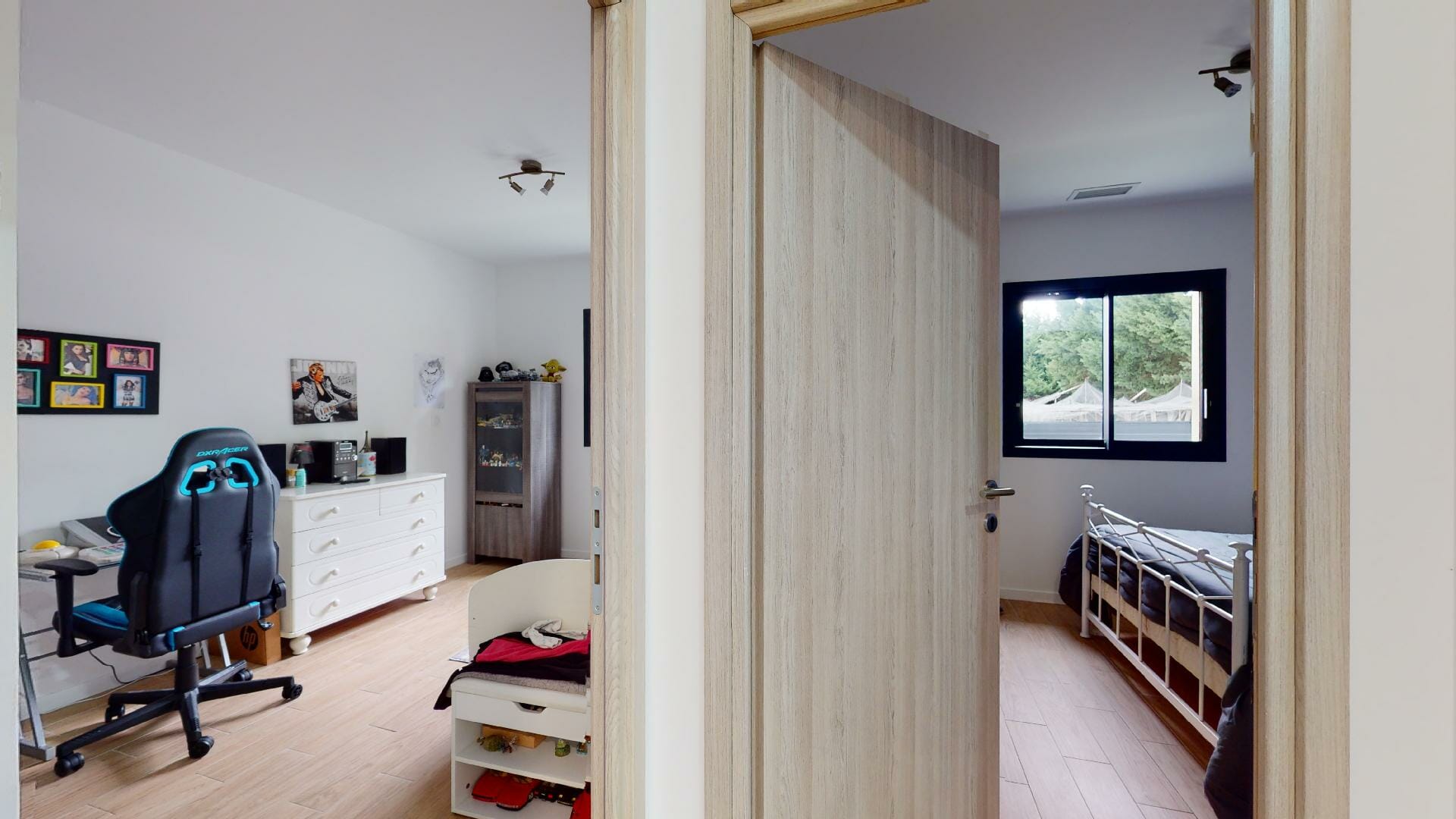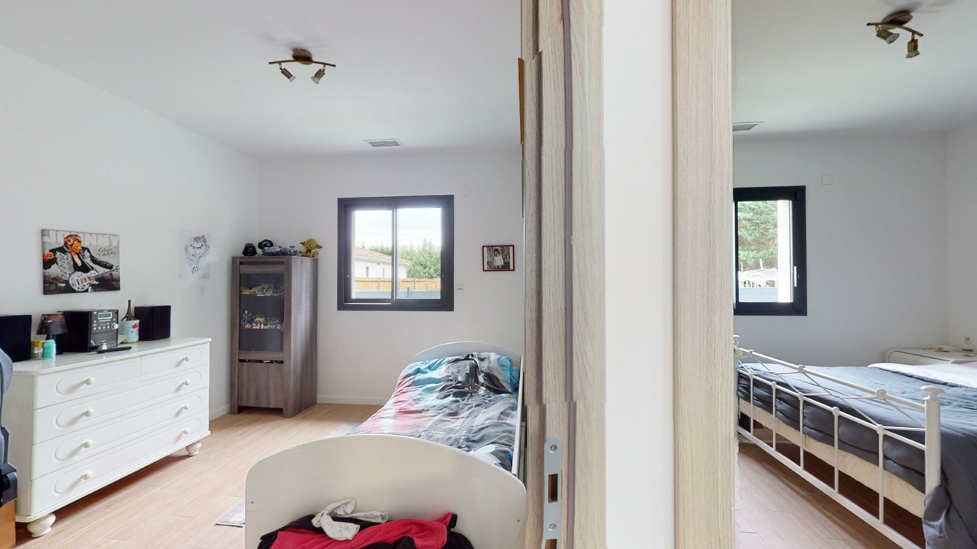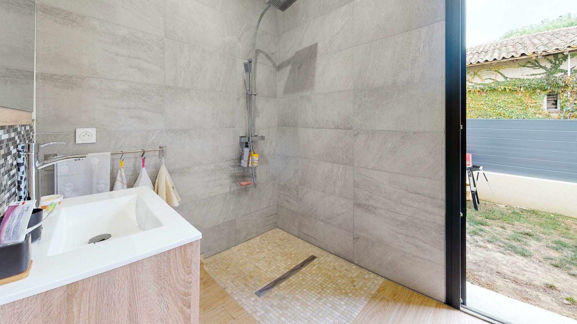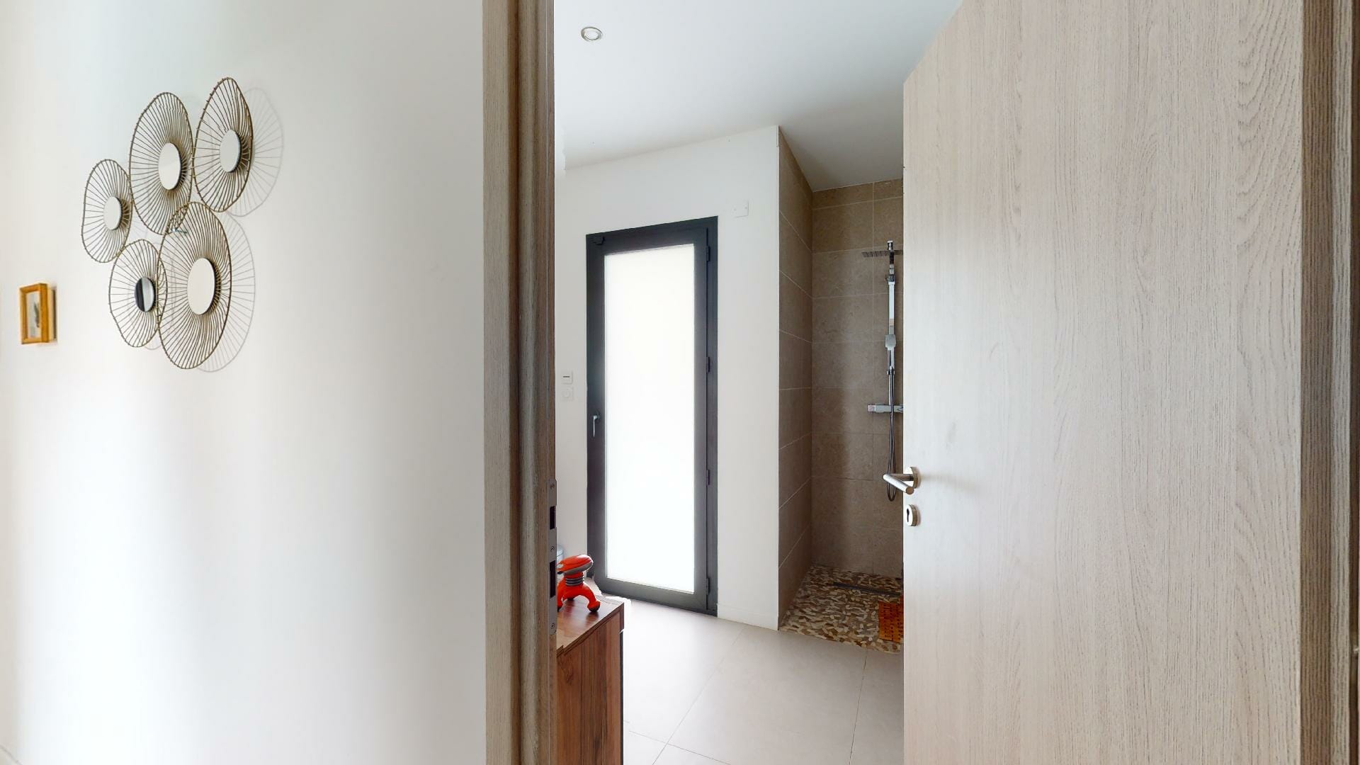 Sur la droite de l’entrée, la partie nuit, une salle d’eau, douche italienne avec une sortie porte vitrée donnant sur le jardin. En continuité, 3 chambres, dont une suite parentale, dressing 6m2 et salle d’eau avec une sortie porte vitrée donnant sur le jardin à l’Est.