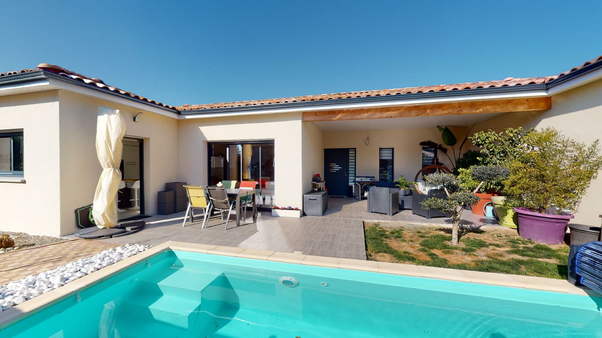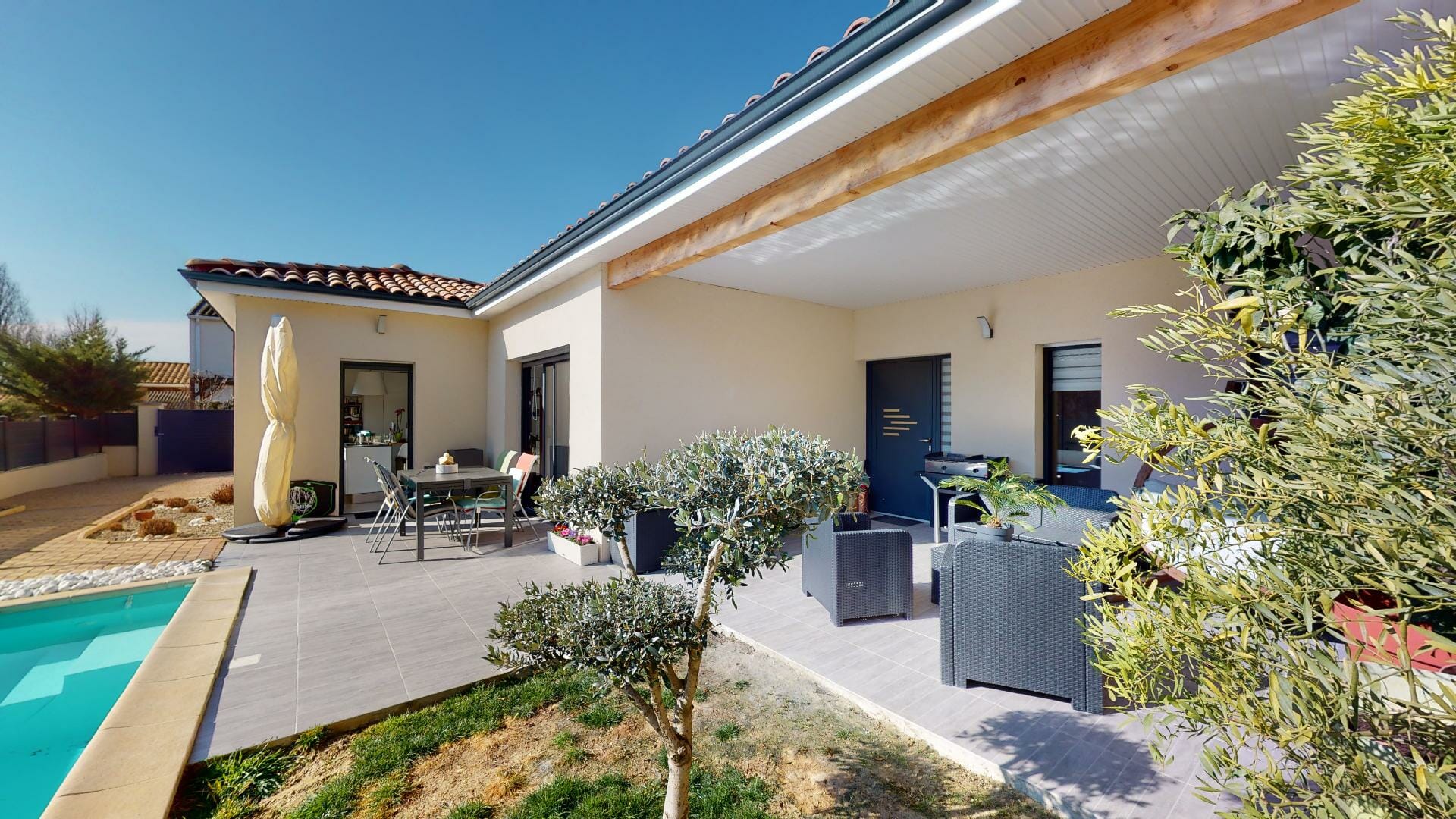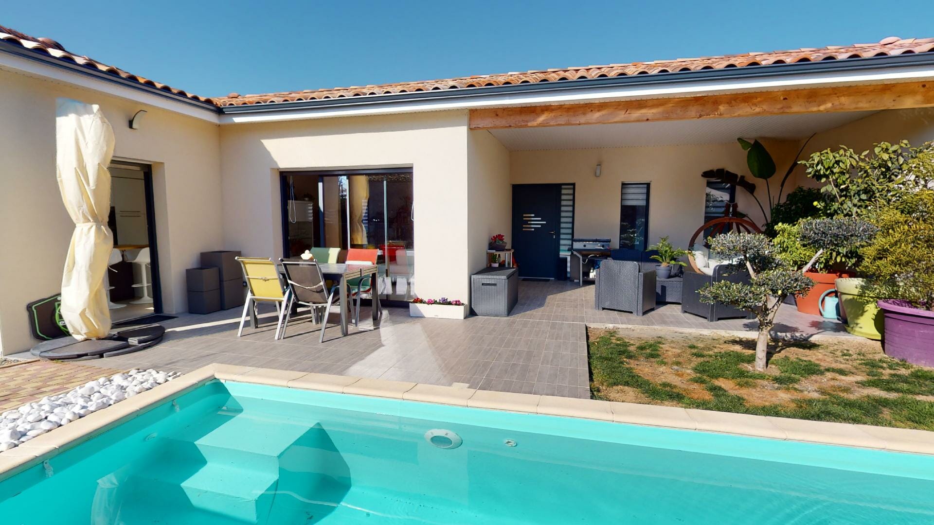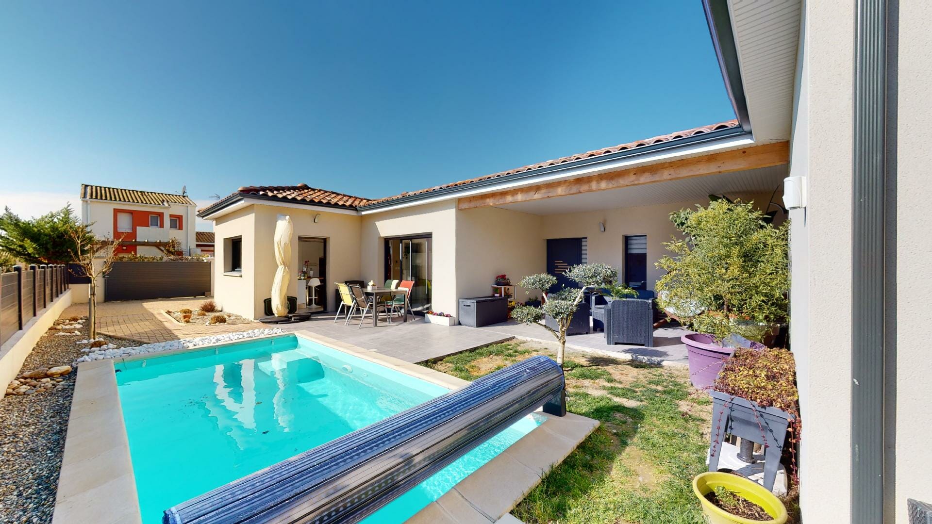 Belle hauteur sous-plafond, de style contemporain, d’une superficie de 162m2, garage 28m2, piscine, sur une parcelle totale de 565m2.