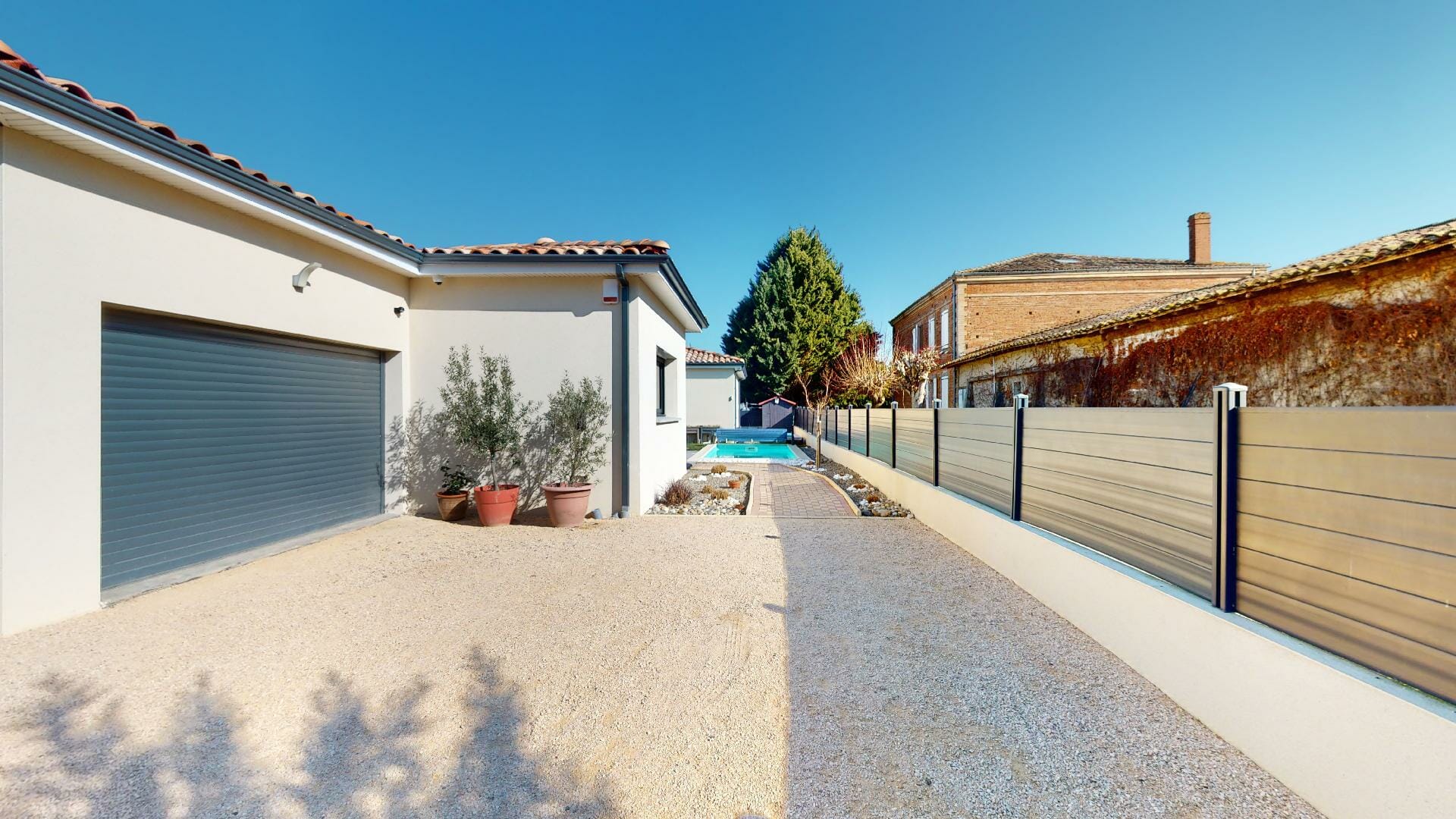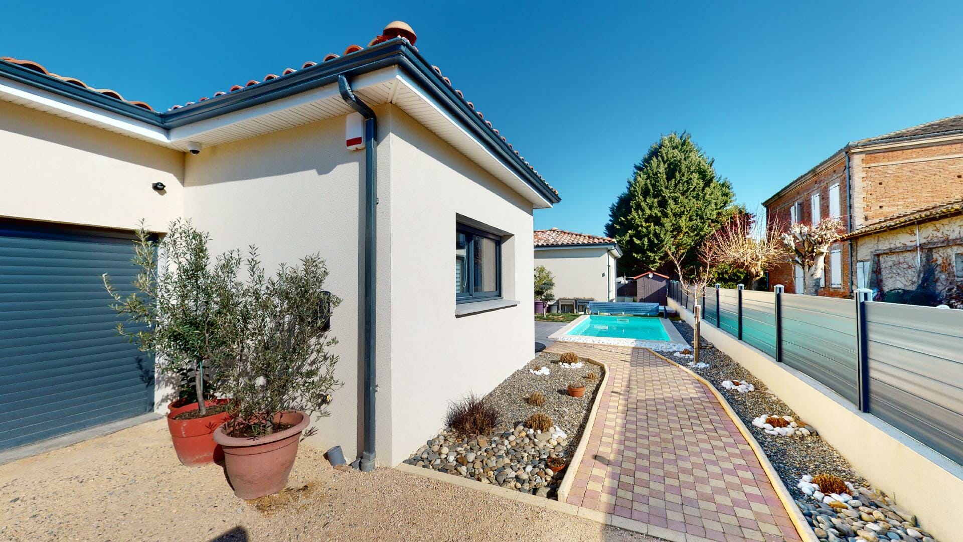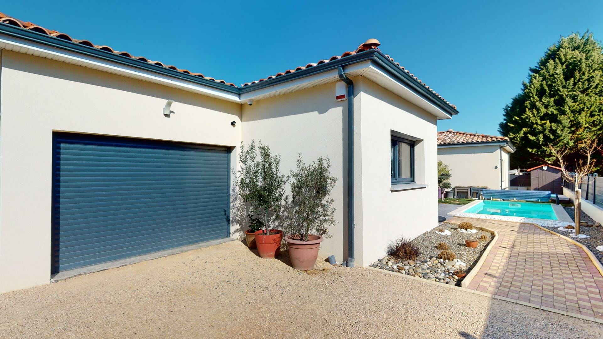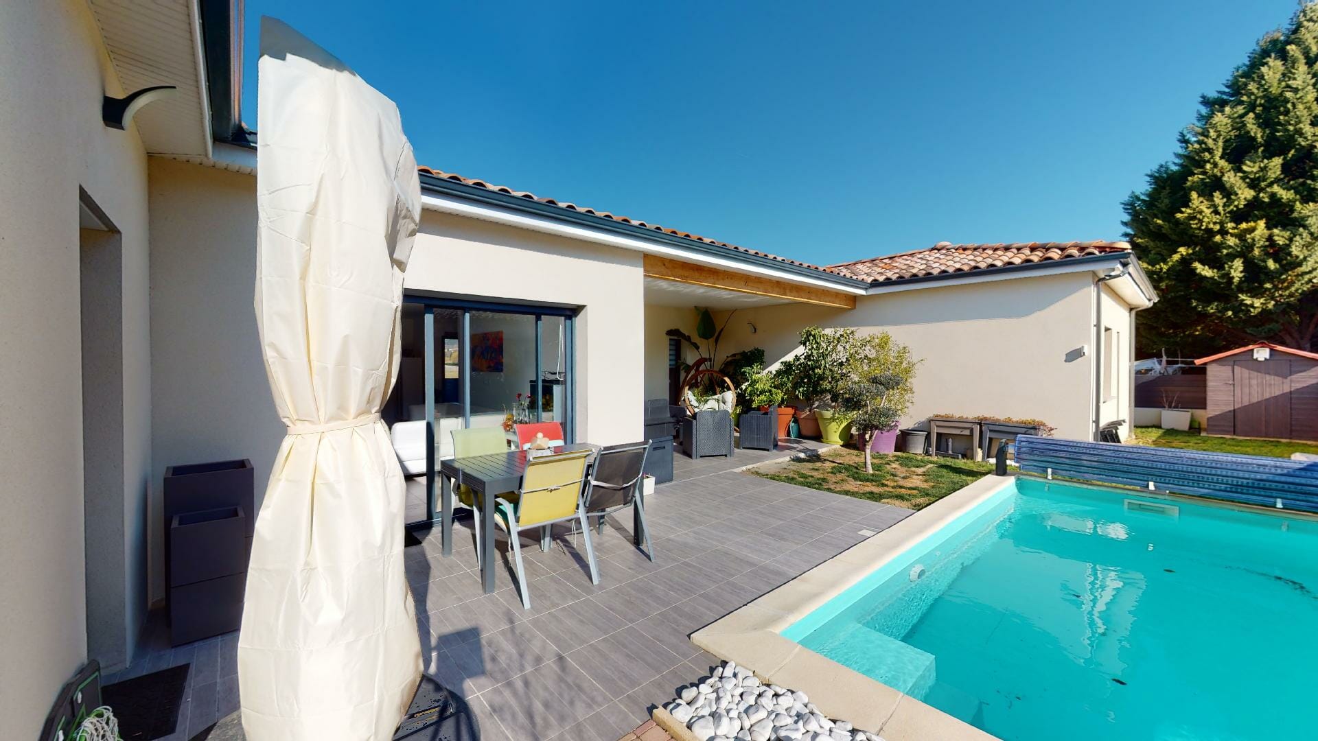 Belle hauteur sous-plafond, de style contemporain, d’une superficie de 162m2, garage 28m2, piscine, sur une parcelle totale de 565m2.