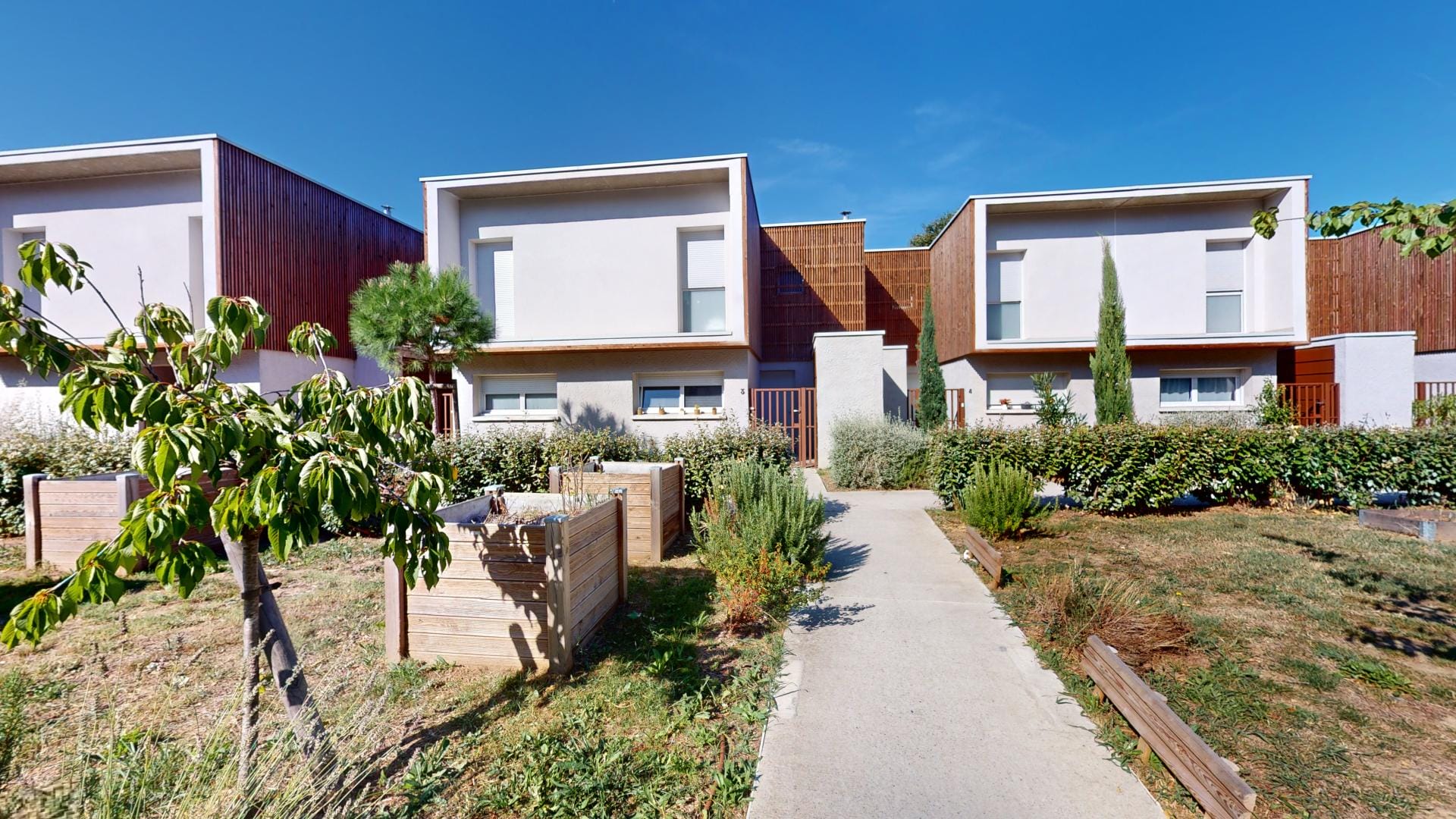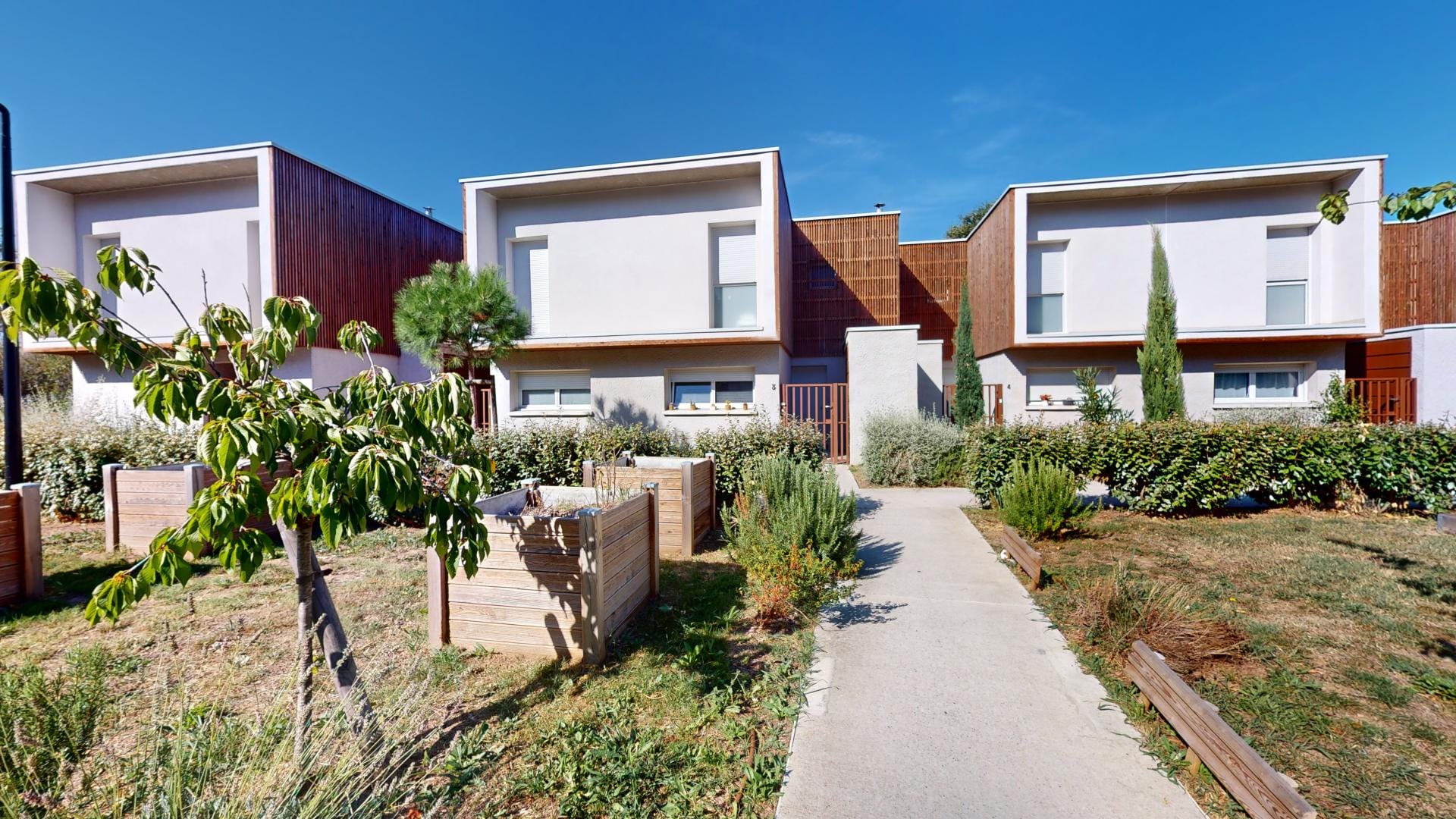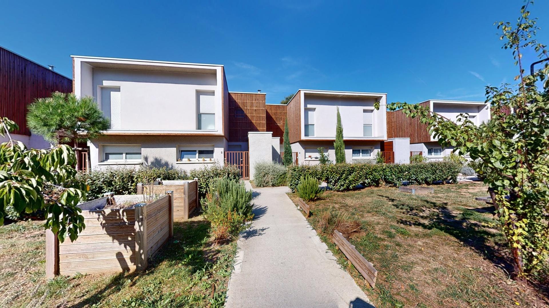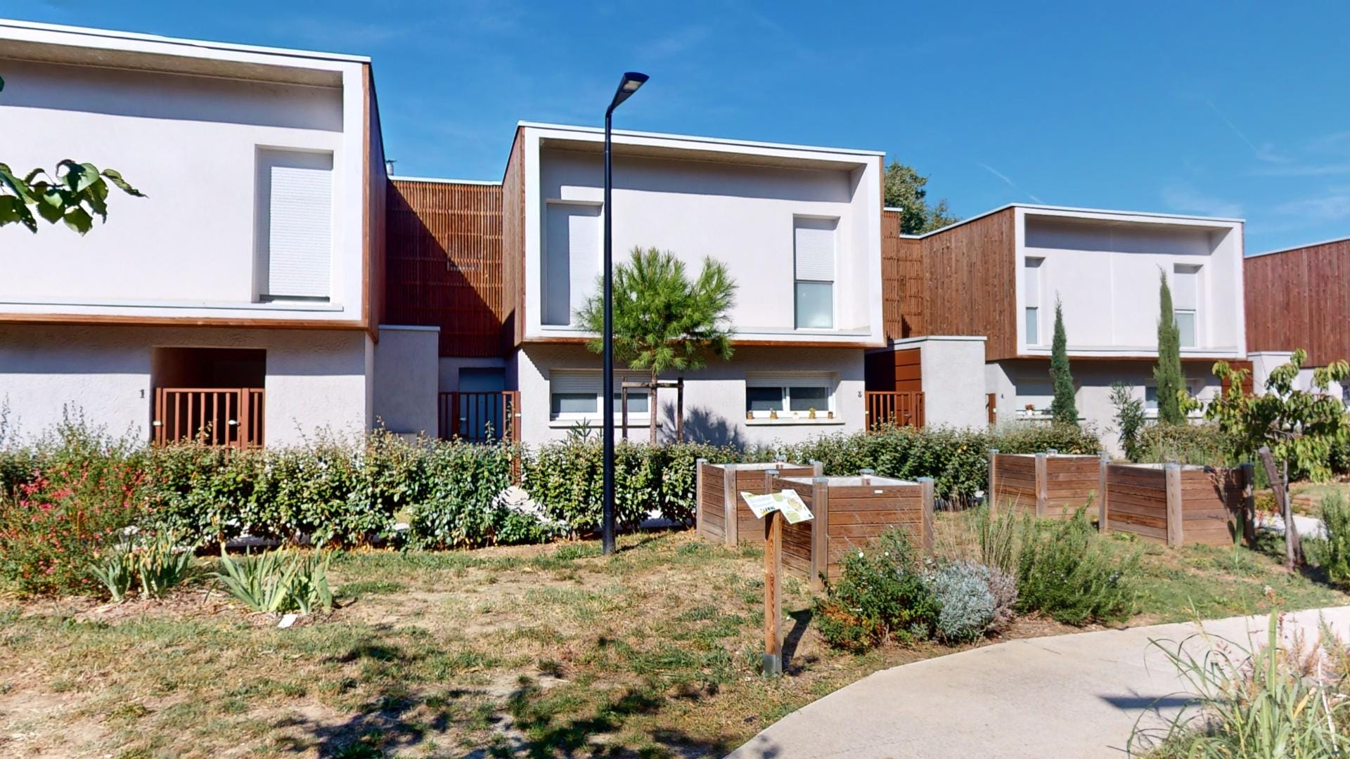 Le toit terrasse, véritable écrin de verdure, et les façades en bois marron traité s’inscrivent dans une démarche éco-responsable, complétée par des jardins d’ornements et potagers qui invitent à la détente et au partage.
