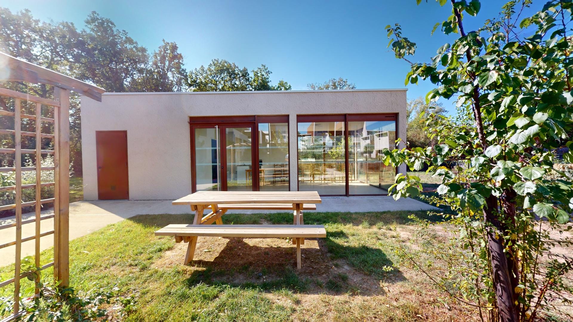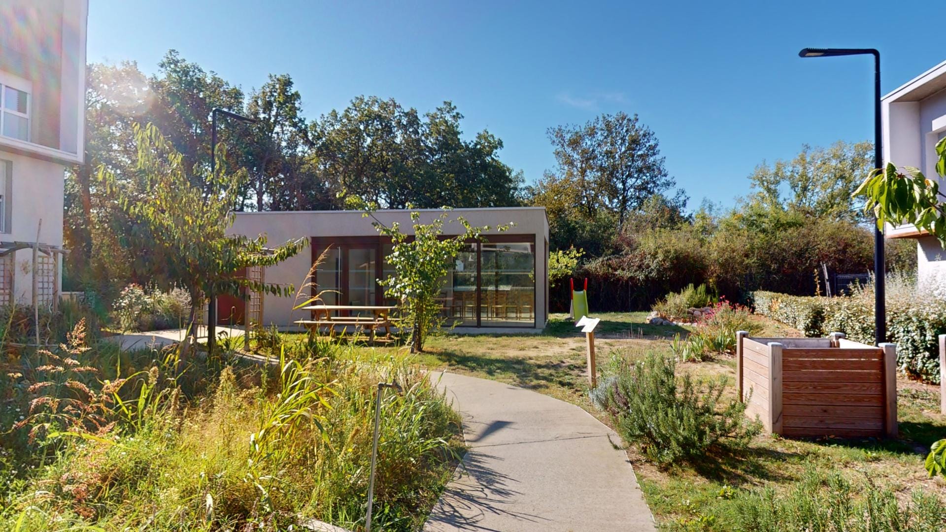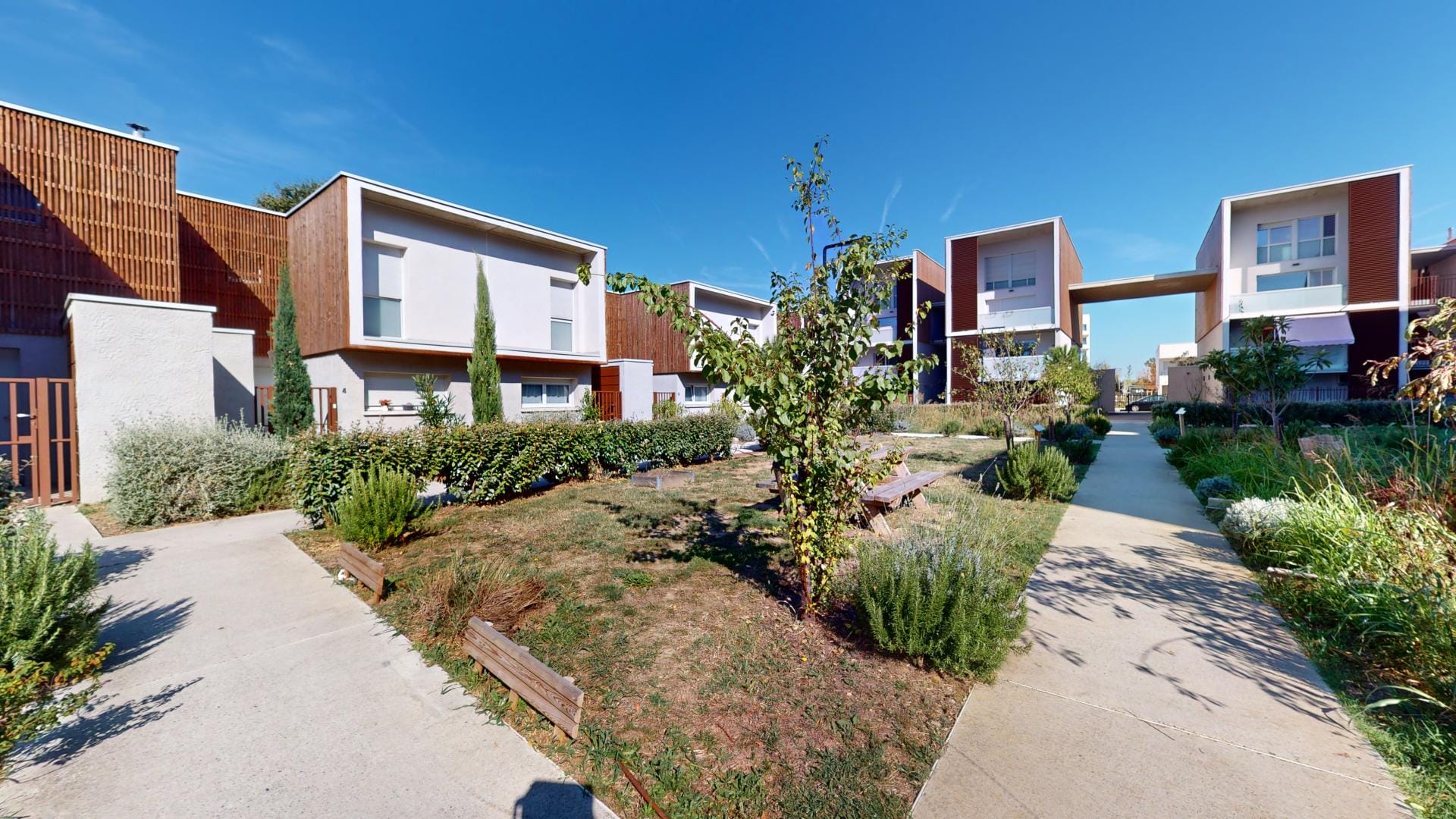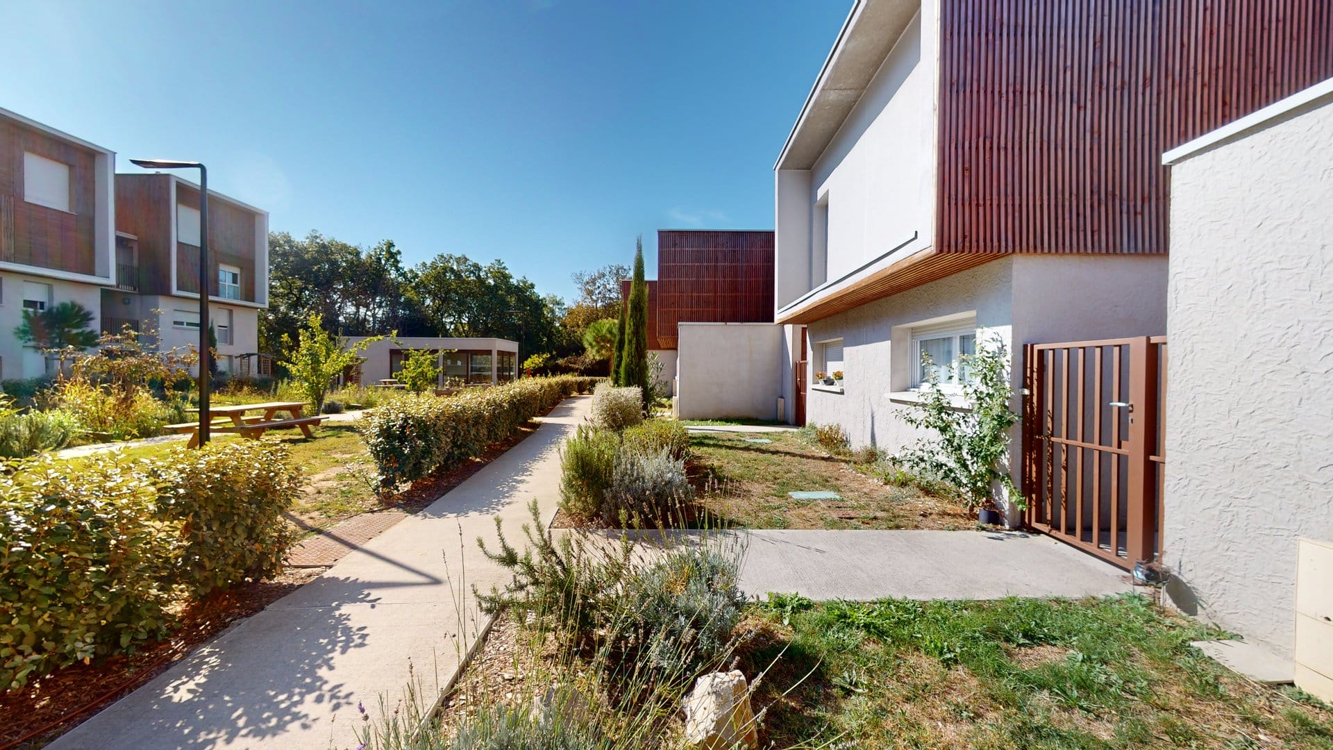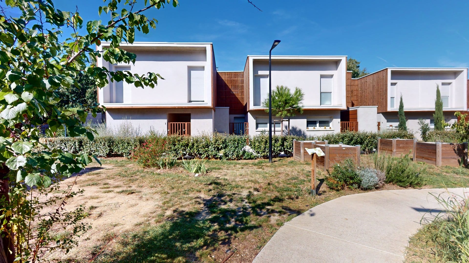 Le toit terrasse, véritable écrin de verdure, et les façades en bois marron traité s’inscrivent dans une démarche éco-responsable, complétée par des jardins d’ornements et potagers qui invitent à la détente et au partage.
