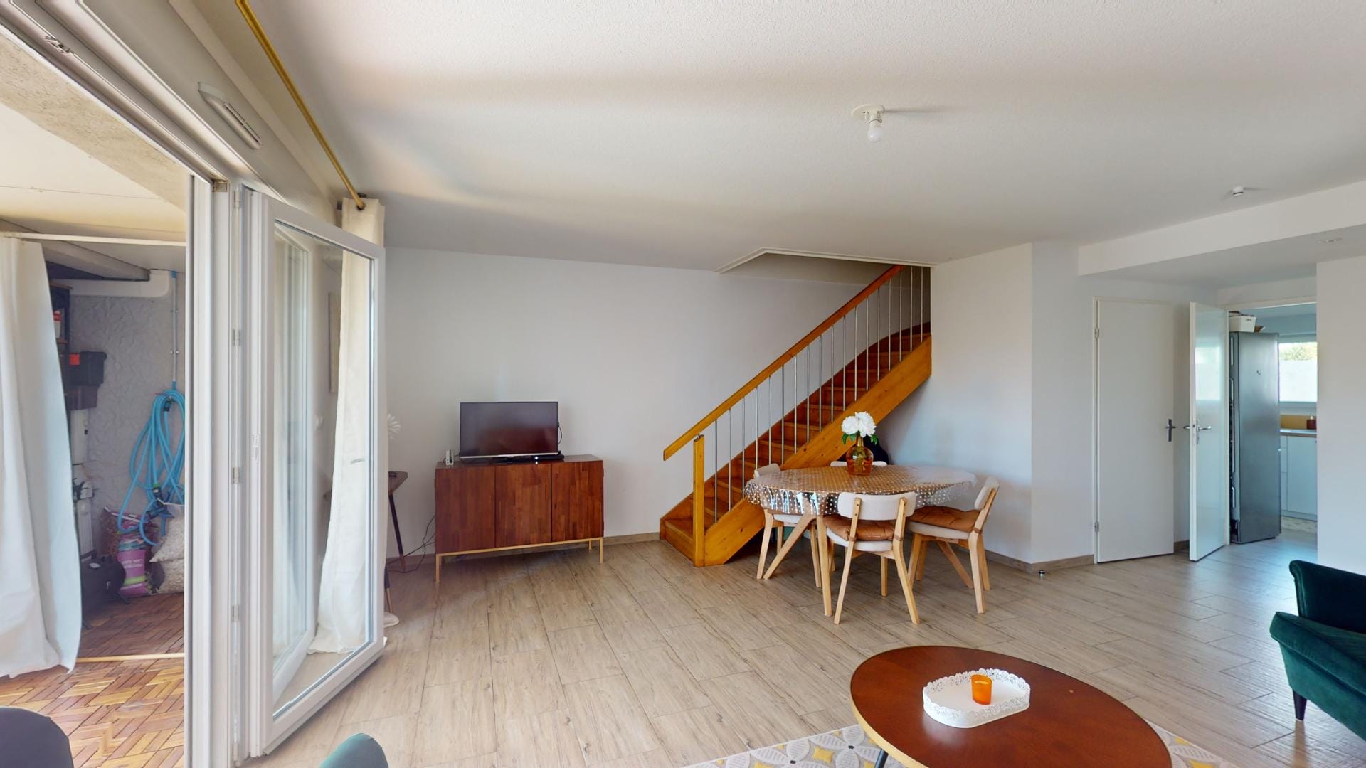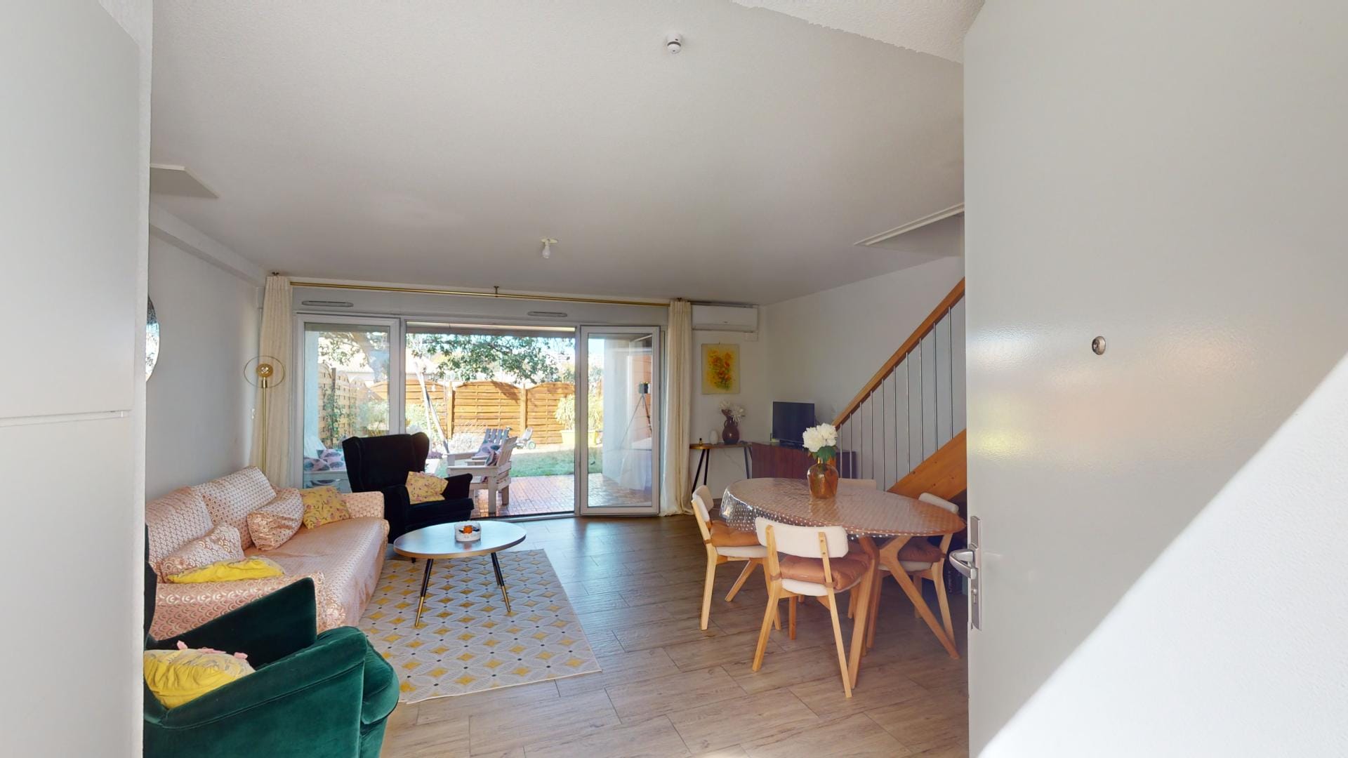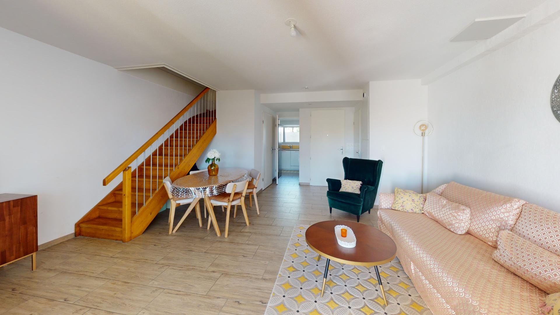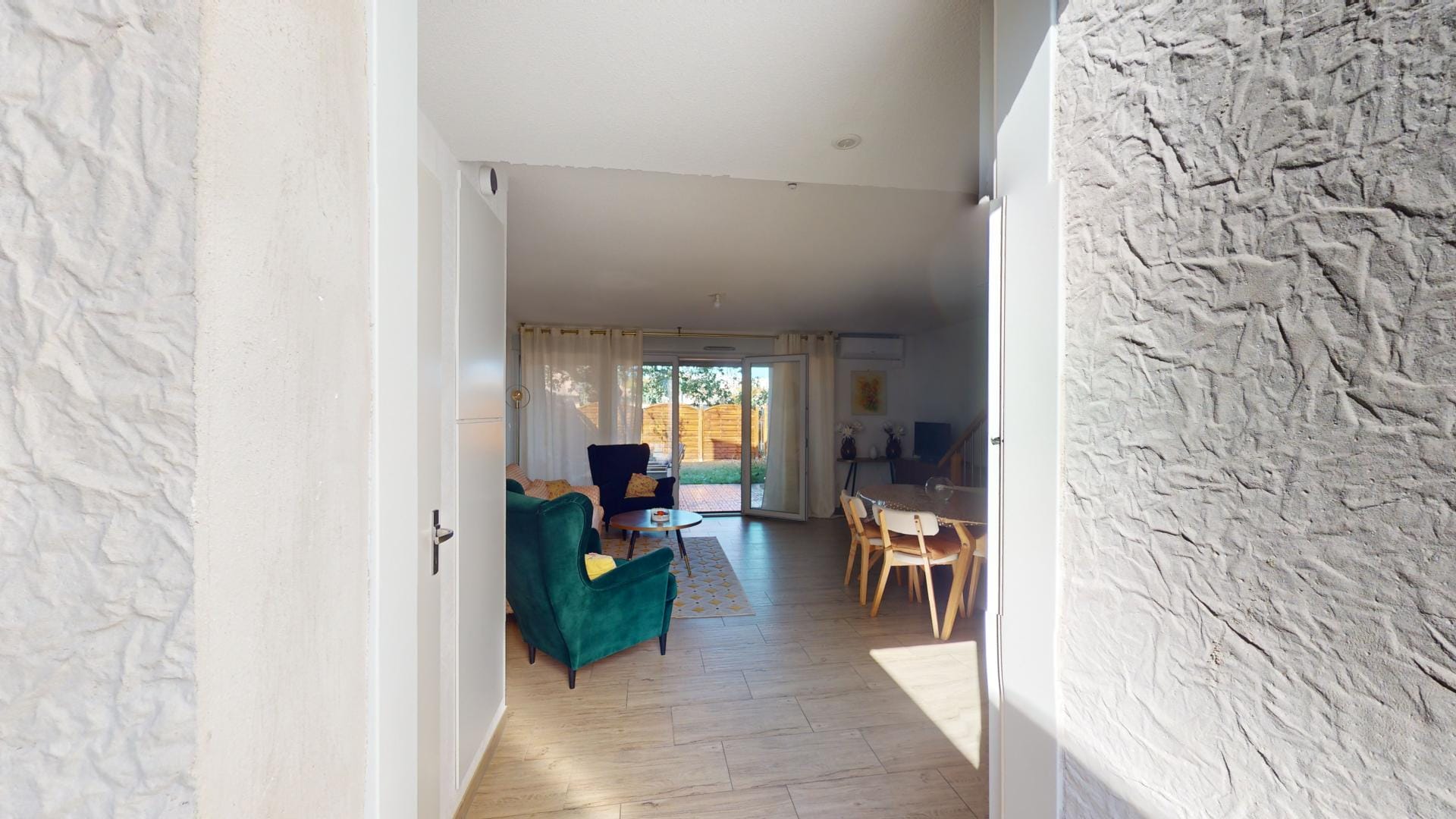 Vue depuis l’espace séjour, à droite l’entrée principale,