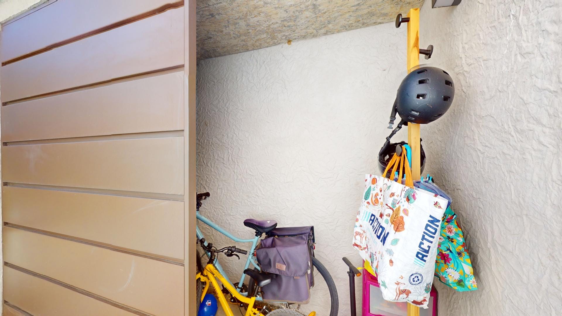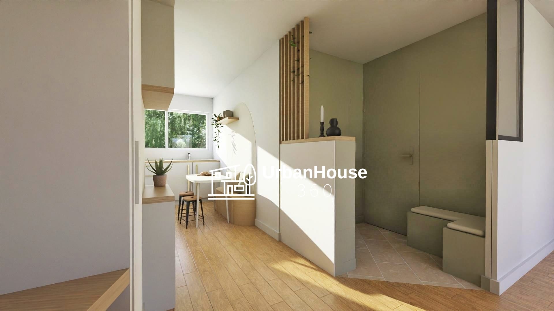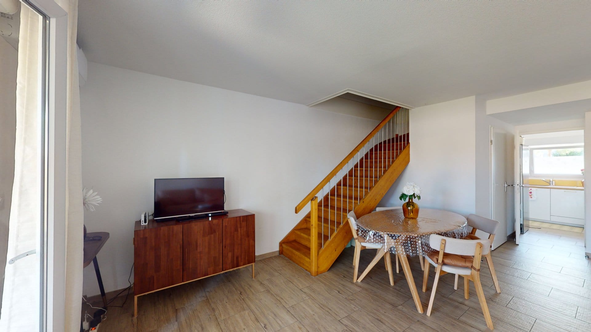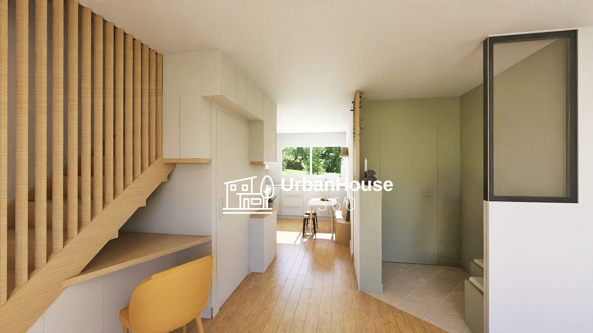 Vue depuis l’espace séjour, à droite l’entrée principale,
