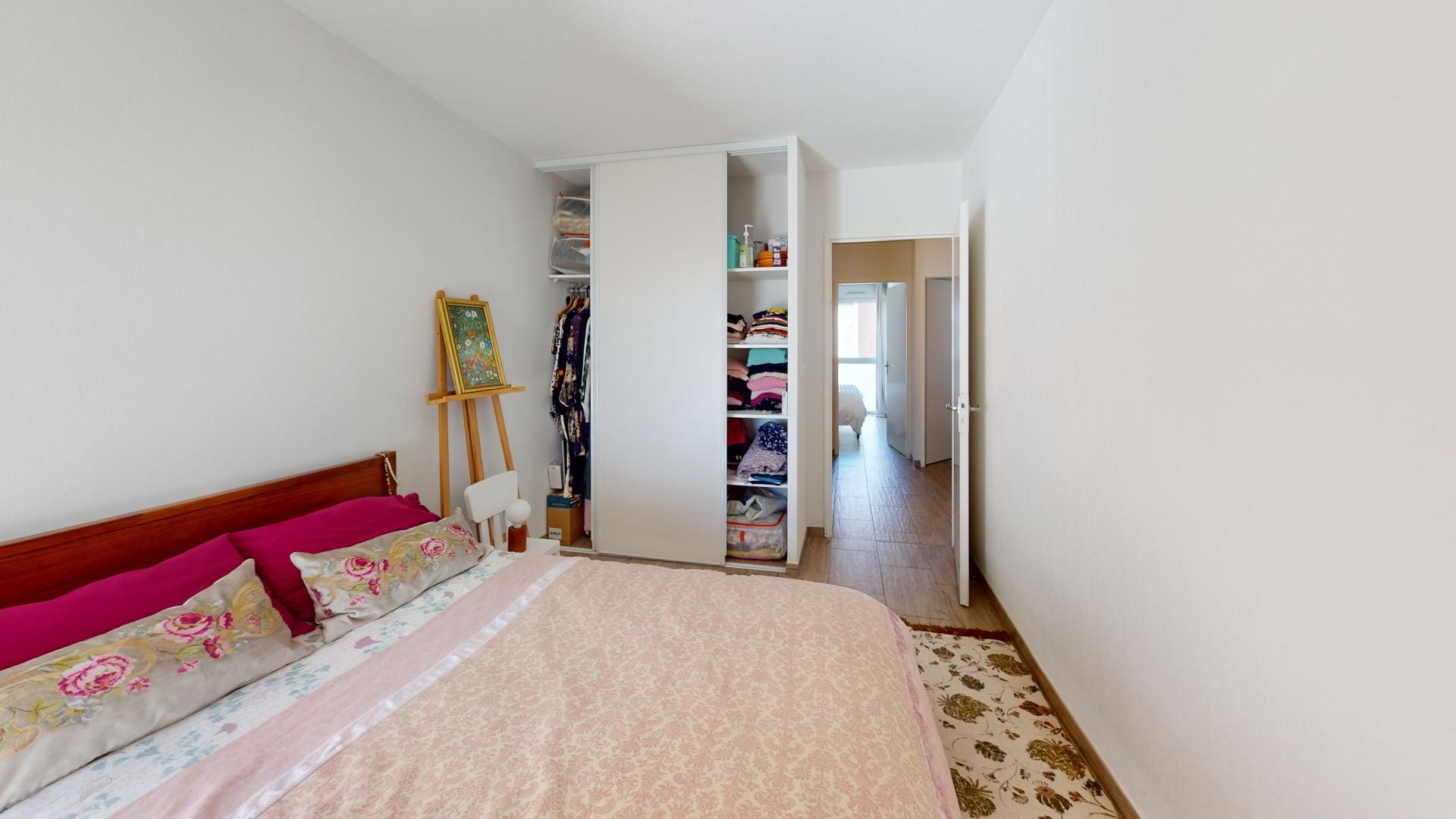 Vue depuis le salon, réaménagement de l’espace WC, avec porte à galandage,