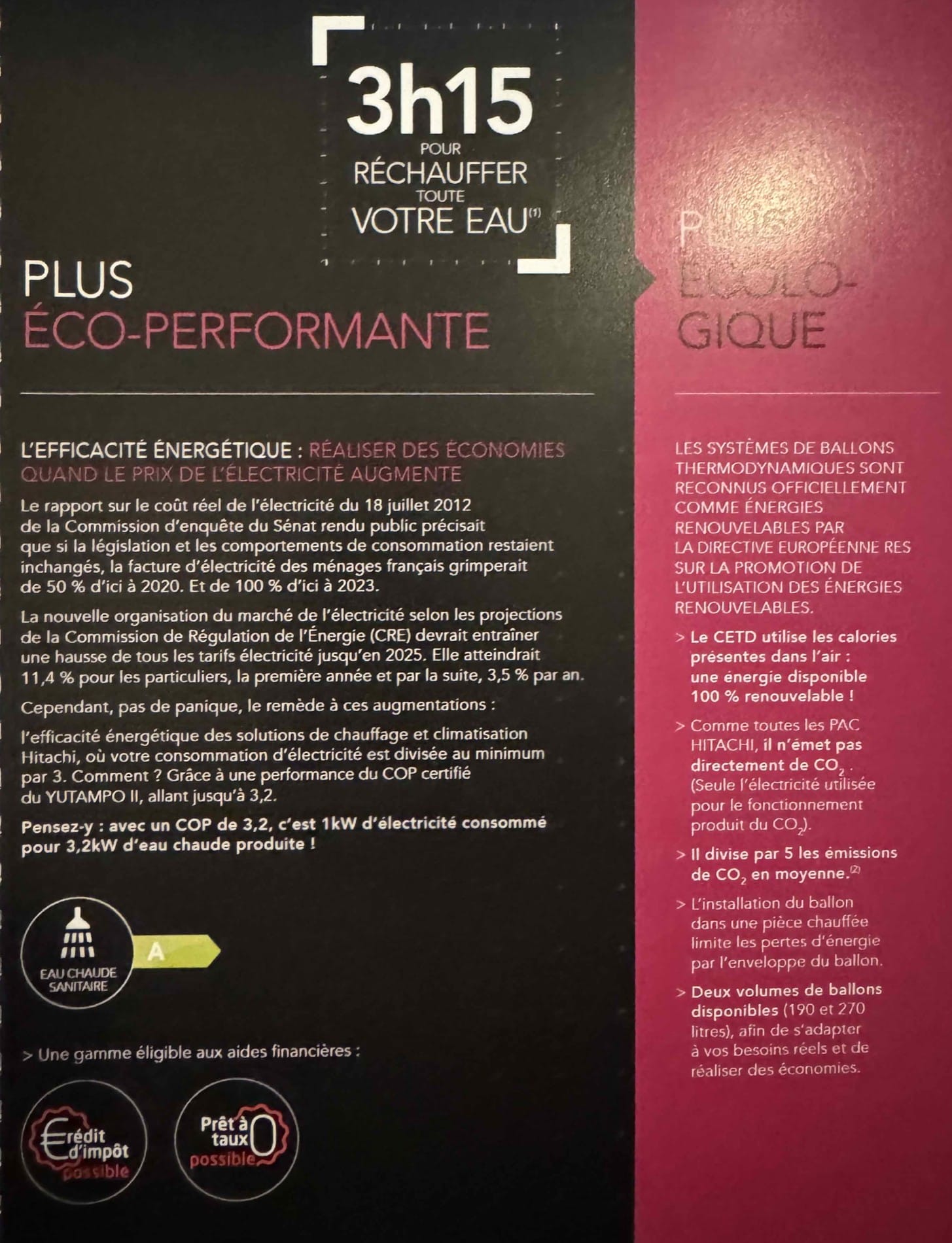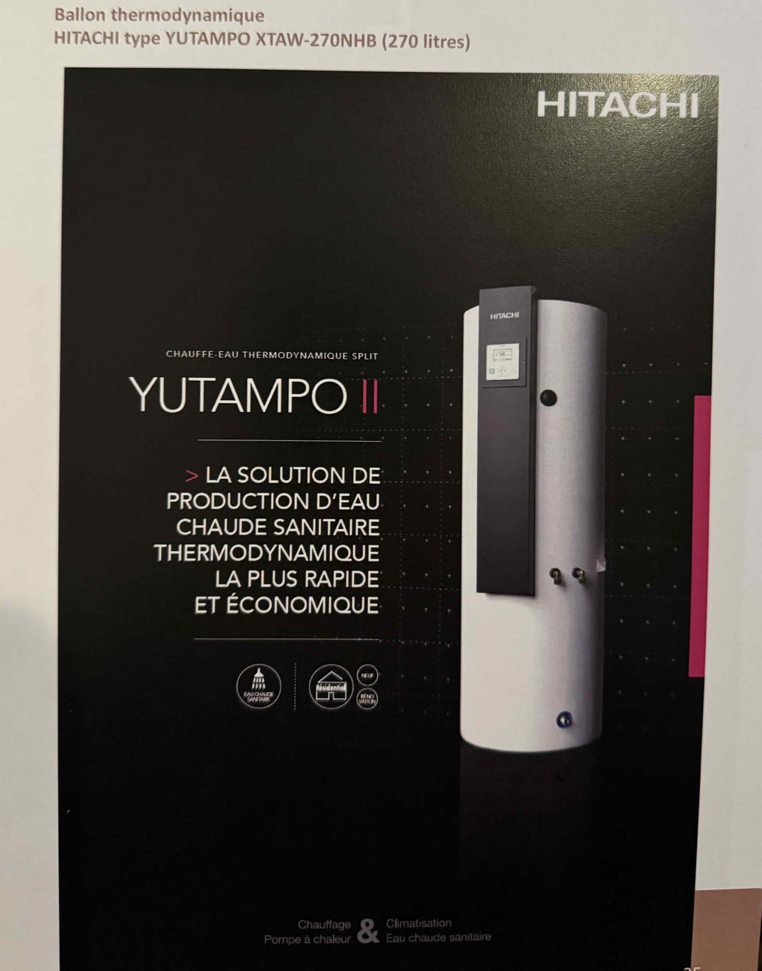 Eau chaude sanitaire : Ballon thermodynamique HITACHI : production d’eau chaude plus rapide, plus économique COP de 3,2 kW d’eau chaude produite, plus de confort.