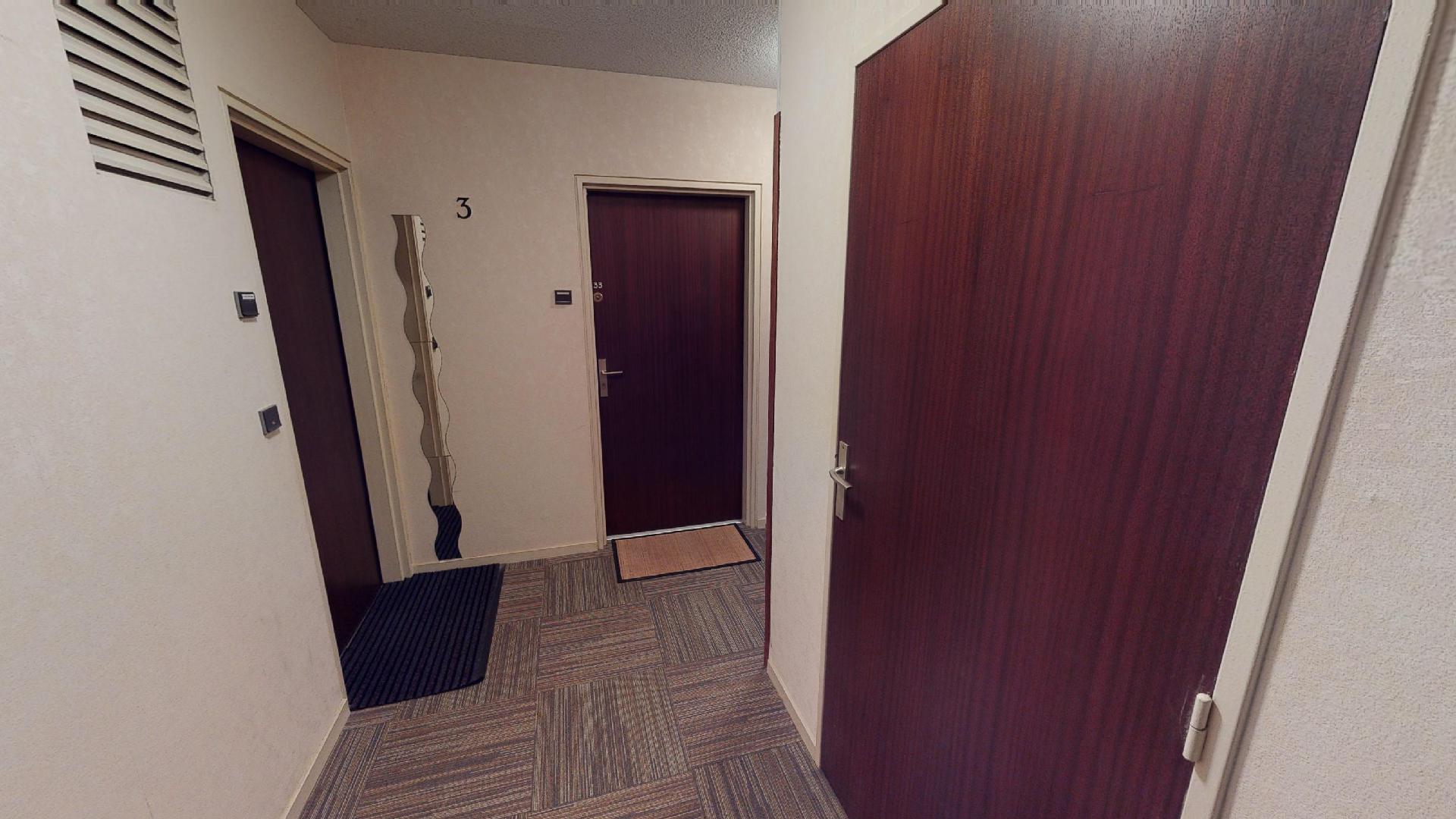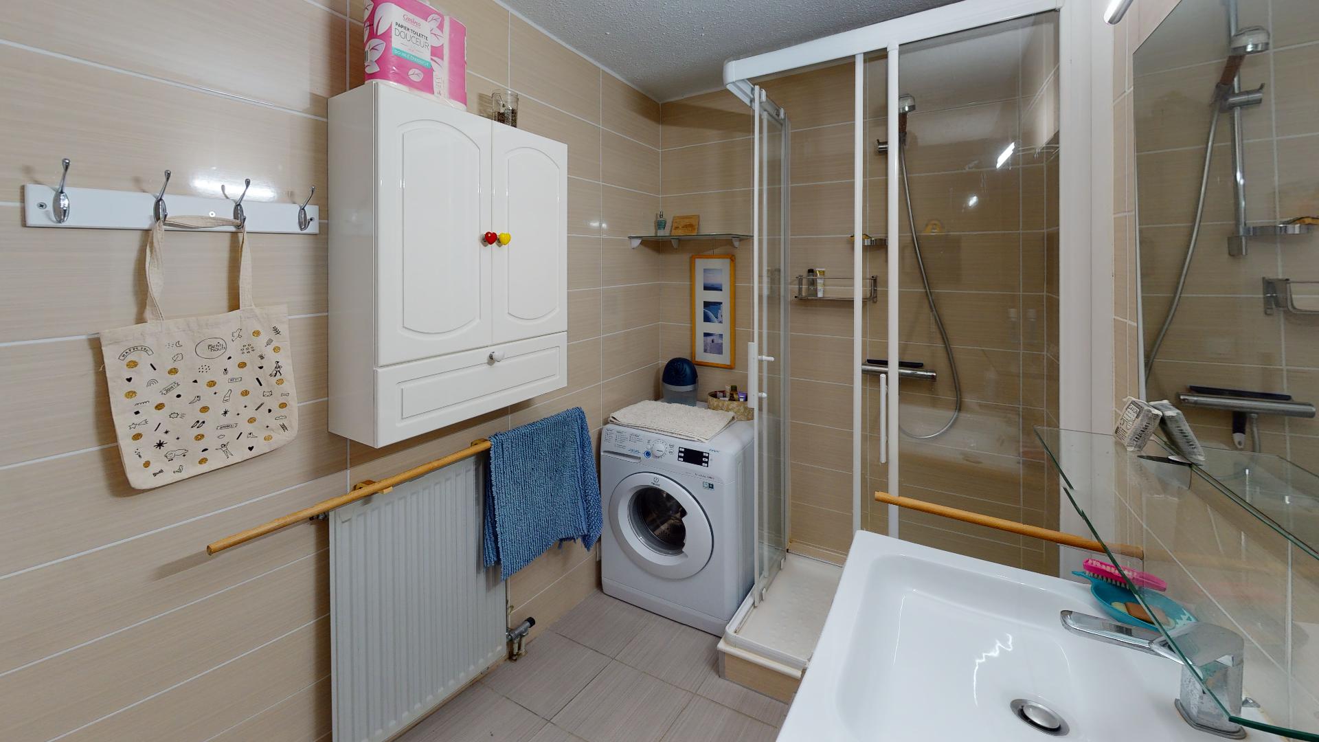 Terrasse donnant sur le séjour par une grande baie vitrée et la cuisine par une porte fenêtre, cuisine avec son espace dédié préparation bien isolé, ouverte sur l’espace de vie du séjour très lumineux, une salle d’eau douche, lave linge, et WC séparée, une petite entrée avec placard aménagé.